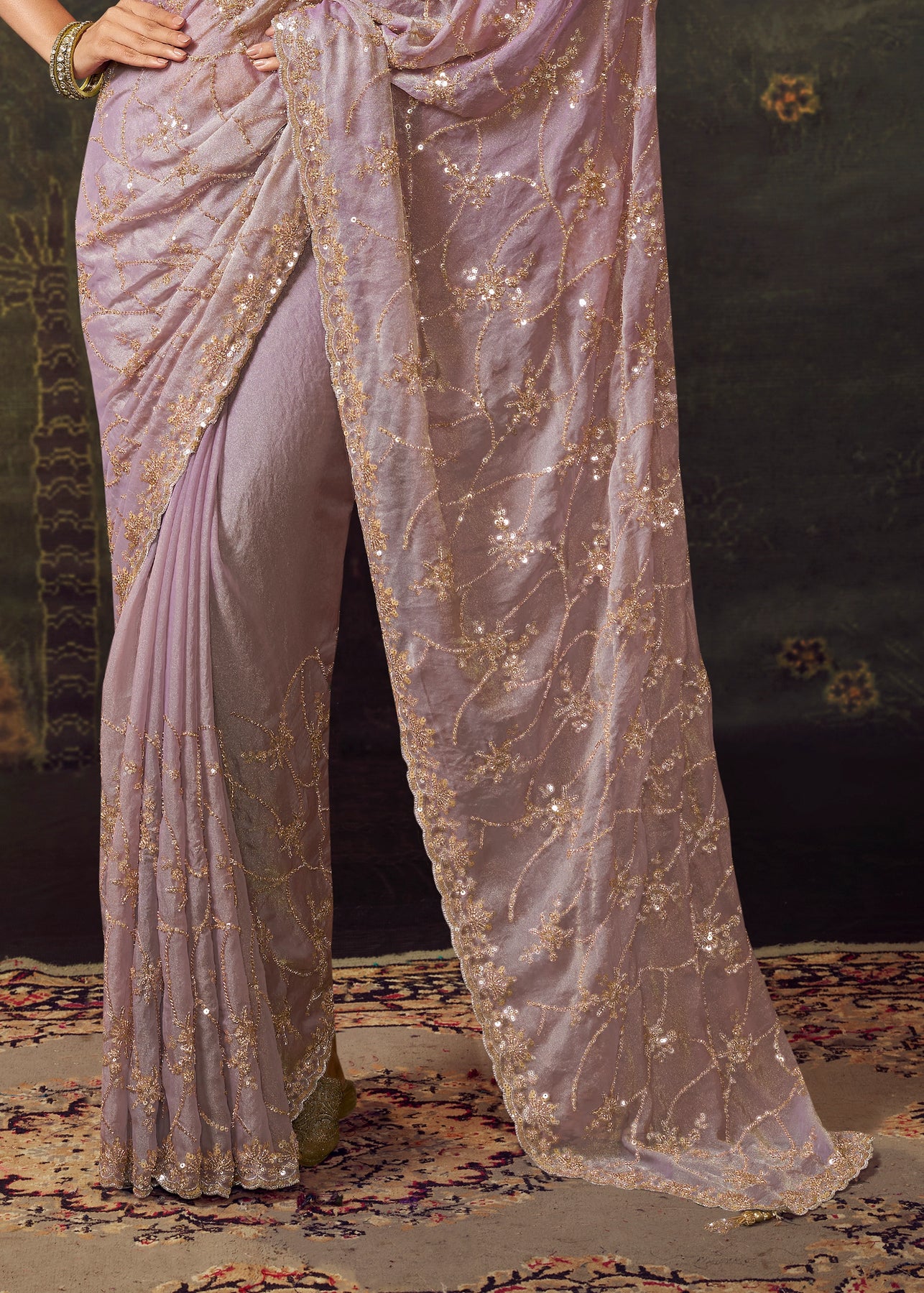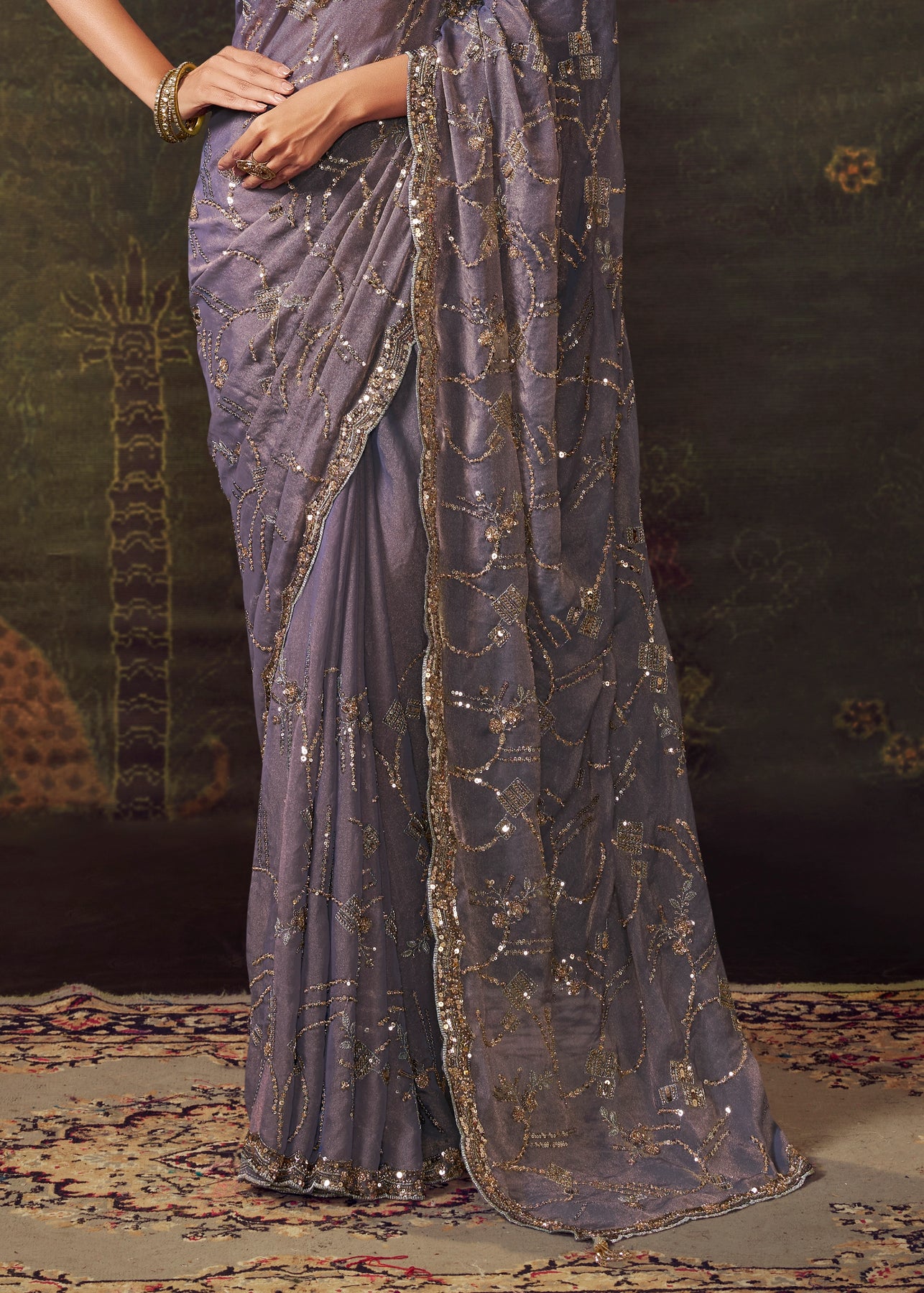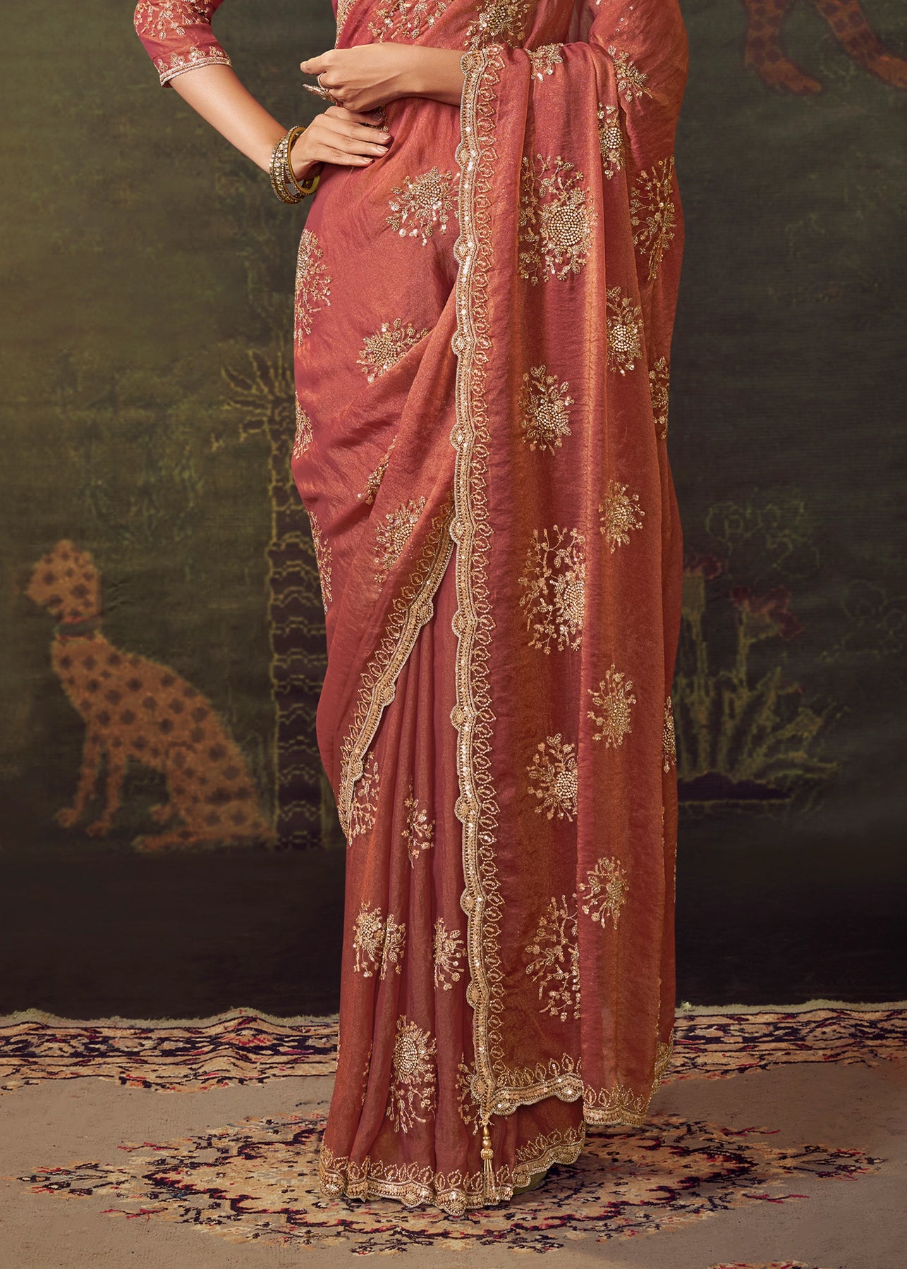 This stunning tissue silk saree features delicate resham and sequin work, exuding warmth and festive radiance. A truly graceful choice for weddings or celebrations, it embodies a timeless and elegant style.