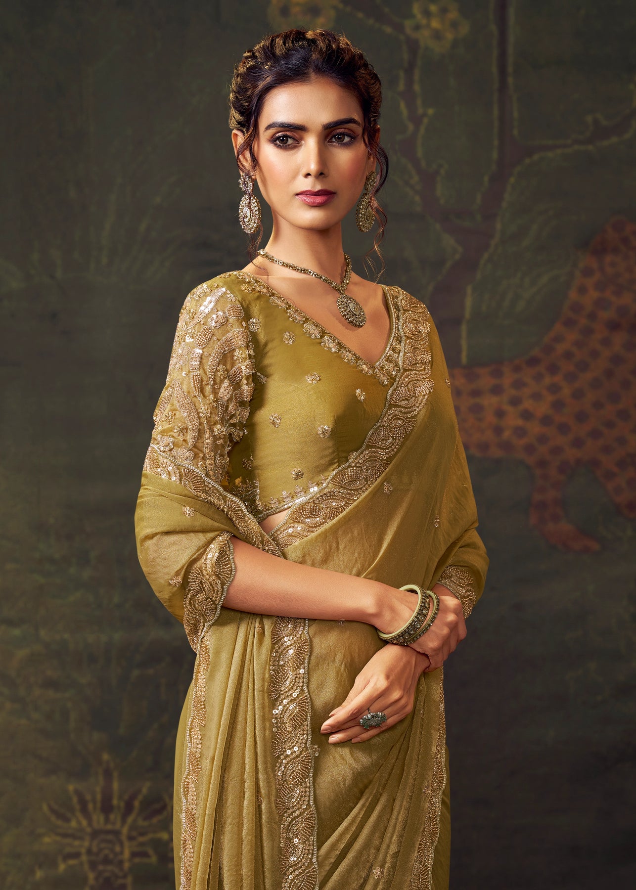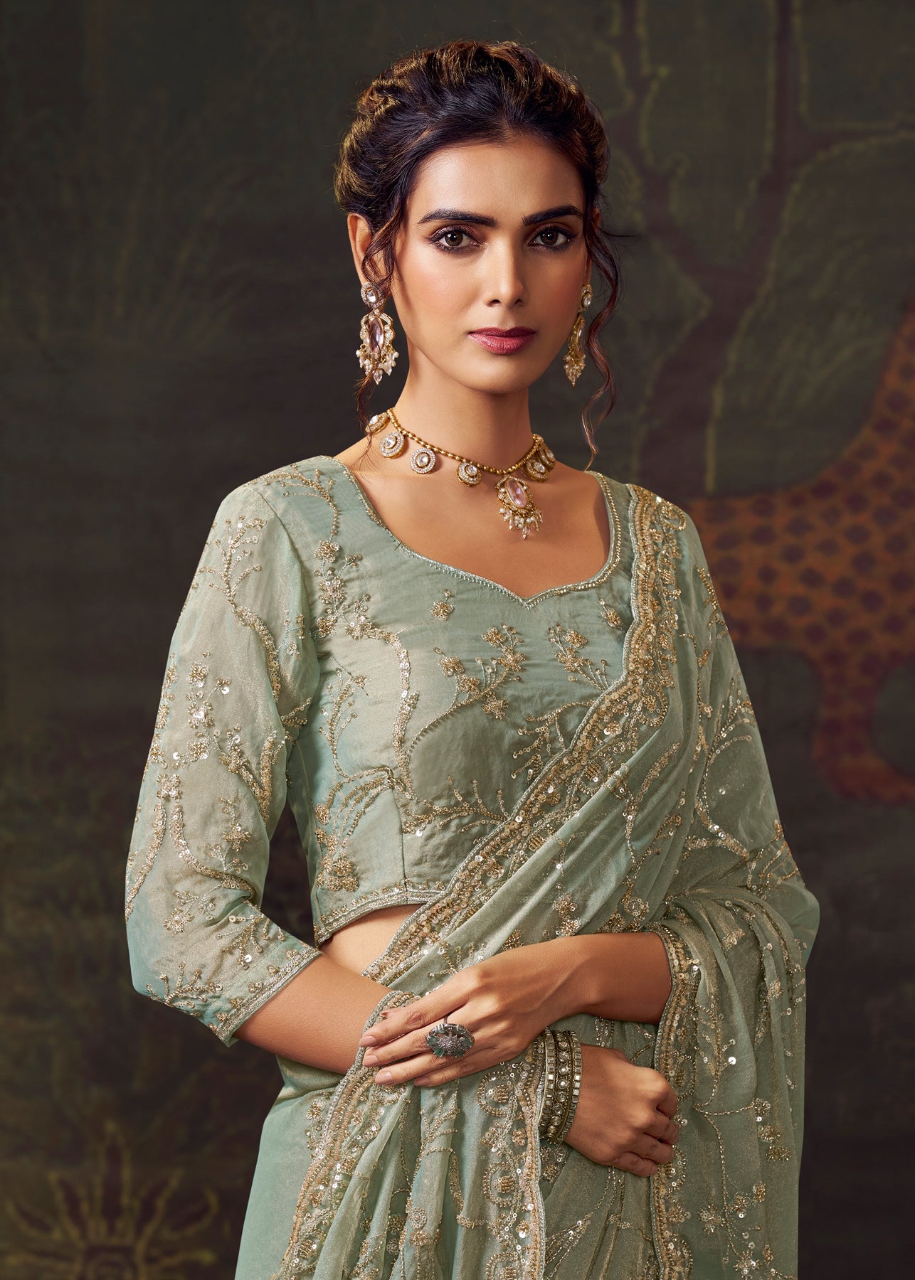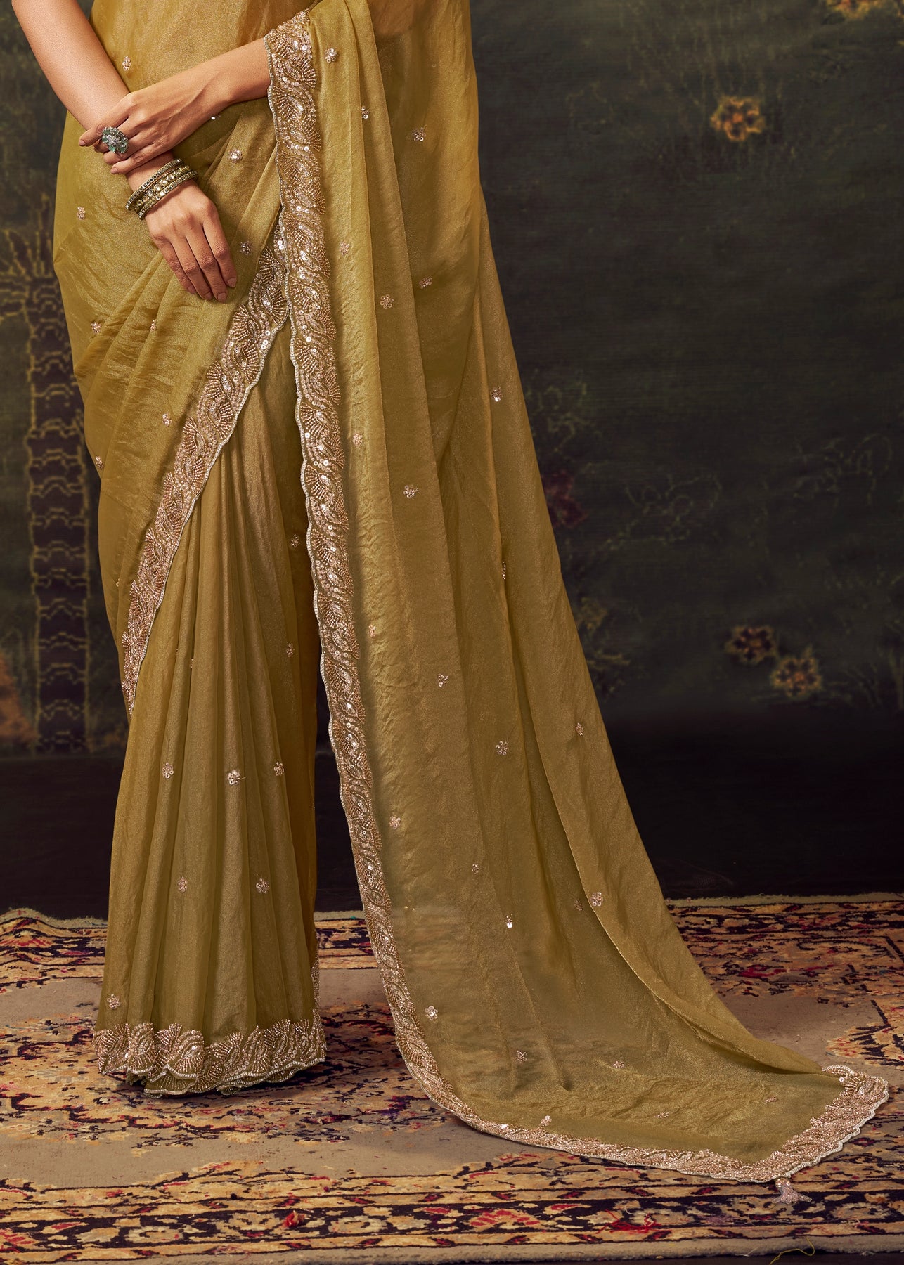 This stunning tissue silk saree features delicate resham and sequin work, exuding warmth and festive radiance. A truly graceful choice for weddings or celebrations, it embodies a timeless and elegant style.