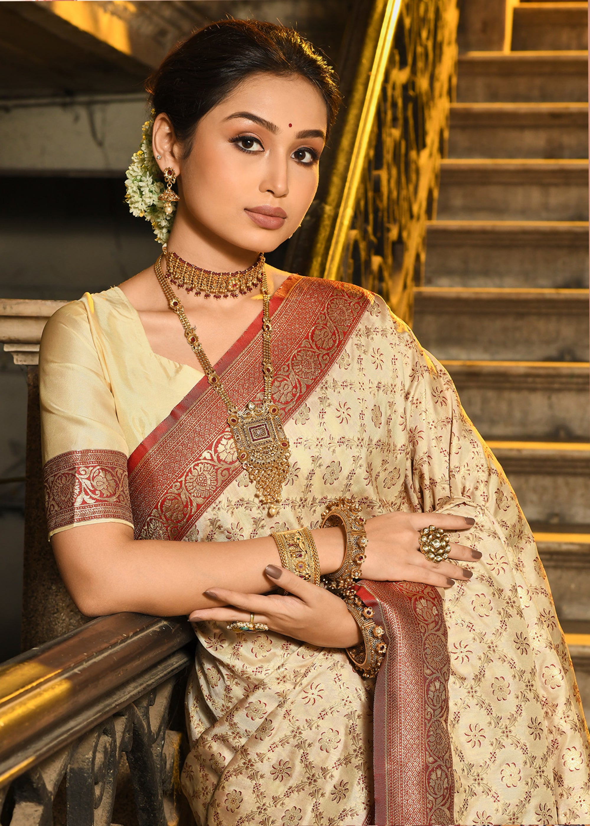 Maroon And Beige Woven Banarasi Brocade Silk Saree With Overall Jaal