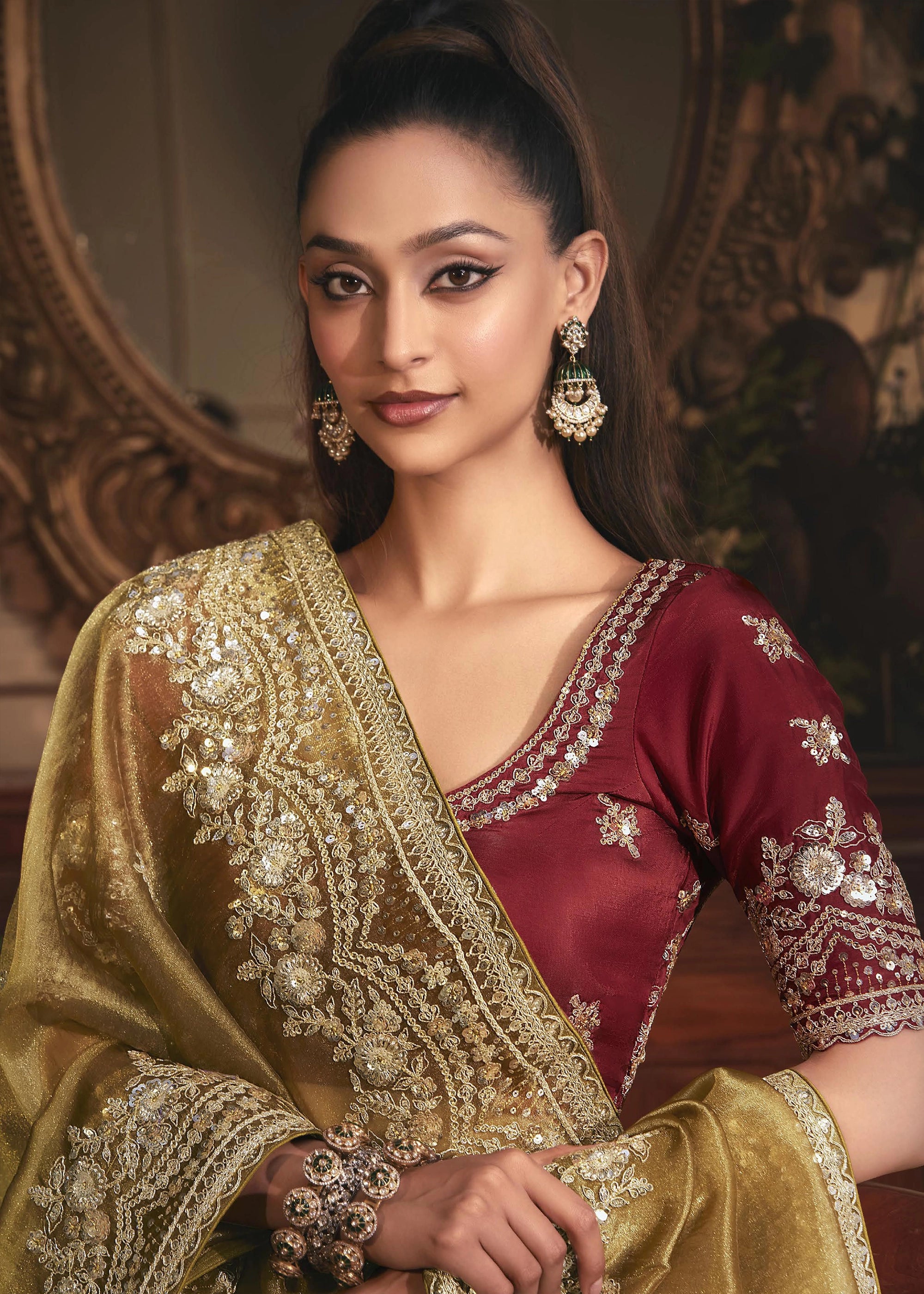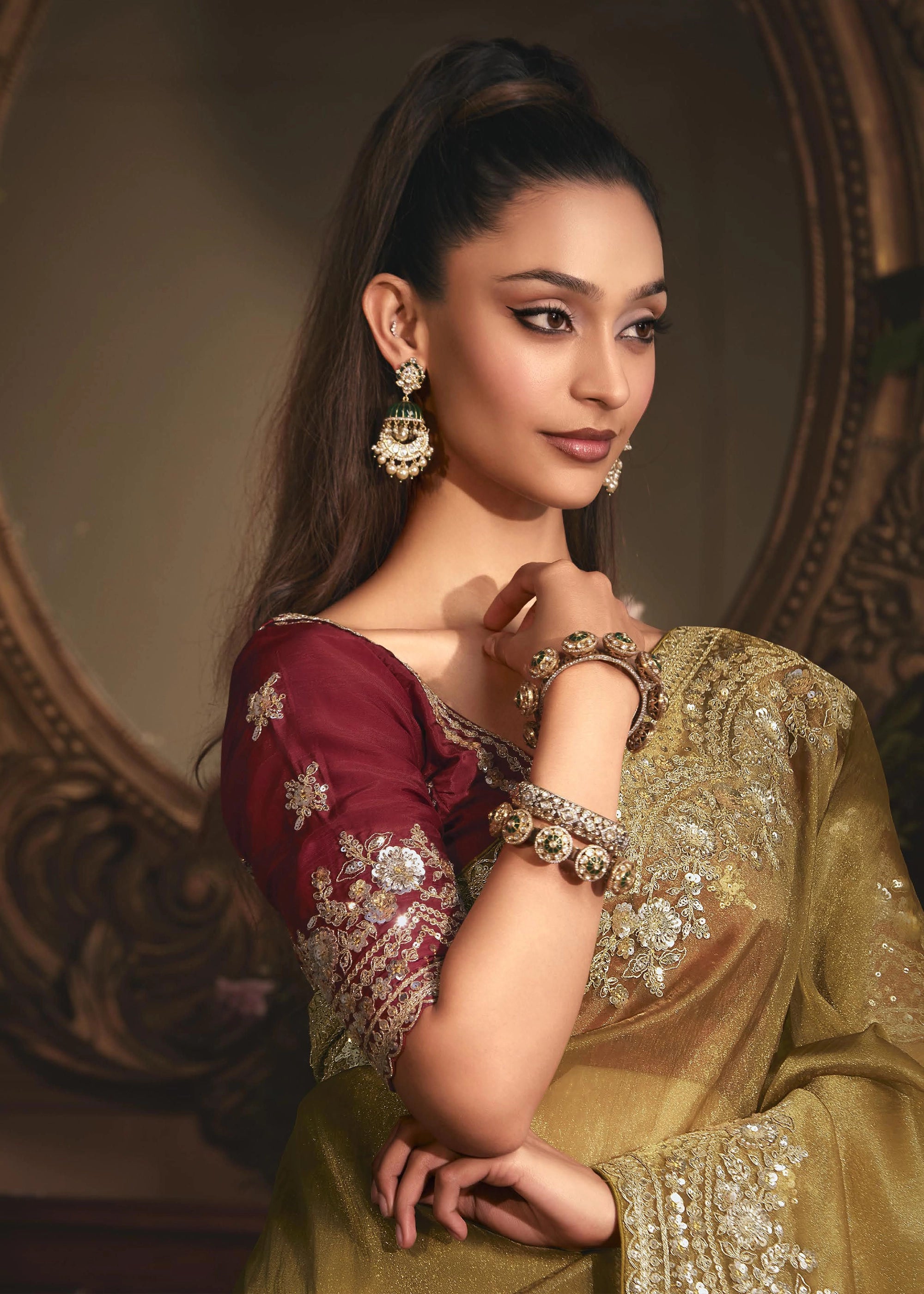 Redefine grace. This Tissue Organza saree's lightweight drape and heavy embroidered stone border offer unforgettable presence. The matching butta stonework blouse is a bold detail, ensuring you make a statement. This is not just a saree—it's art for the woman who owns her style.