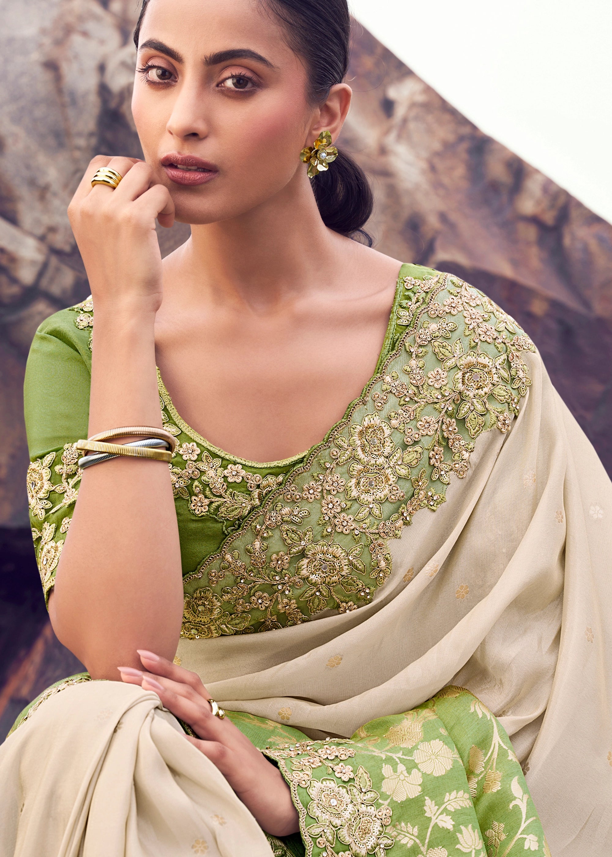 This elegant beige tissue saree features intricate resham embroidery, moti, and sequins work.It has a beautiful green-hued lower half and matching blouse, perfect for special occasions.
