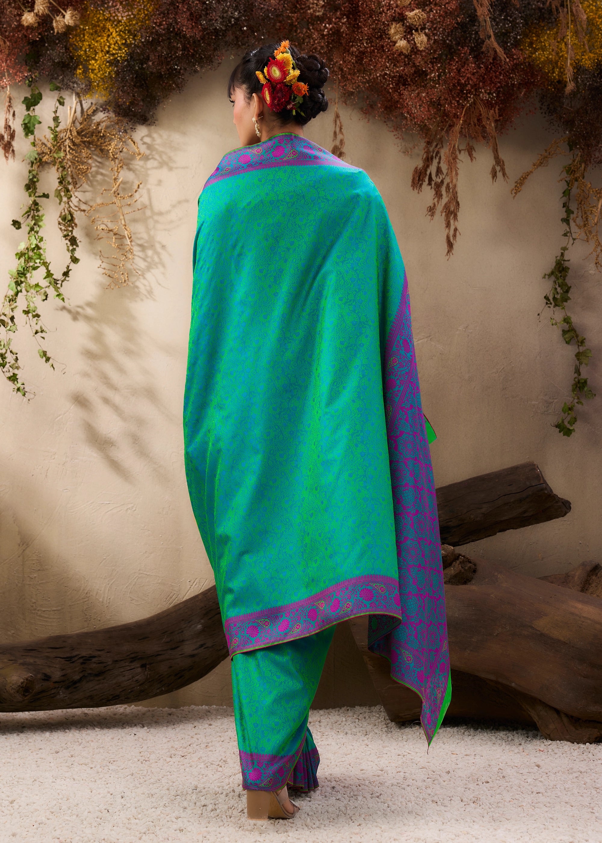 This stunning Kanjivaram silk saree in fiery coral features intricate golden zari work and a rich border and pallu, blending...
