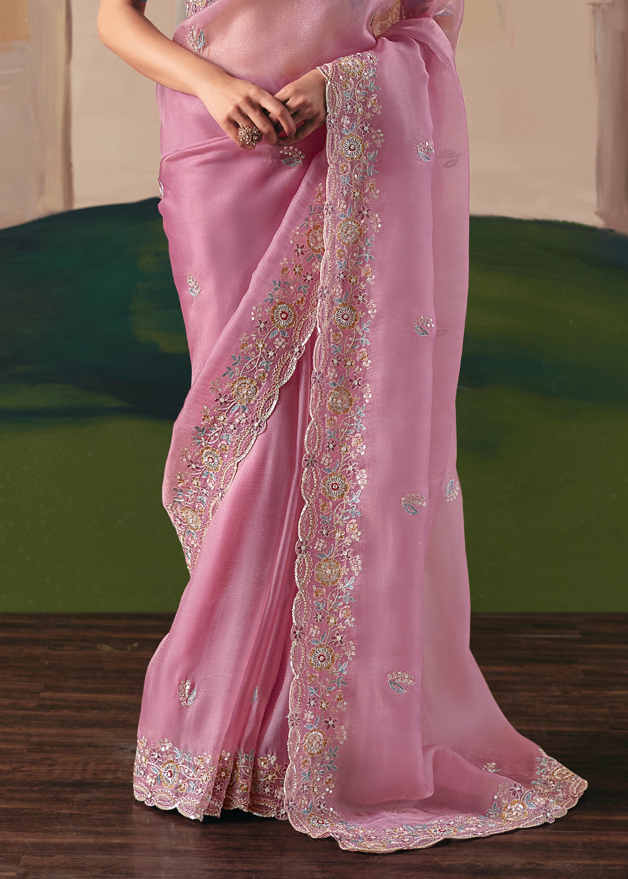 This elegant light pink saree features intricate resham embroidery, sequins, and moti work along the border, paired with a...