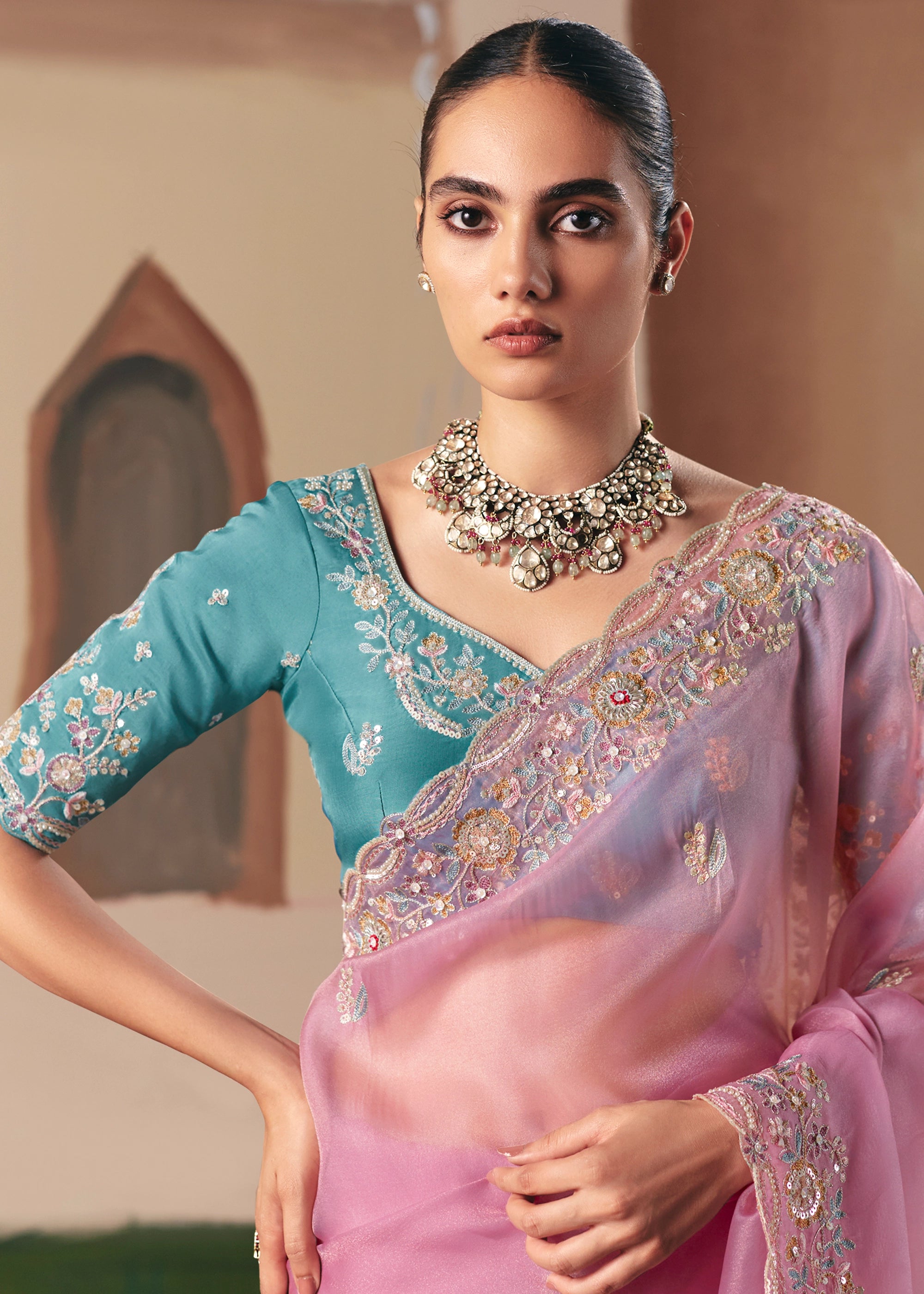 This elegant light pink saree features intricate resham embroidery, sequins, and moti work along the border, paired with a contrasting teal blue art silk blouse. Perfect for festive evenings or weddings, this ensemble brings a youthful and trendy vibe.