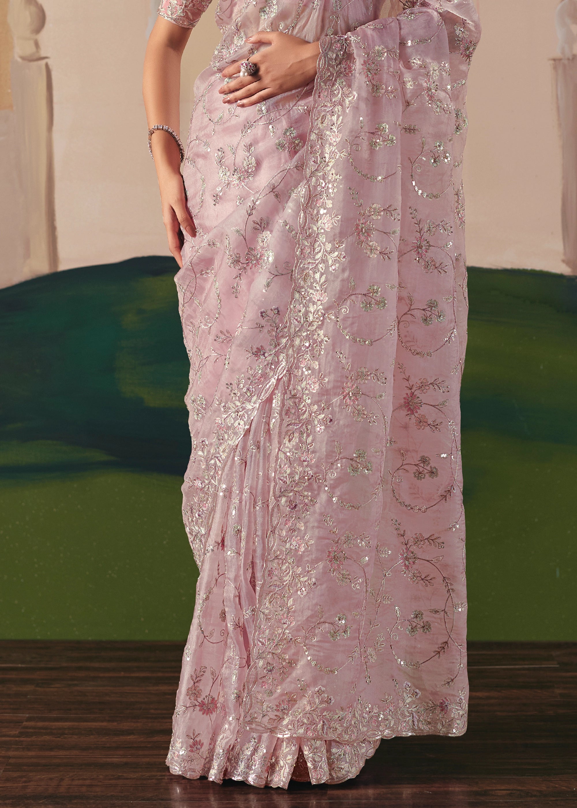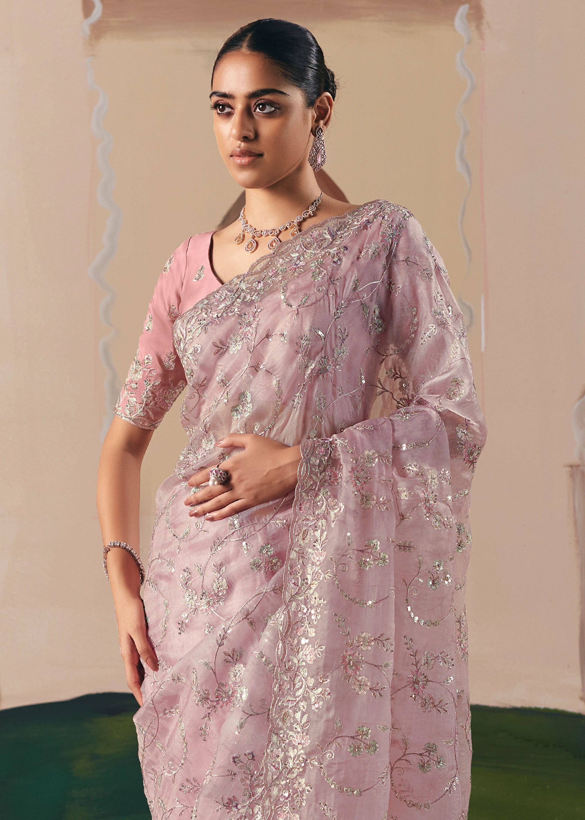 This stunning lilac saree features intricate jaal work, pearl, and latkan embroidery, offering a perfect blend of grace and grandeur. Paired with a matching embroidered blouse, it is a timeless piece for any special occasion.