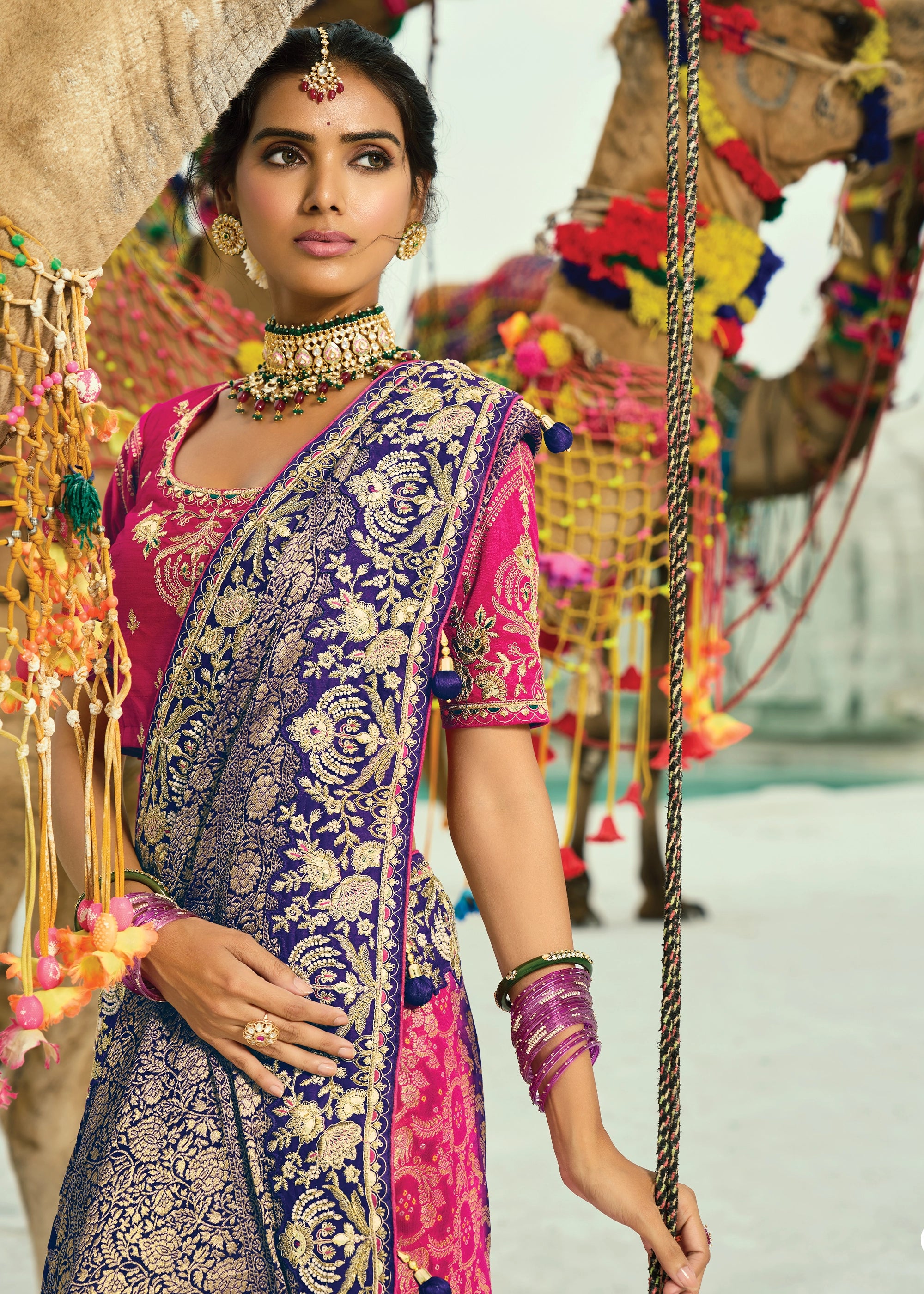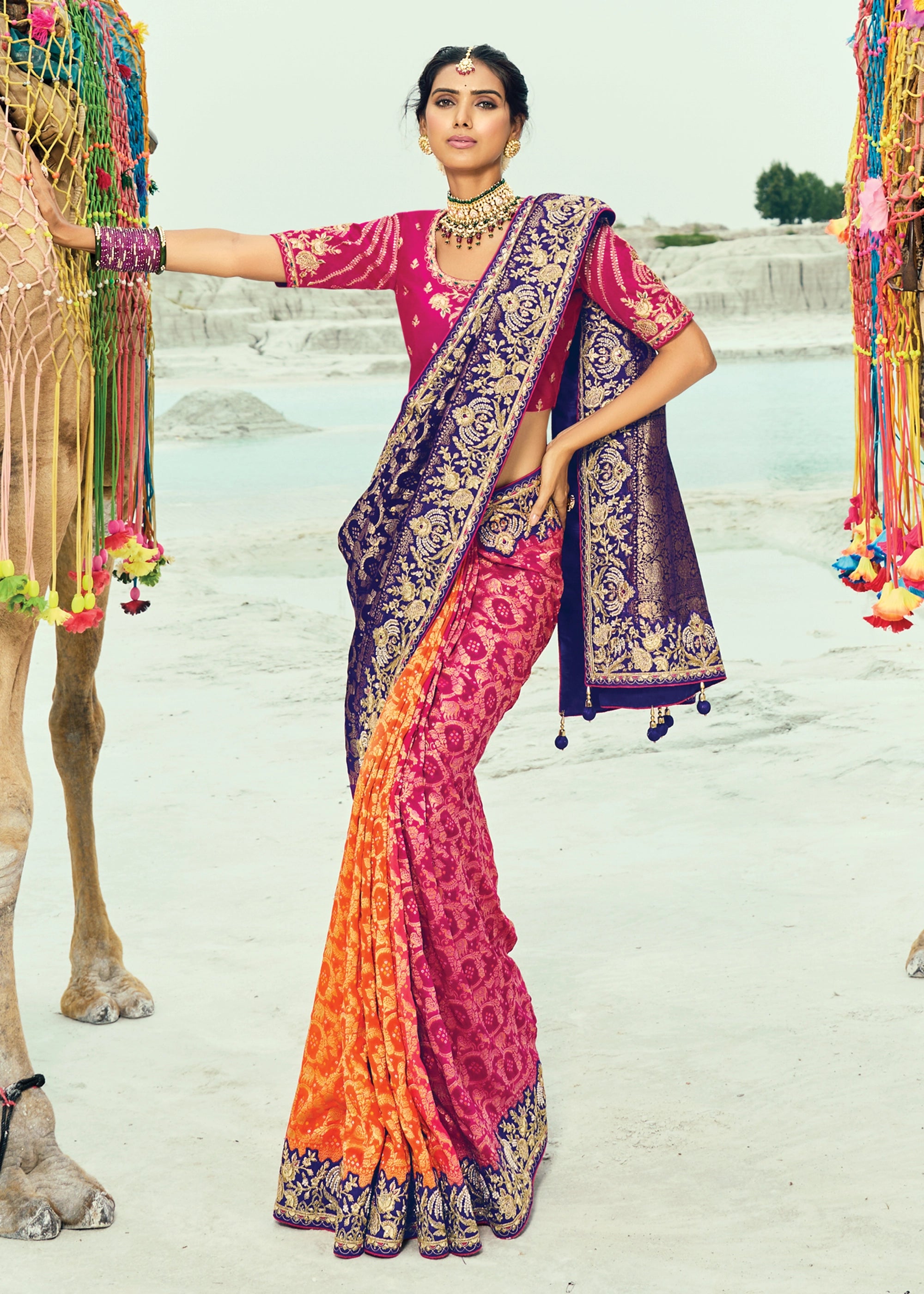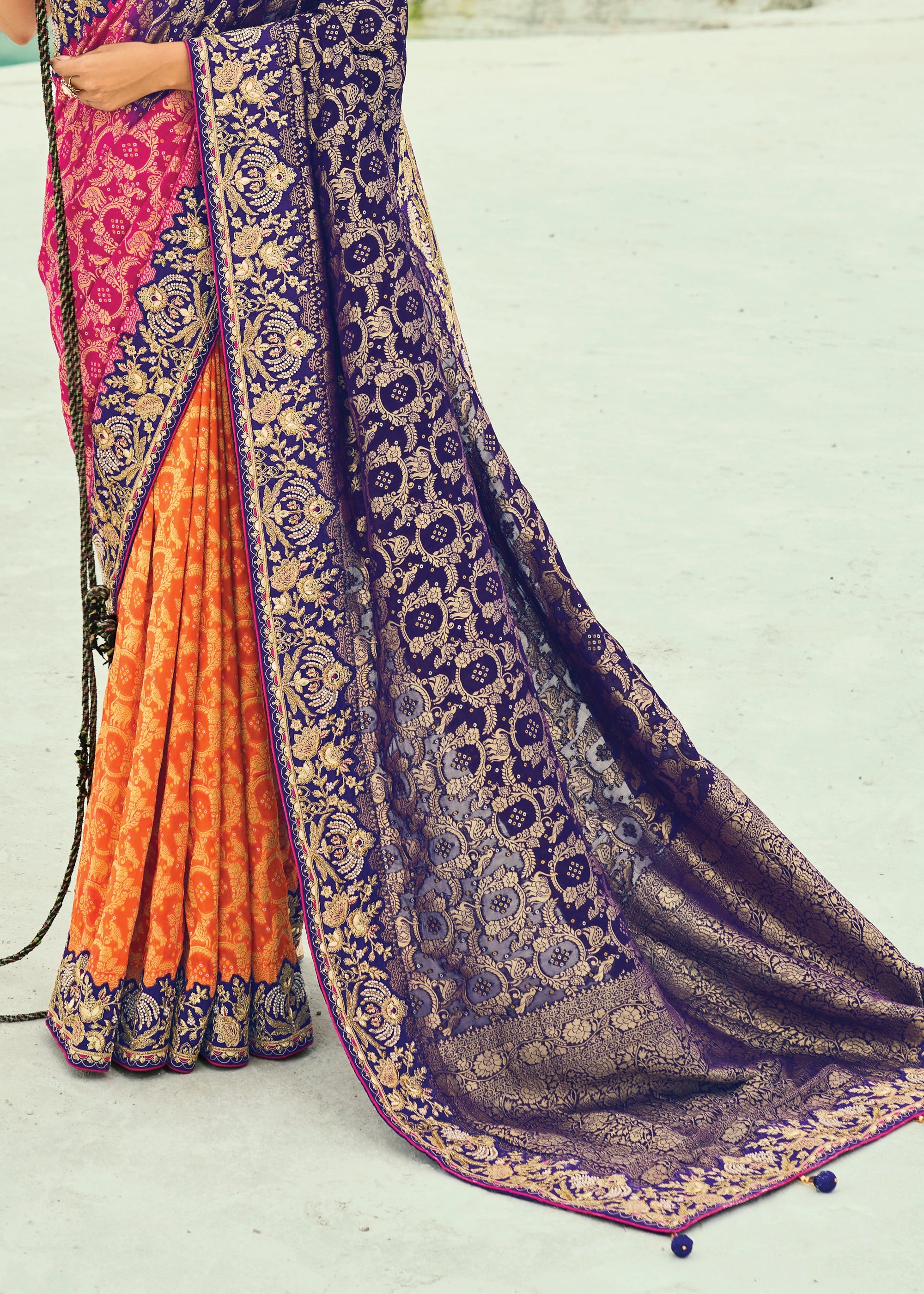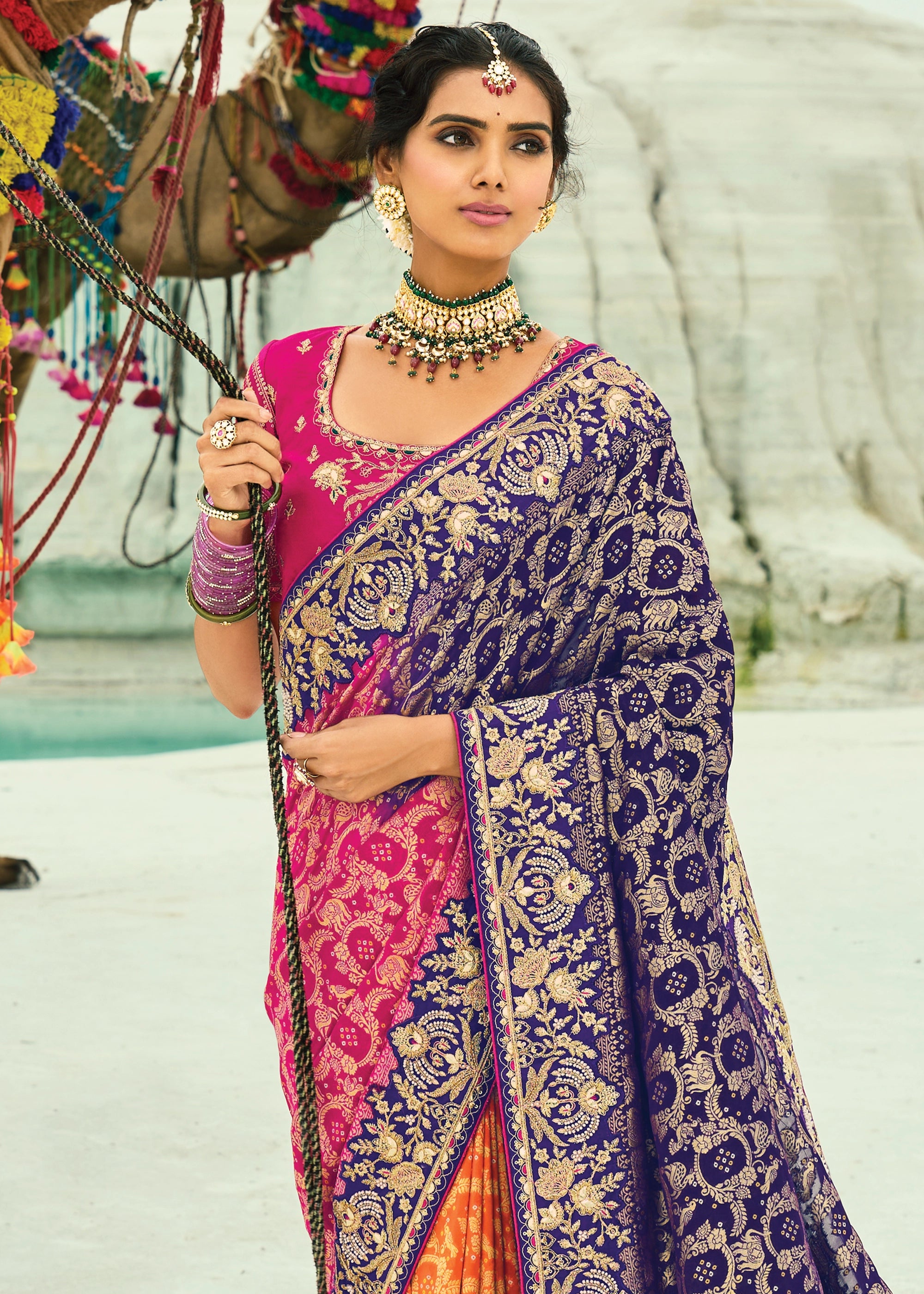 This stunning multicolor designer saree features a vibrant pink and orange body with intricate purple embroidery. Crafted from georgette fabric, it blends traditional bandhej print with elegant zari work.
