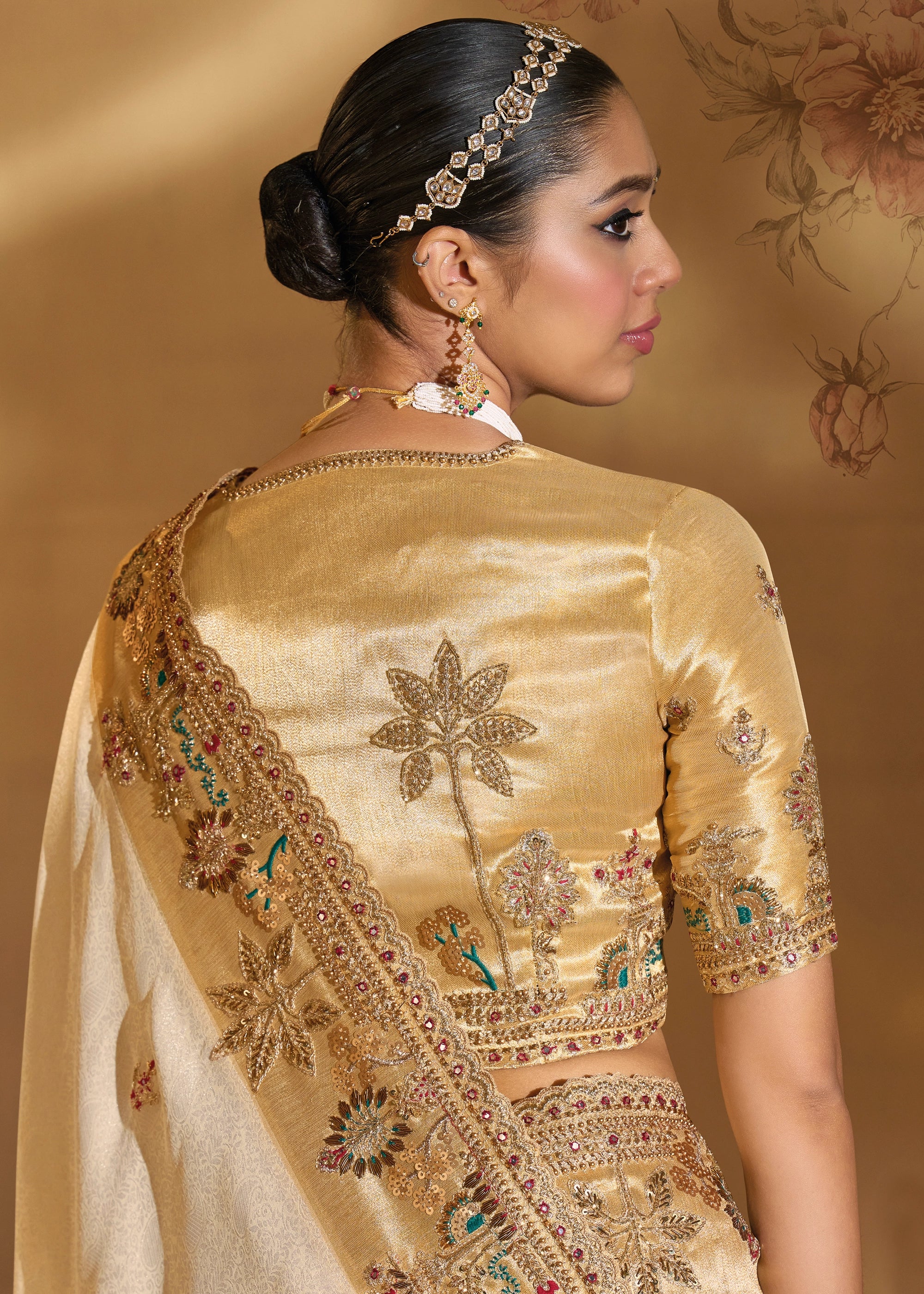 This luxurious Cream Soft Silk Saree is adorned with heavy, intricate work. Featuring dazzling Mirror, Cut-Dana, Moti (pearl), and Jardoshi embellishments, it’s a truly radiant piece for any celebration.