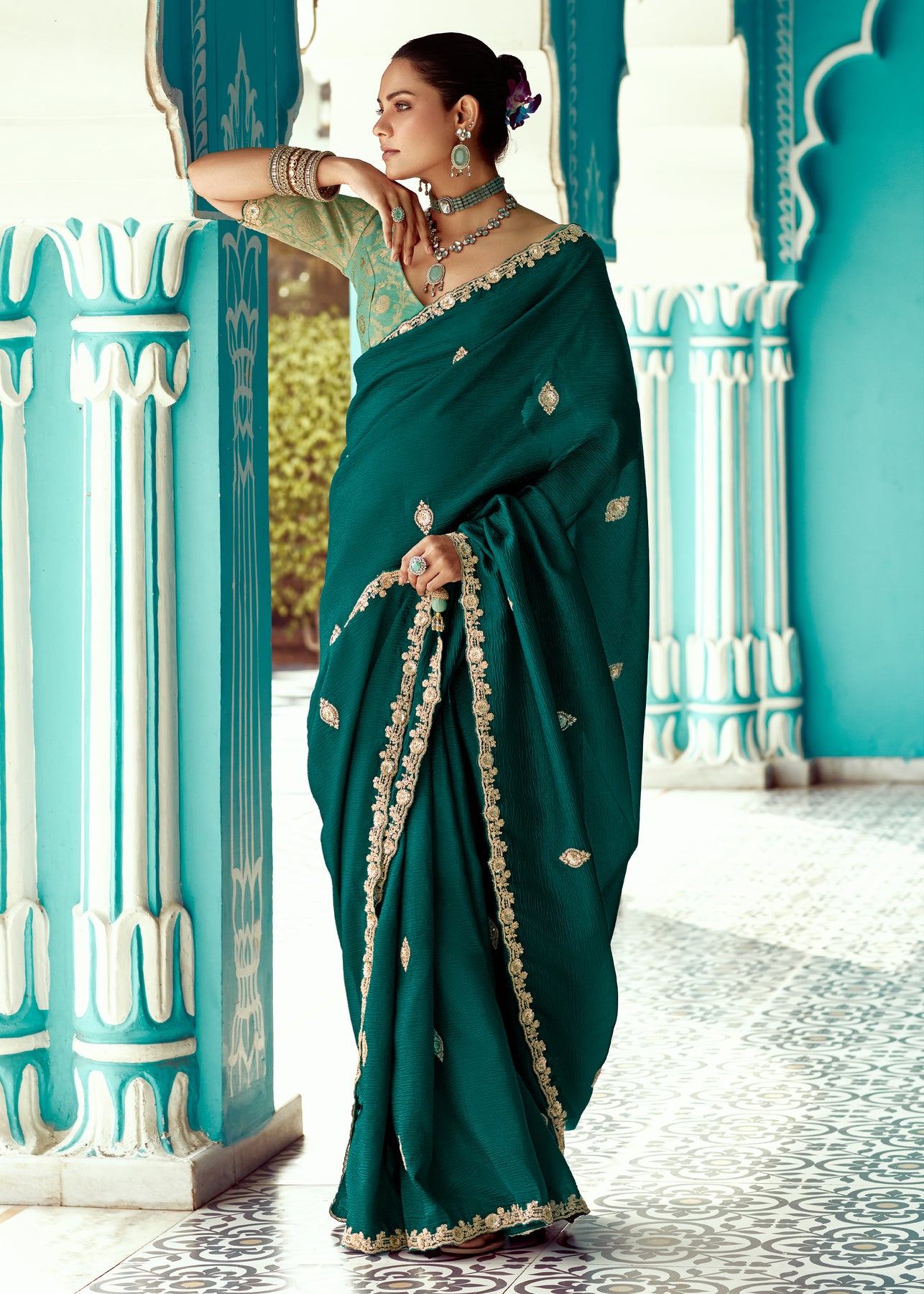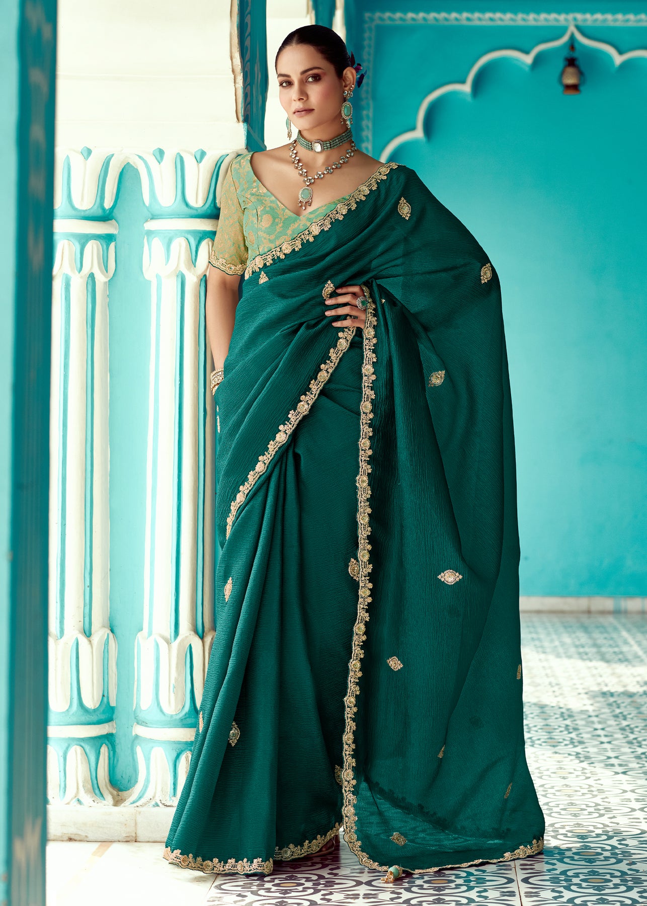 Enhance with a beautiful pattern, the vintage design enhances the royal look of the saree. Made with an intricate technique, this is a heritage of its own kind. With a rich border enveloping the saree, it is a stellar style statement.