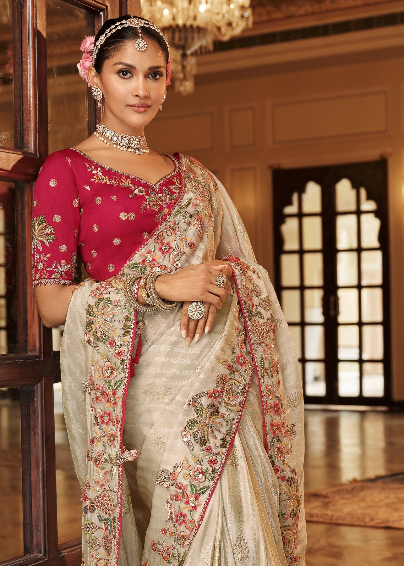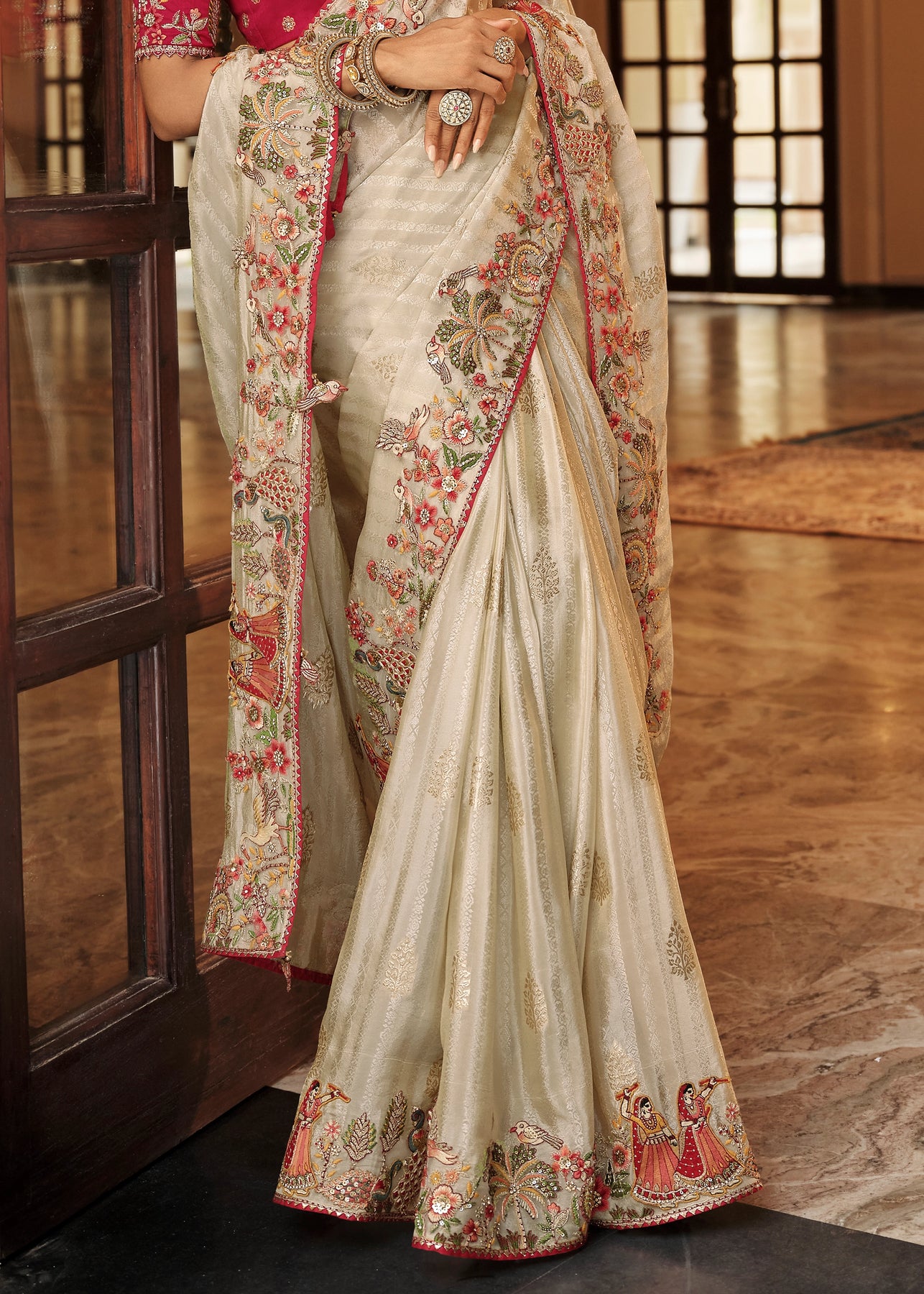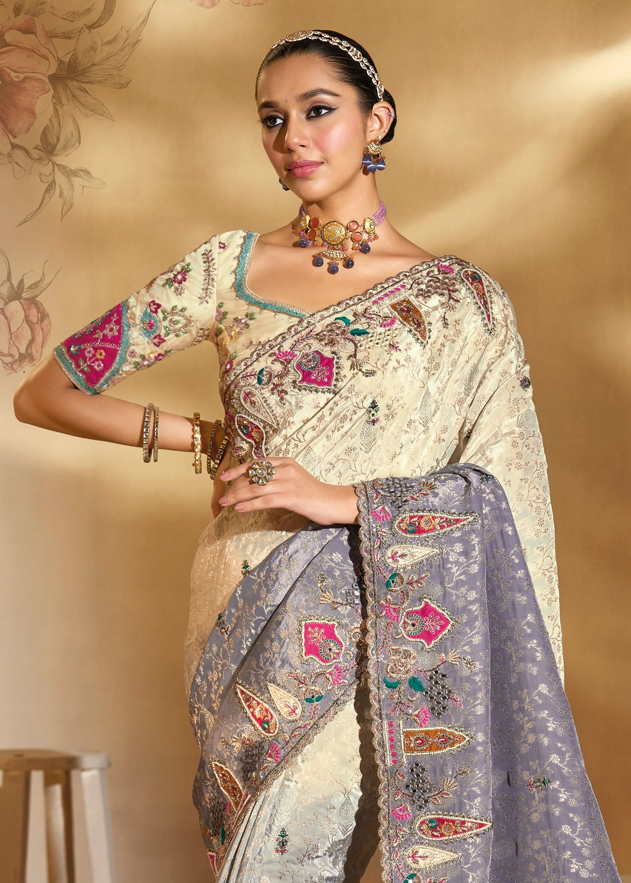 Elegant Cream & Grey Designer Embroidered Crape Silk Saree