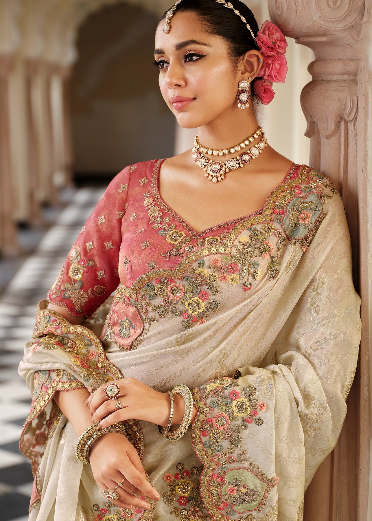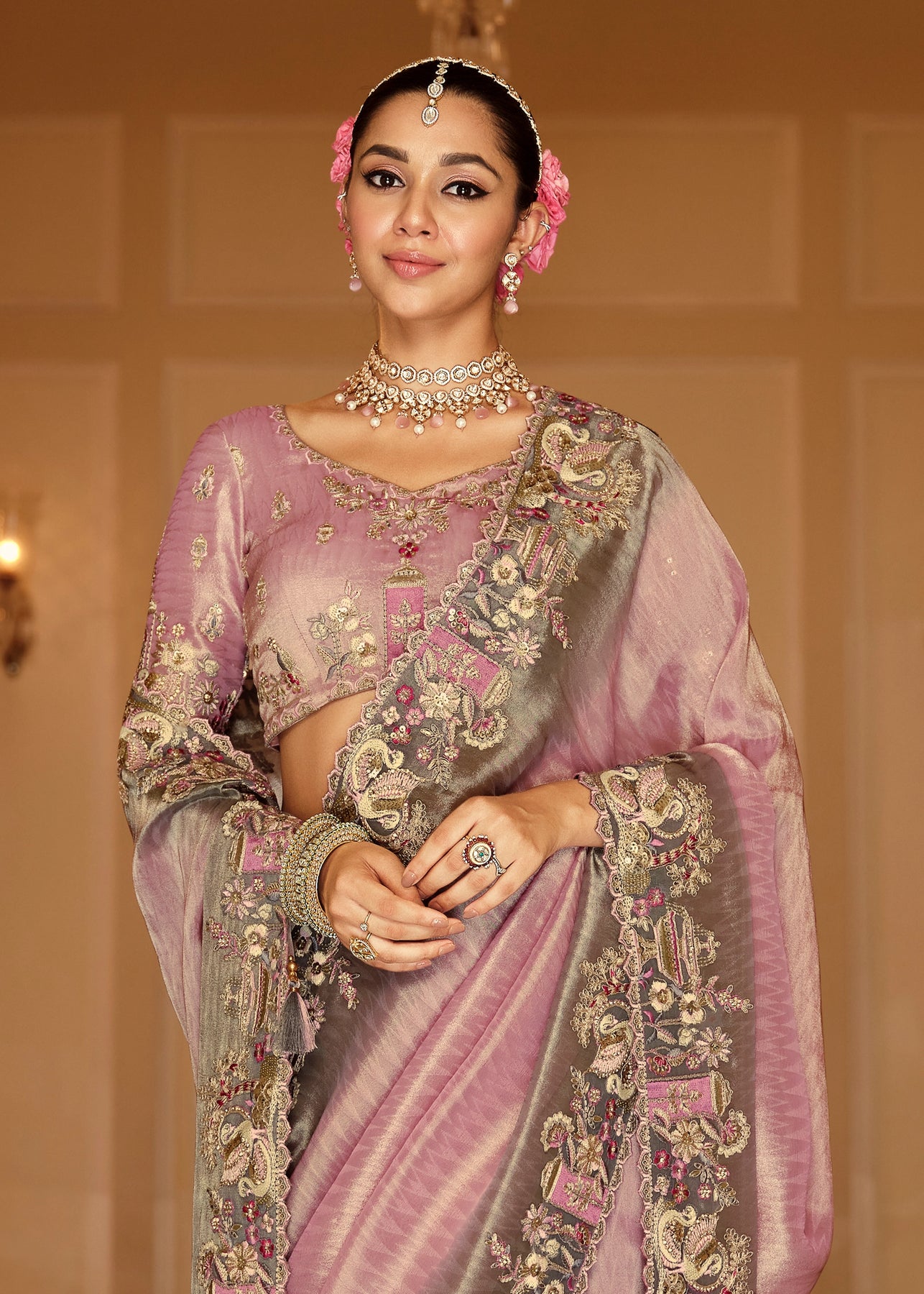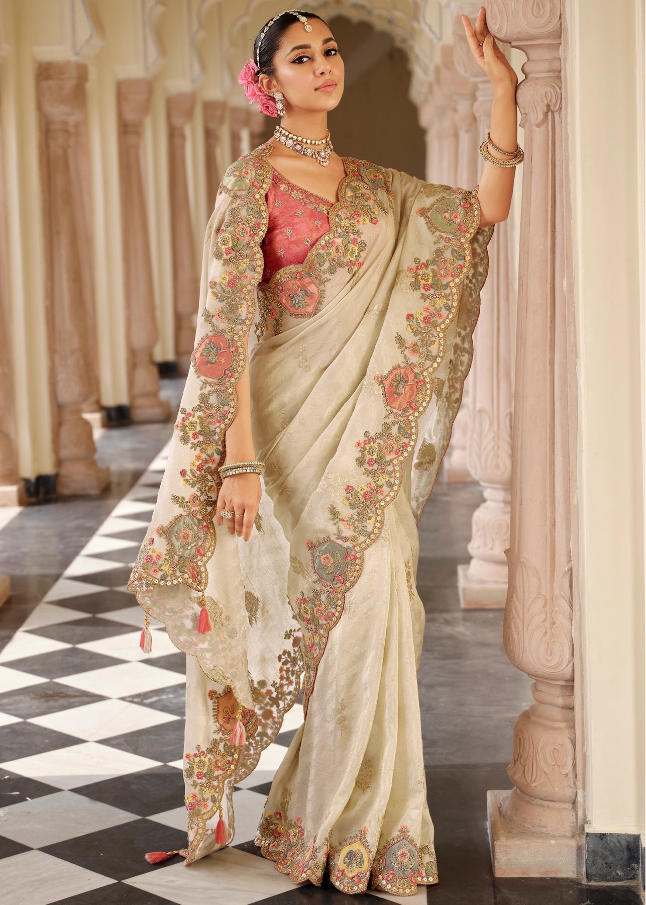 Elegant Cream & Grey Designer Embroidered Crape Silk Saree