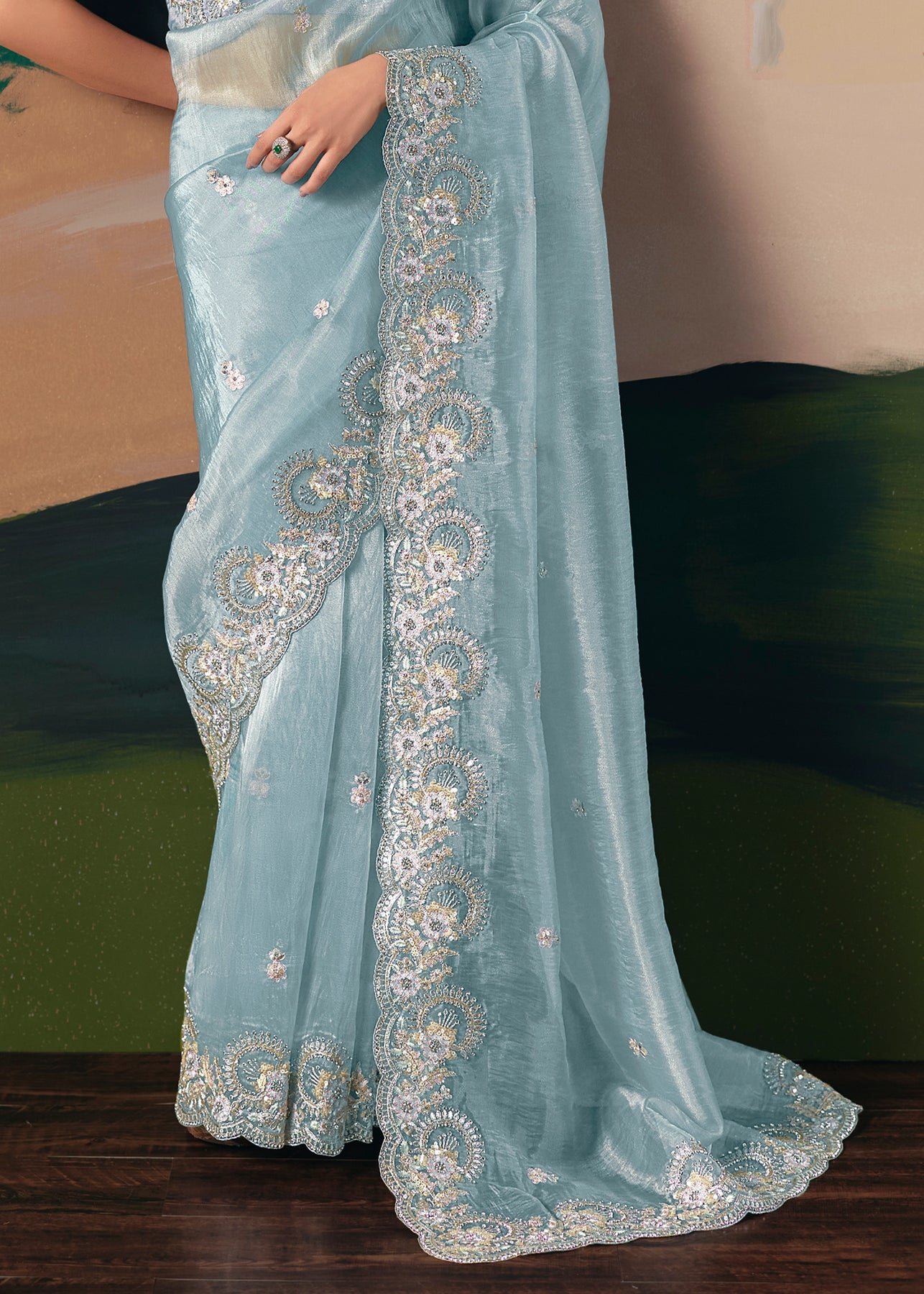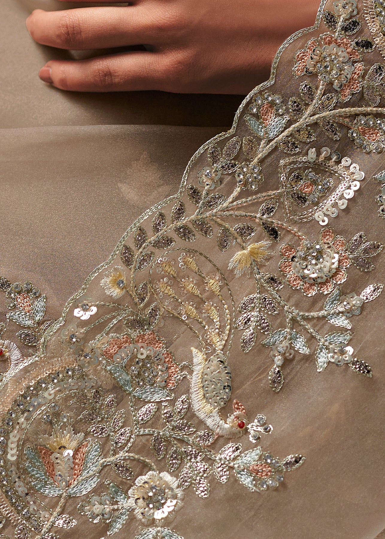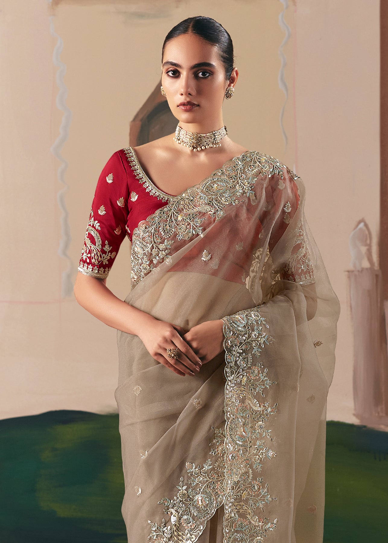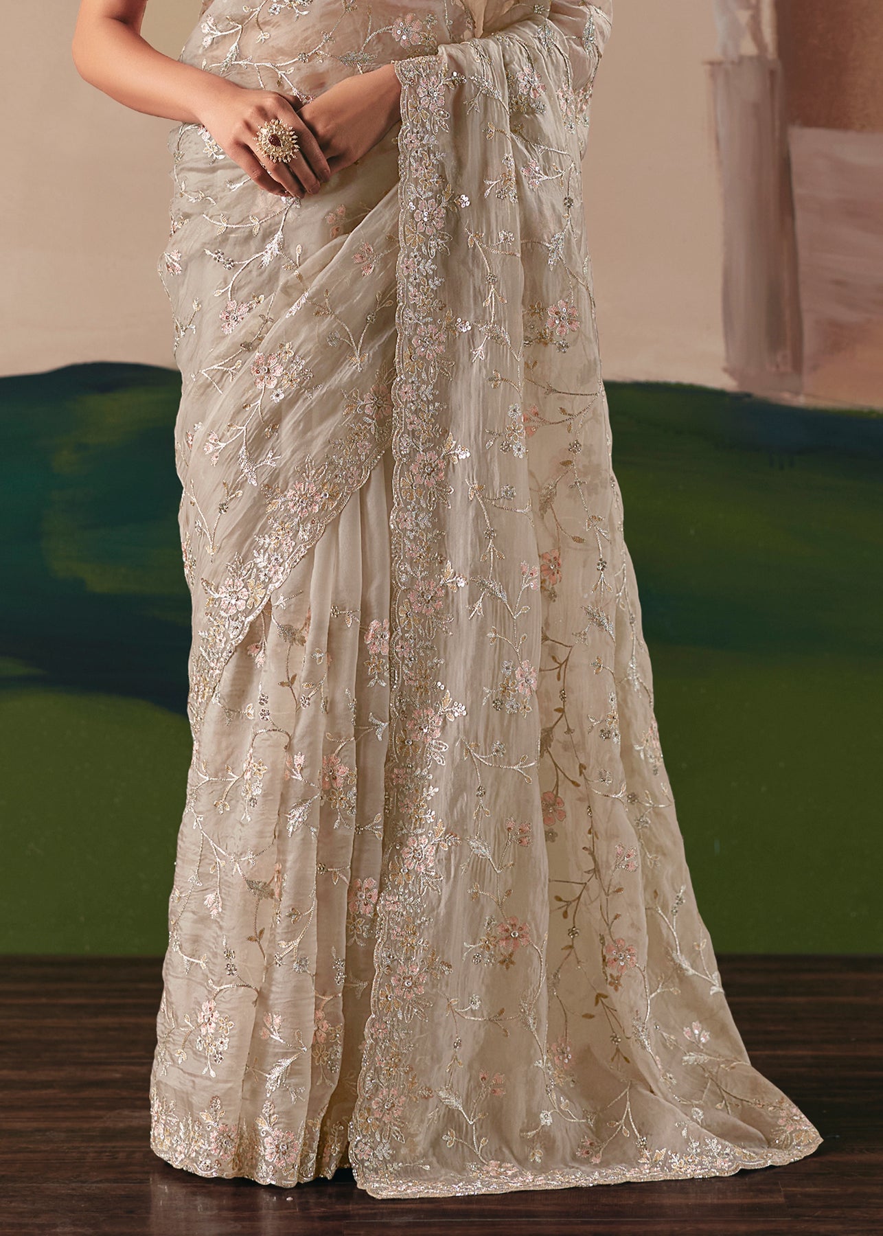 This exquisite Cream to Grey Crape Saree offers a sophisticated gradient and stunning texture. It is heavily embellished with Zari, thread, Cut-Dana, Moti (beads), and mirror work, creating a luxurious, sparkling drape perfect for evening wear.
