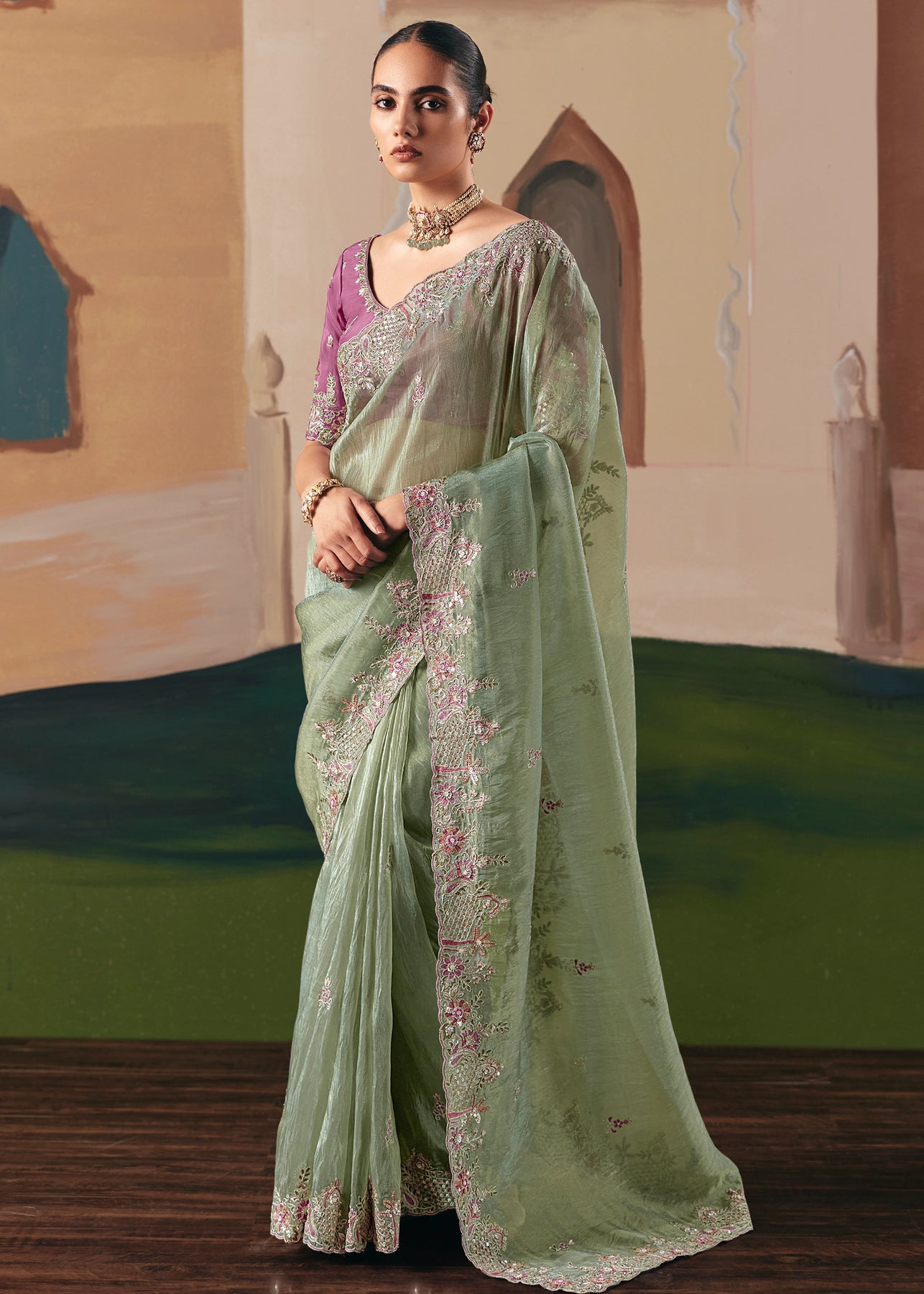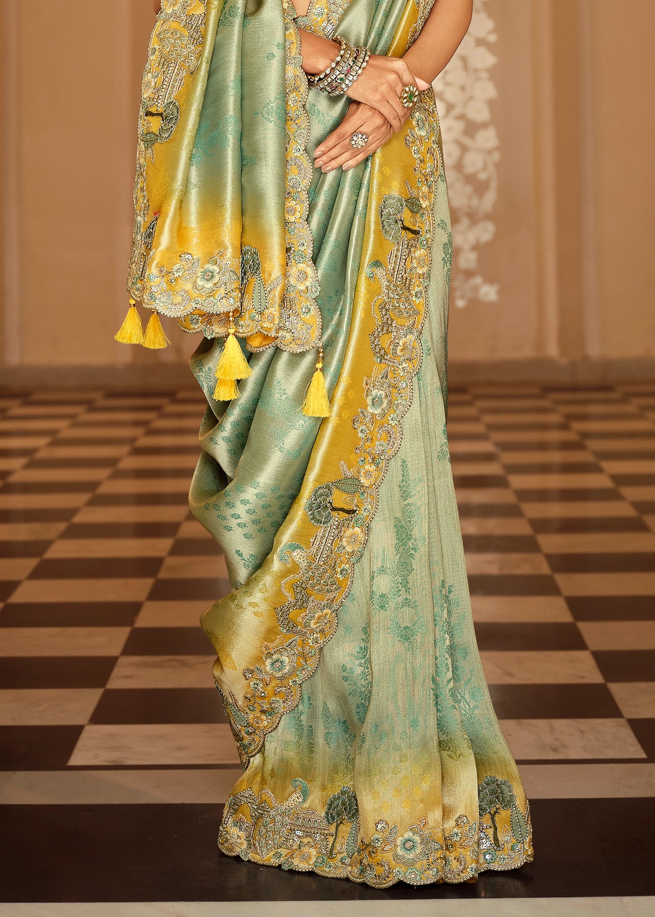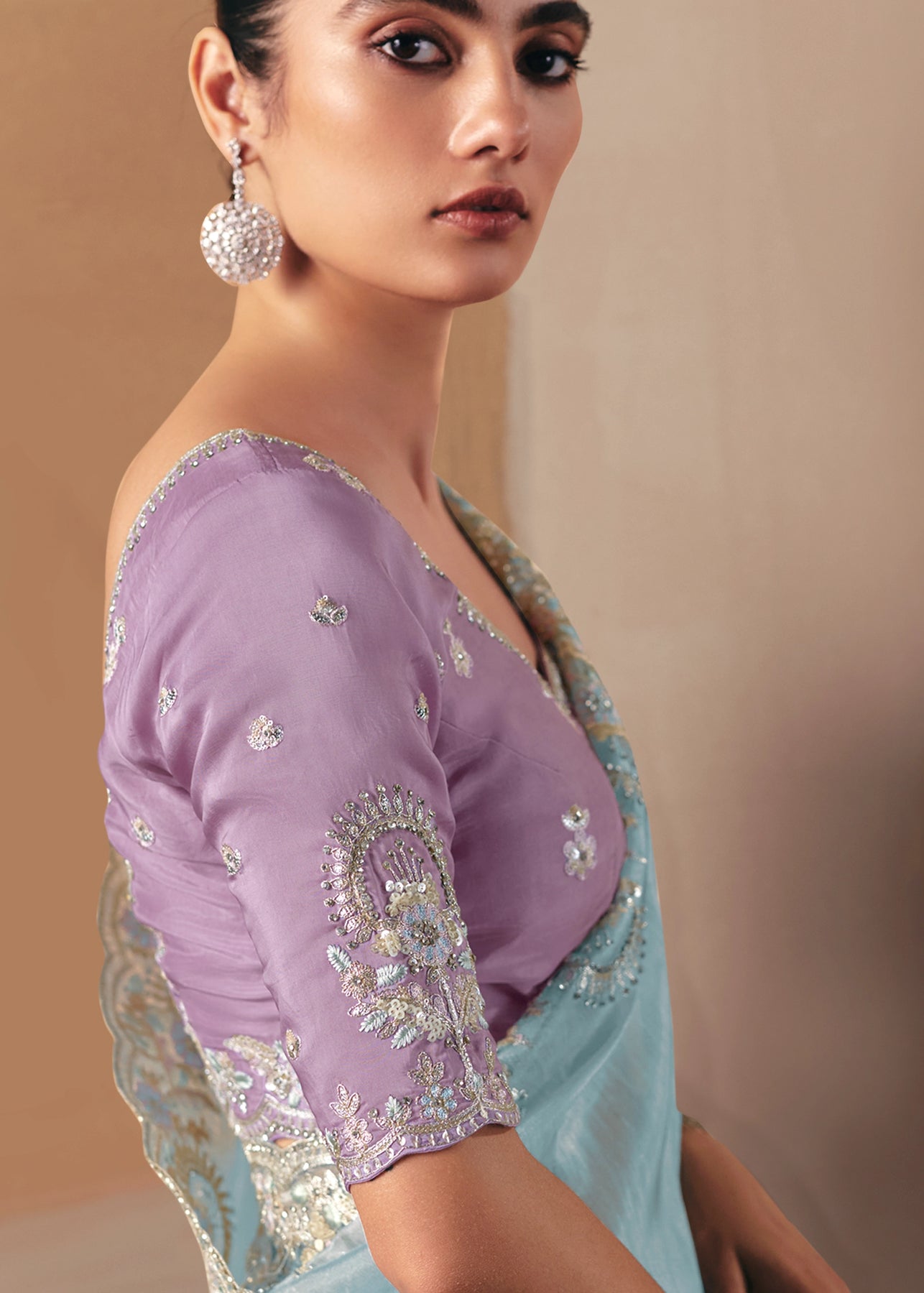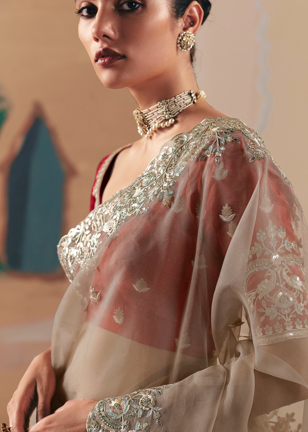 This exquisite Cream to Grey Crape Saree offers a sophisticated gradient and stunning texture. It is heavily embellished with Zari, thread, Cut-Dana, Moti (beads), and mirror work, creating a luxurious, sparkling drape perfect for evening wear.