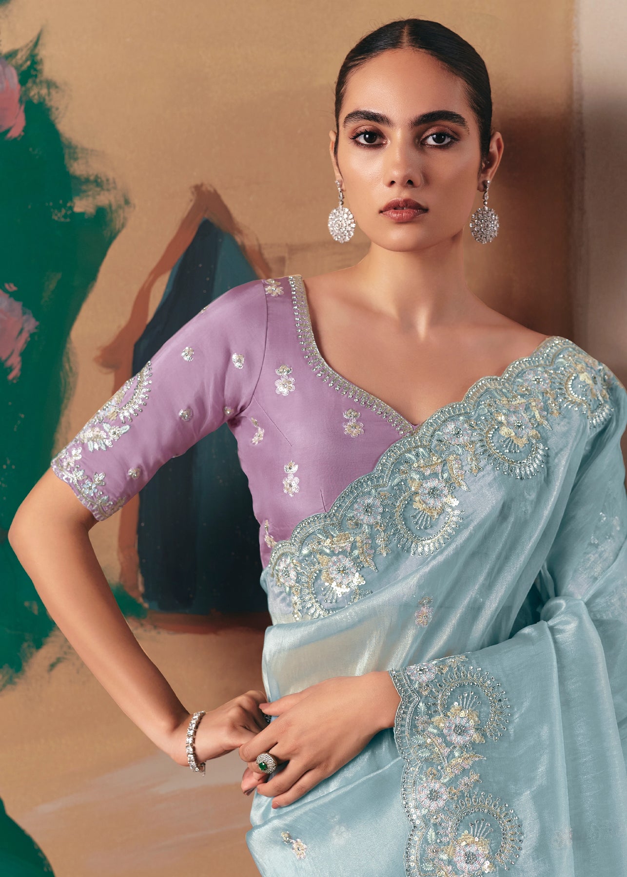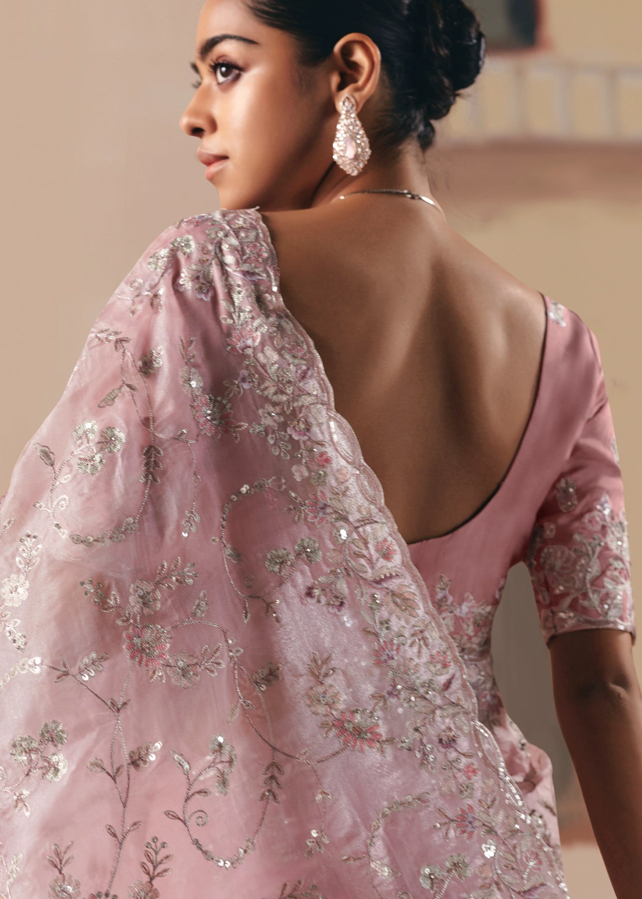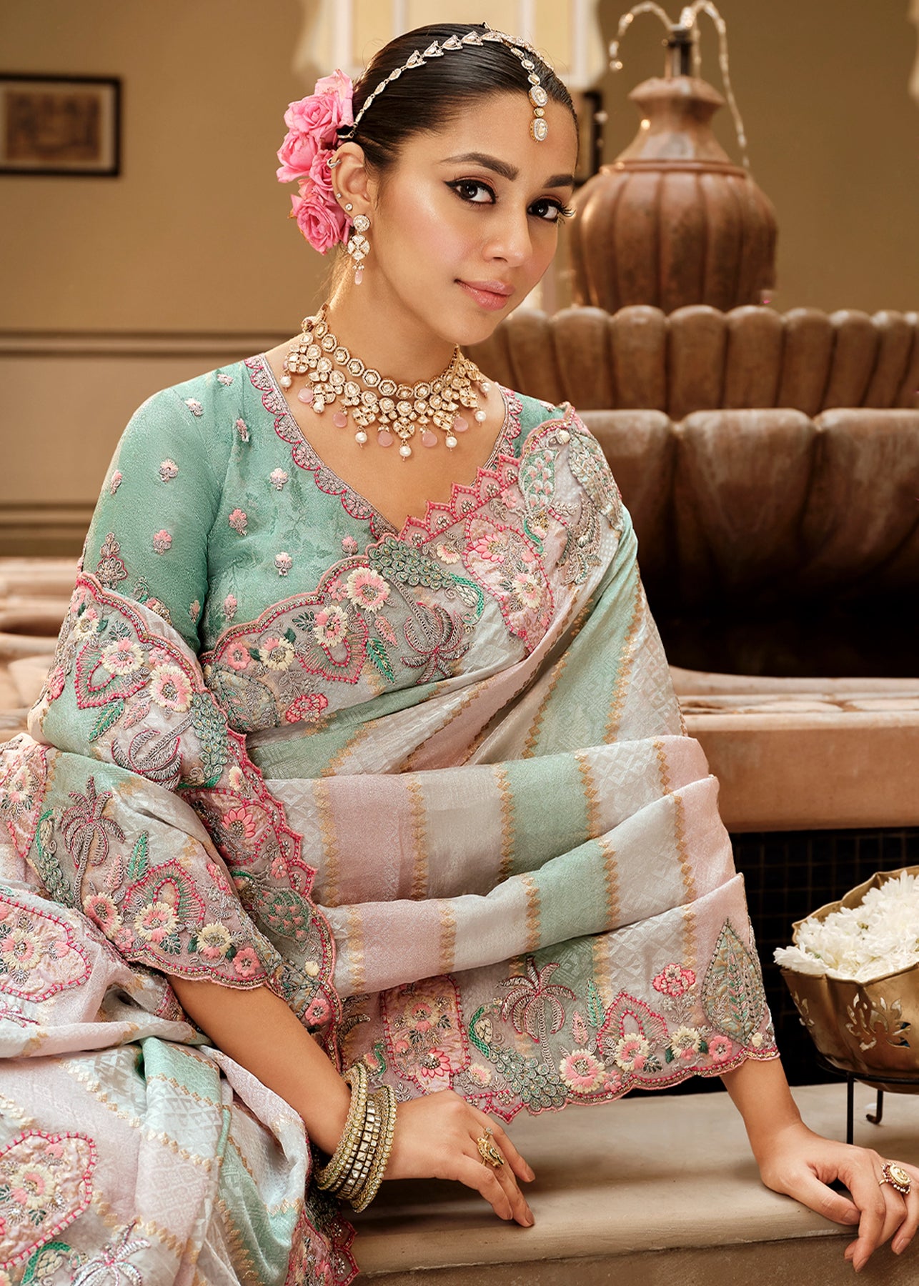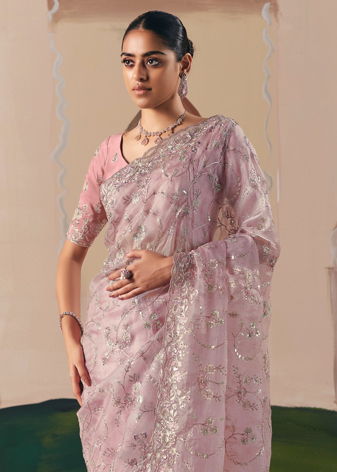 This exquisite Cream to Grey Crape Saree offers a sophisticated gradient and stunning texture. It is heavily embellished with Zari, thread, Cut-Dana, Moti (beads), and mirror work, creating a luxurious, sparkling drape perfect for evening wear.