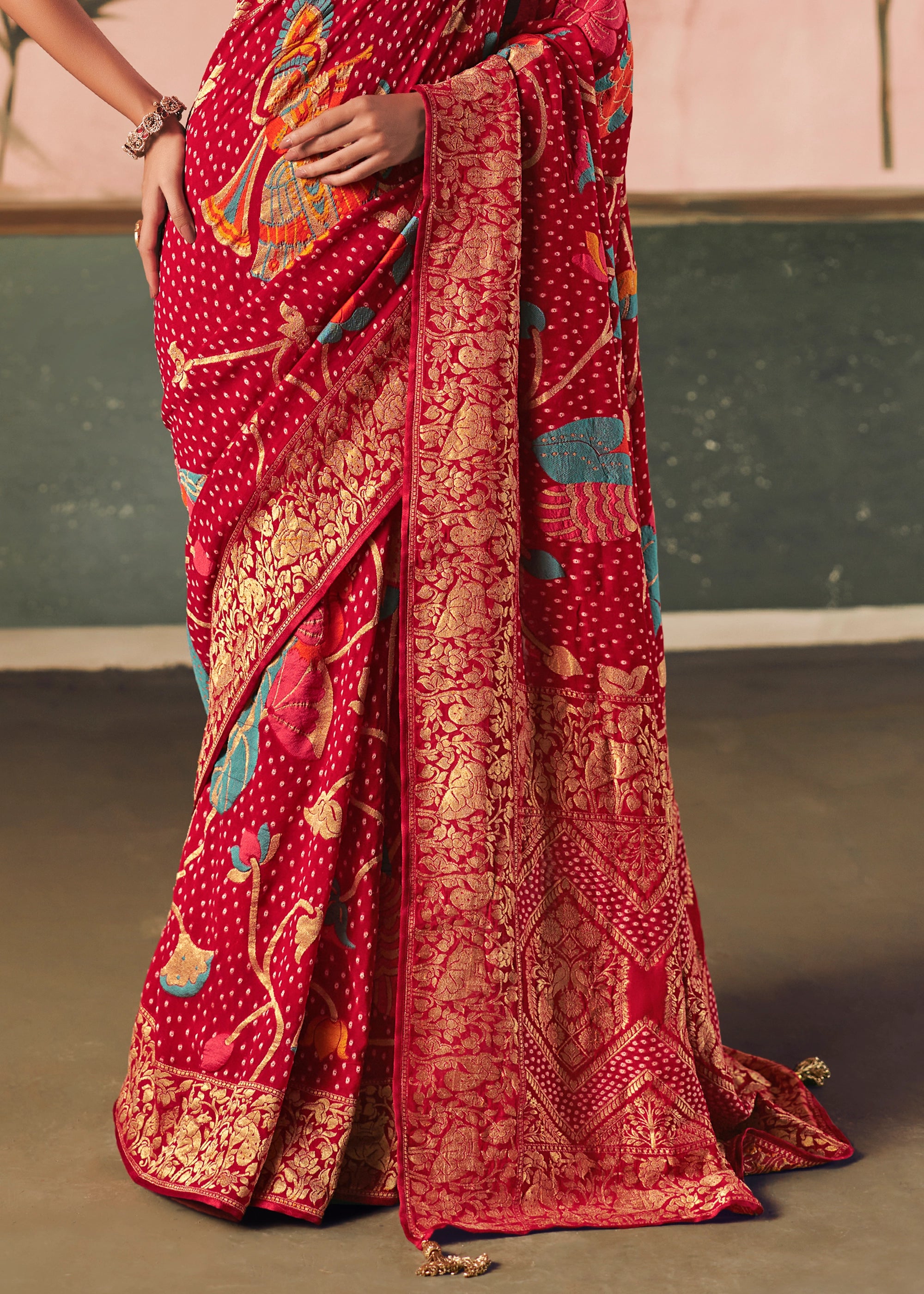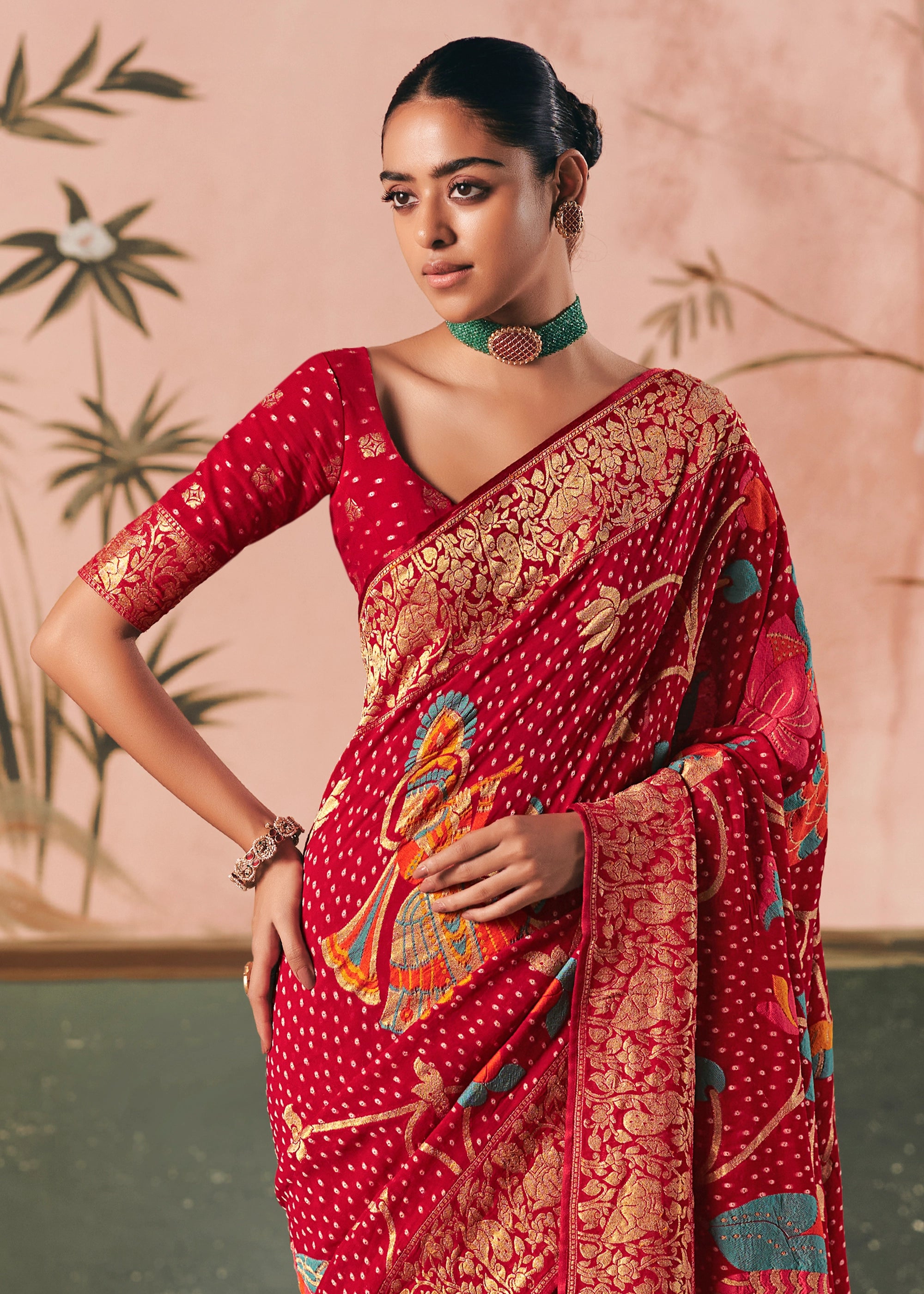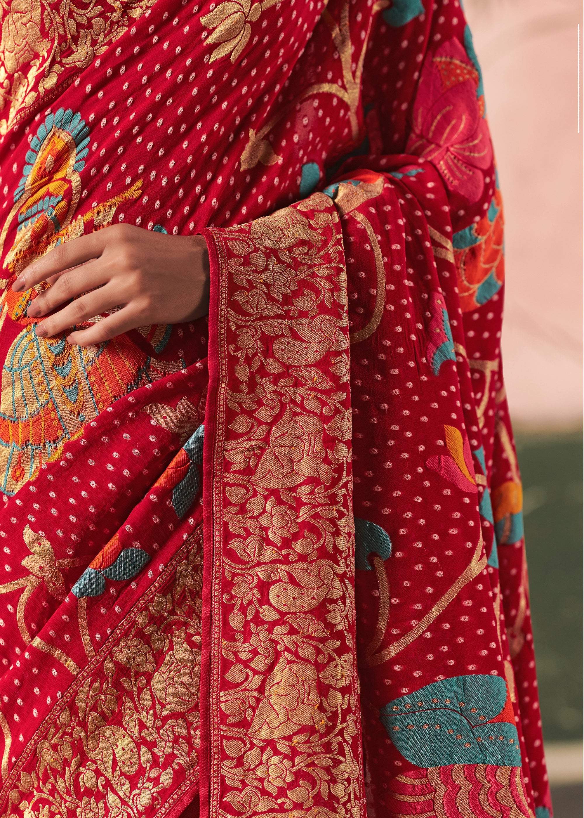 This elegant saree is made from flowing Pure Khaddi Georgette, featuring exclusive designer Bandhej zari weaving work. The ensemble is beautifully finished with delicate tassels and includes a matching Khaddi Georgette blouse.