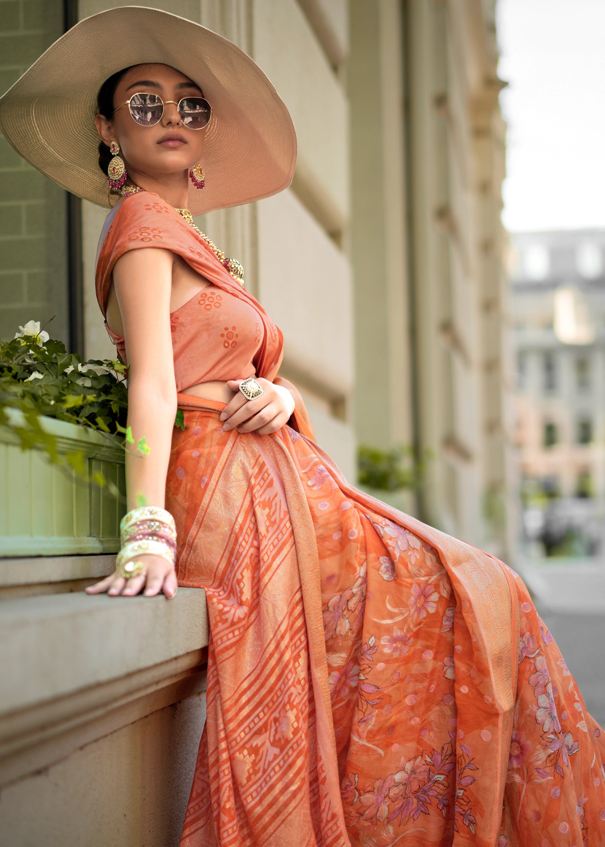 A Georgette Silk Saree is a stunning and elegant garment that exudes a sense of sophistication and refinement. Adorn yourself with the beauty of nature in this stunning floral printed saree. The intricate floral patterns create a beautiful, eye-catching design that is sure to turn heads.