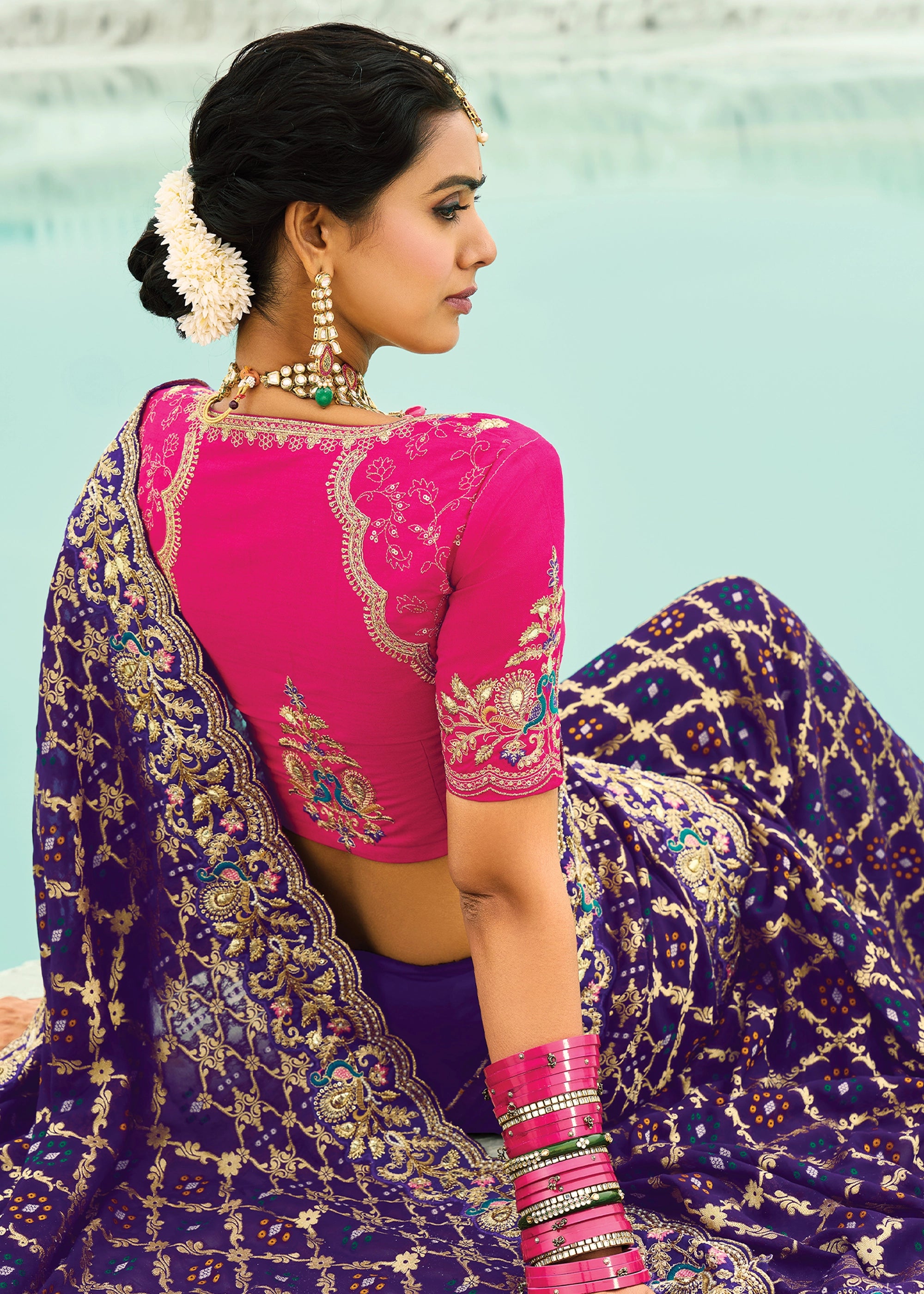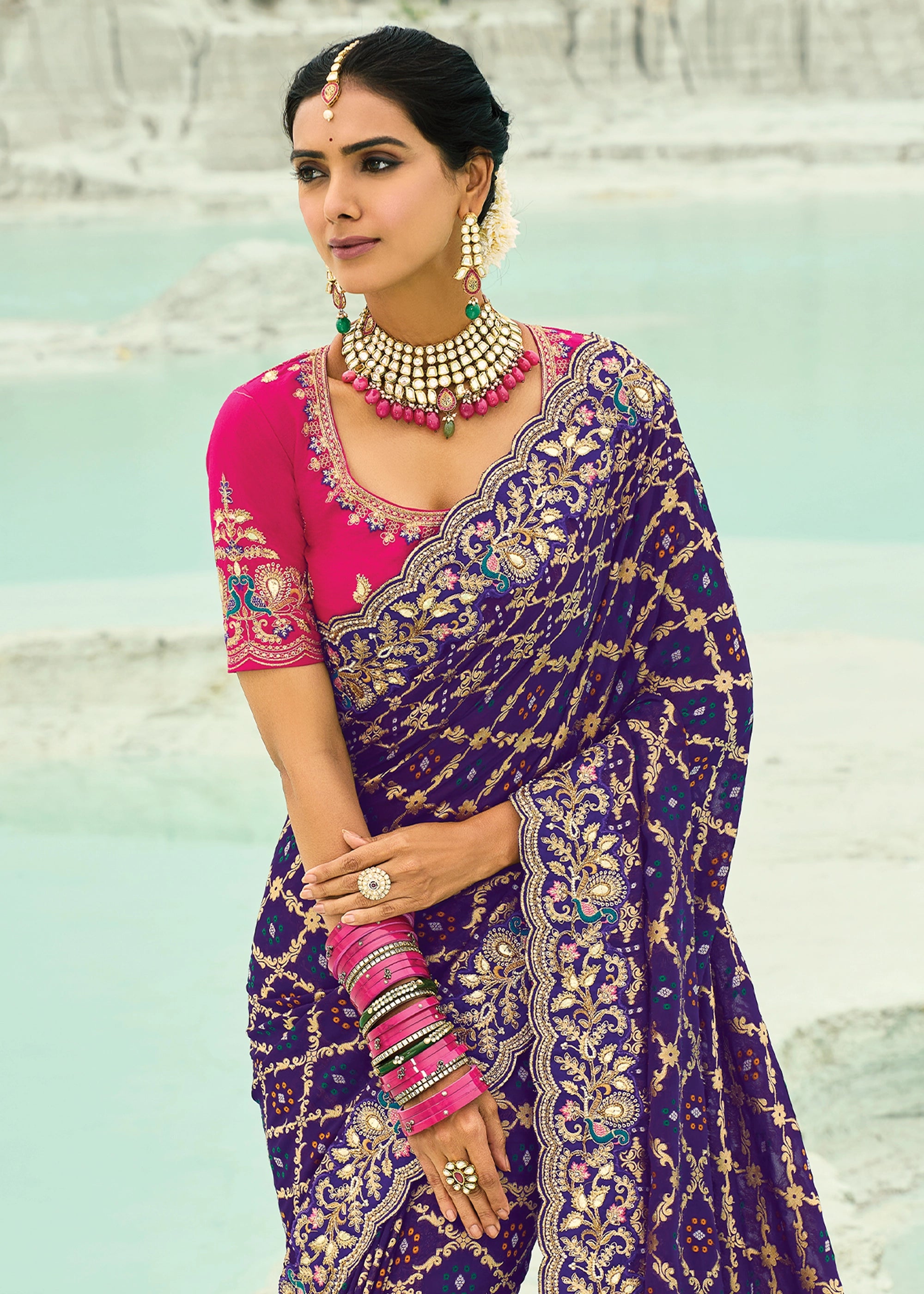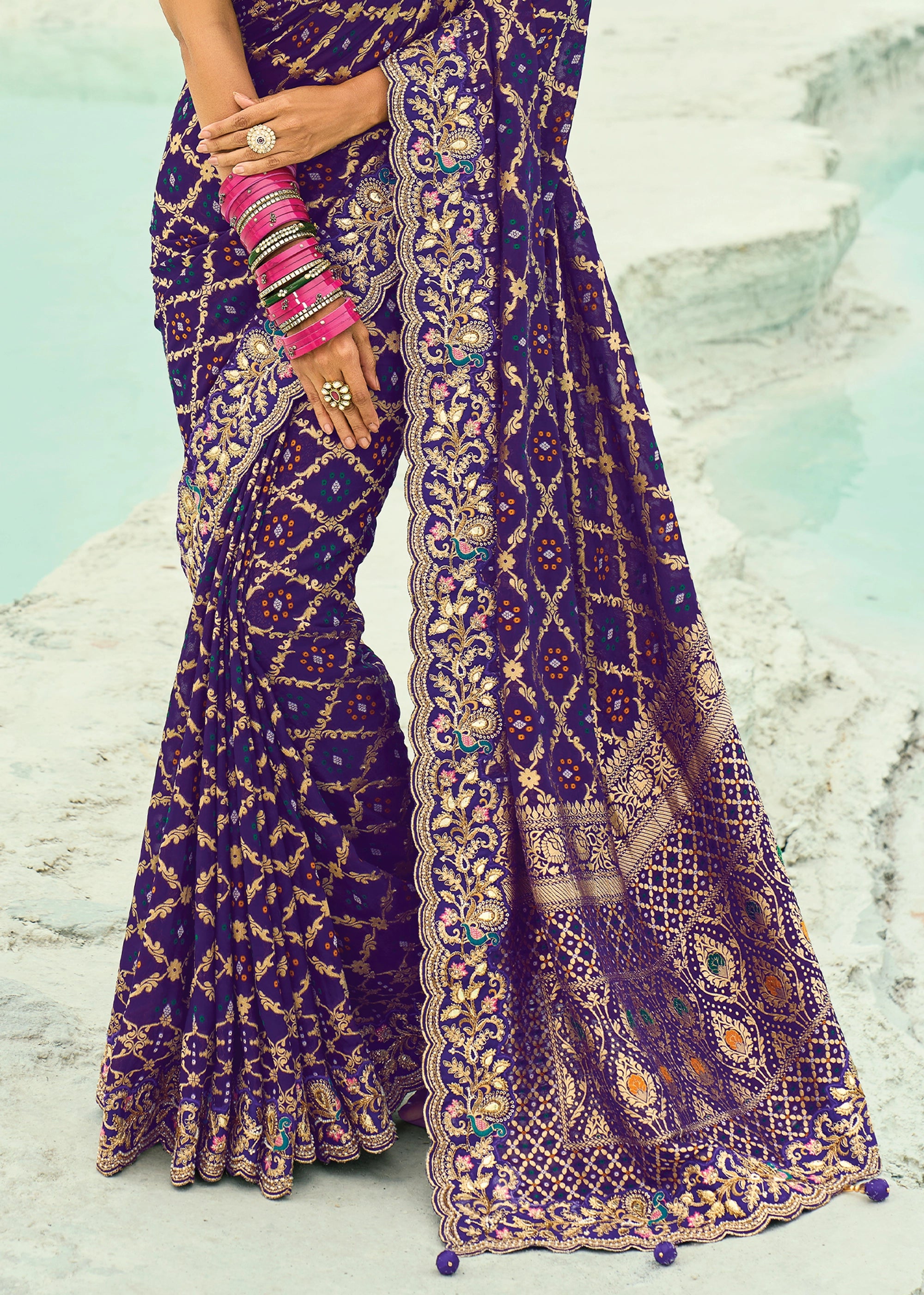 Eggplant Violet Woven Georgette Bandhej Designer Saree