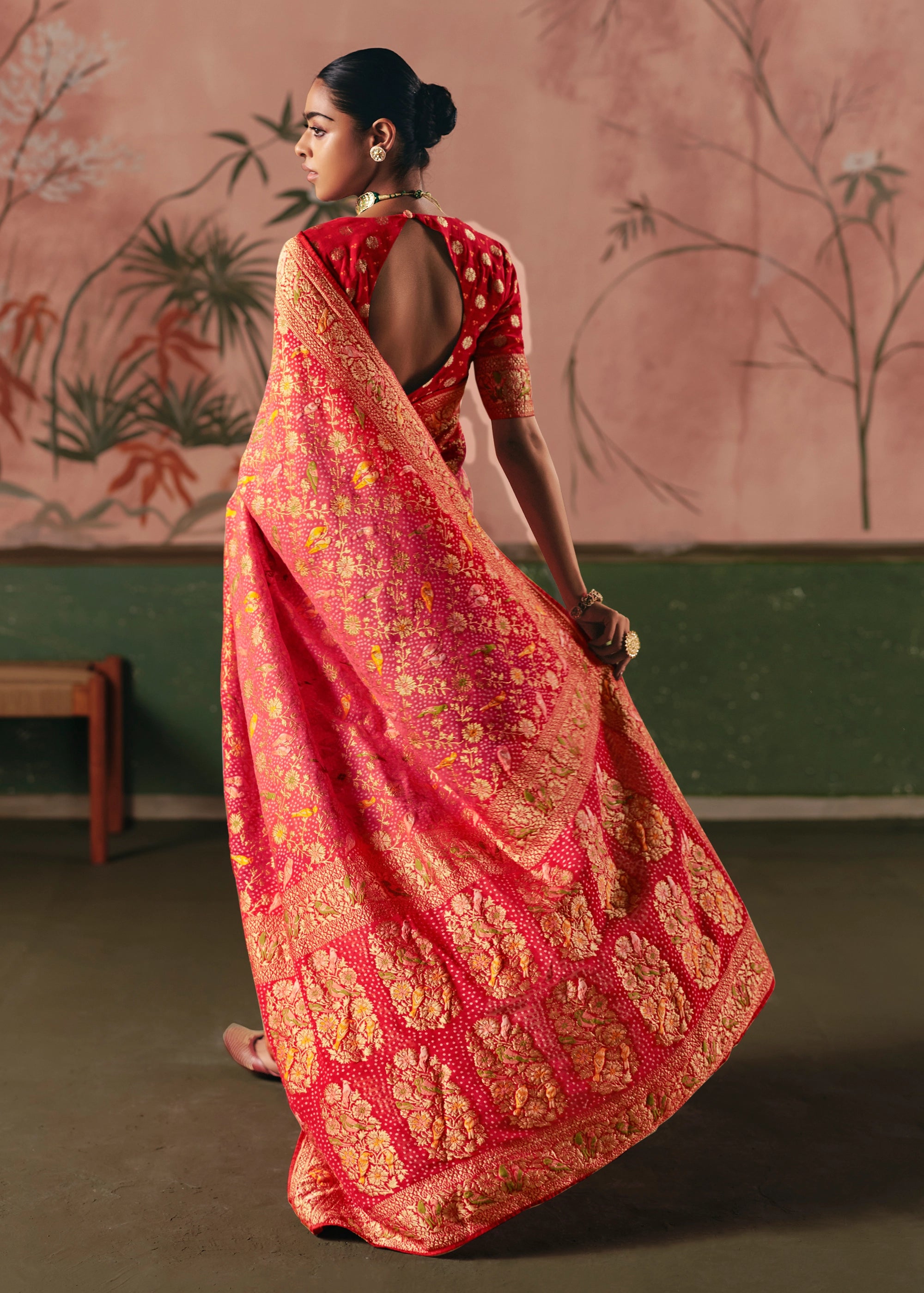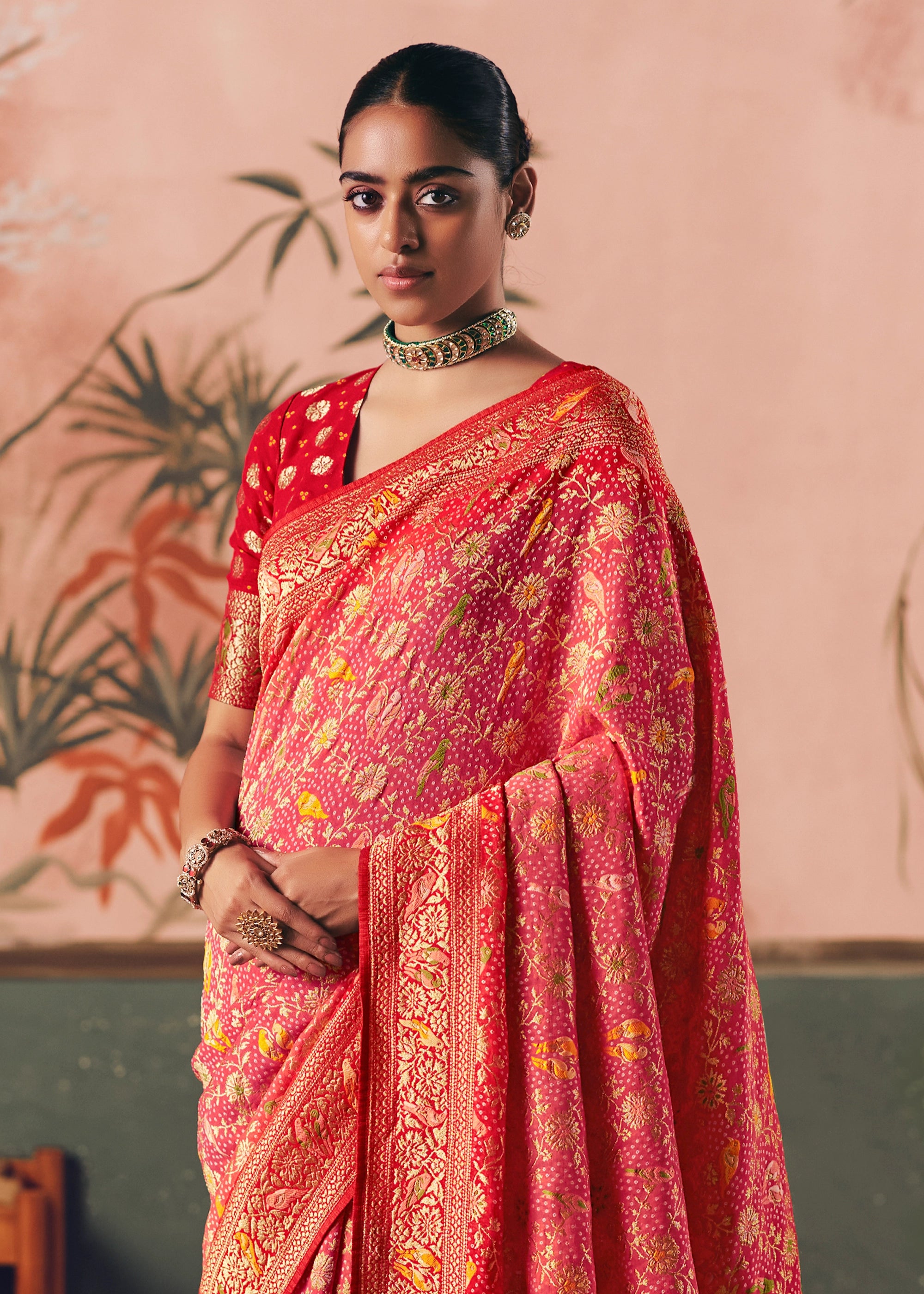 This elegant saree is made from flowing Pure Khaddi Georgette, featuring exclusive designer Bandhej zari weaving work. The ensemble is beautifully finished with delicate tassels and includes a matching Khaddi Georgette blouse.