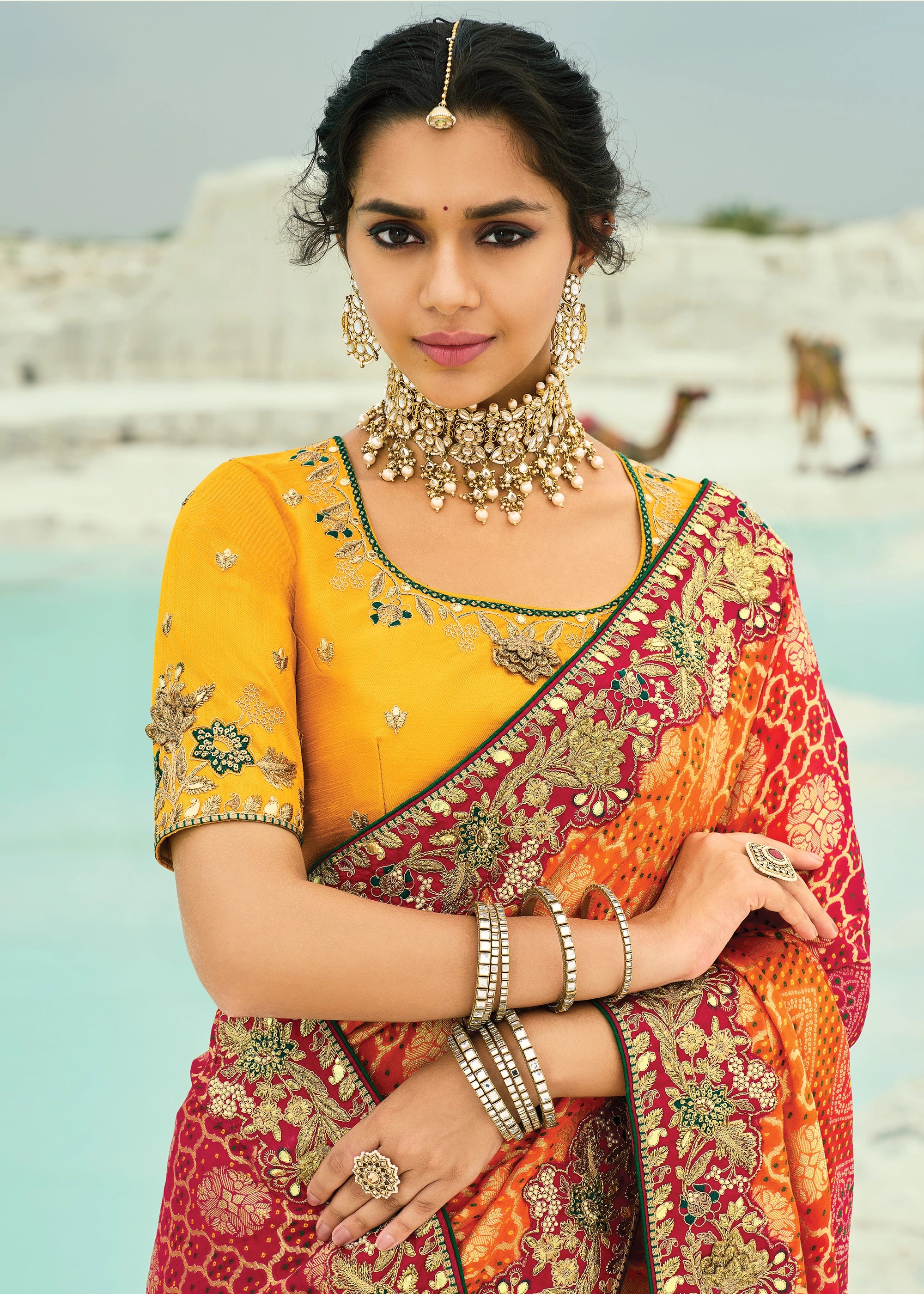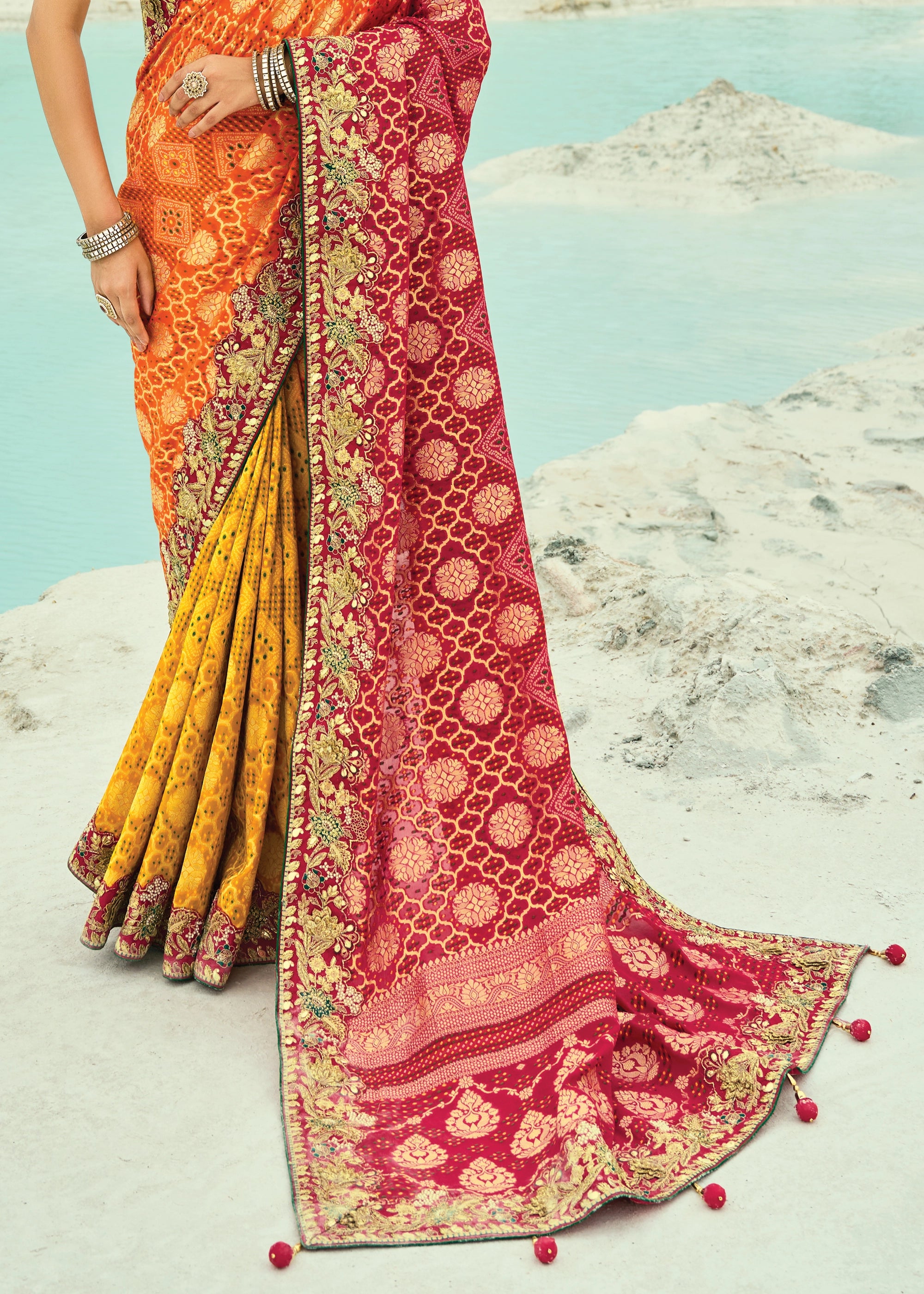 This radiant georgette saree features vibrant yellow and orange hues with traditional Bandhej work. It is embellished with rich moti, cut-dana, resham, sequins, pearls, zari, and zardosi detailing, making it ideal for weddings or festive occasions.