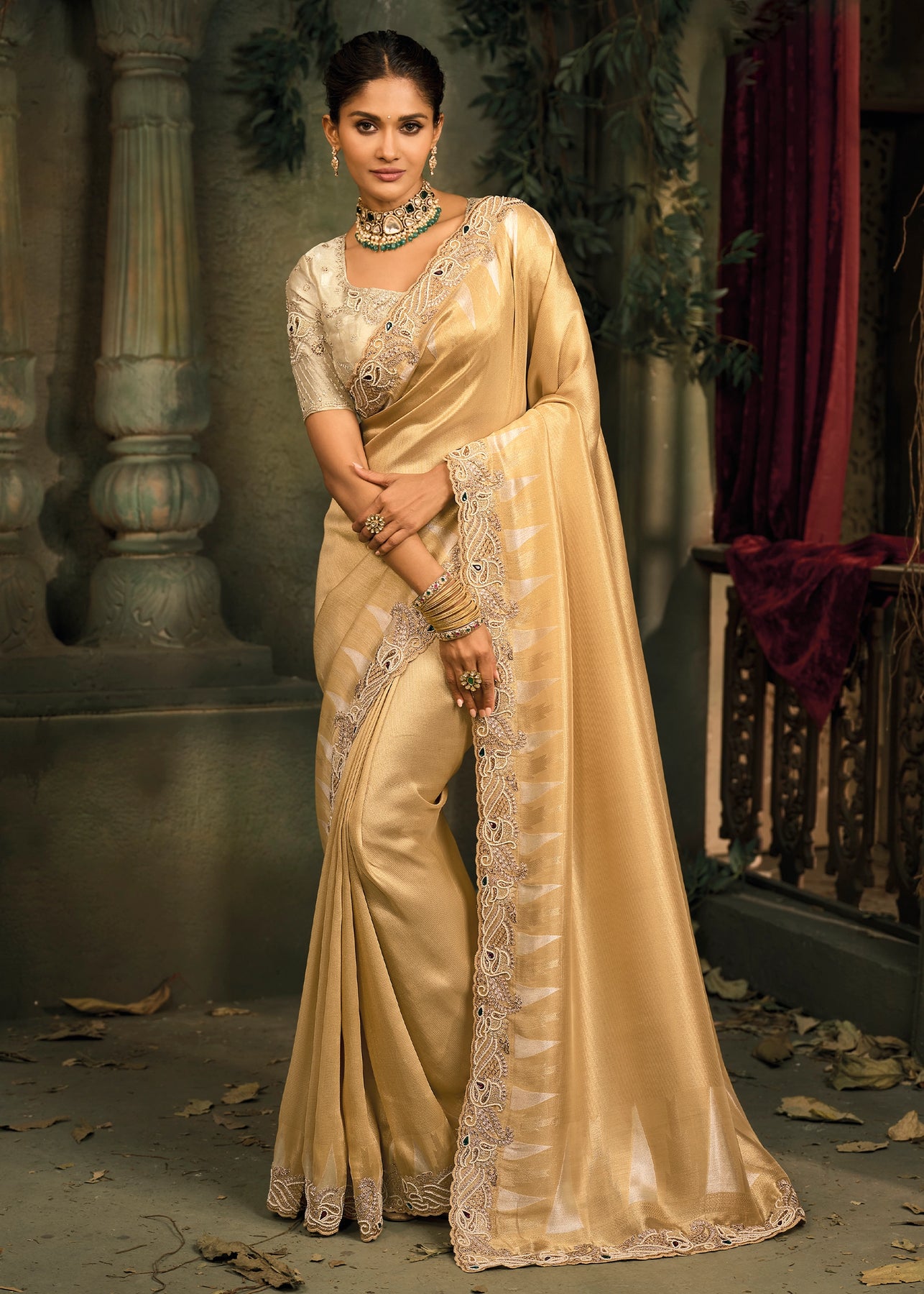 Almond Beige Designer Embroidered Silk Saree