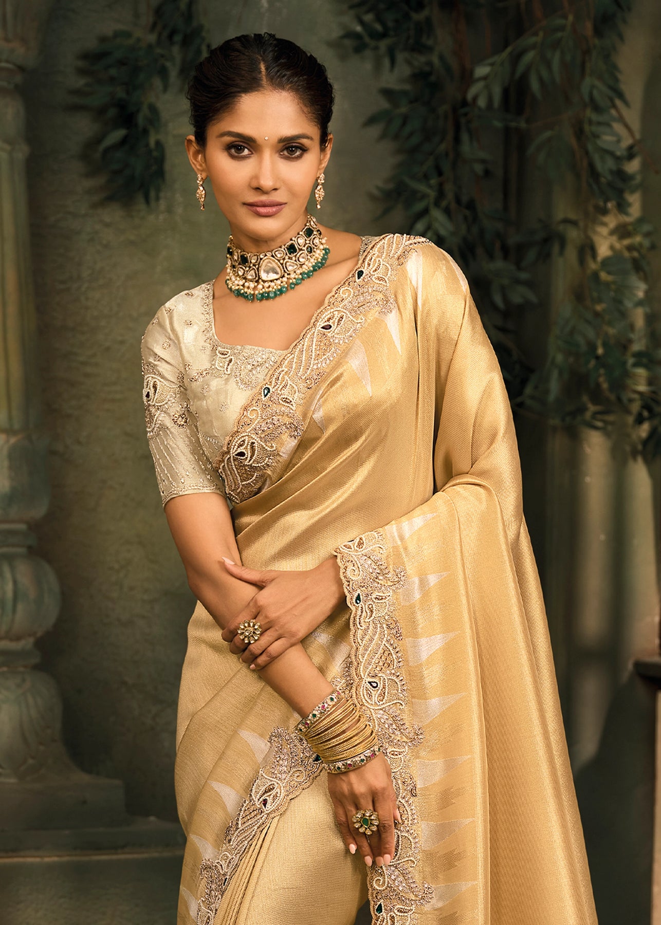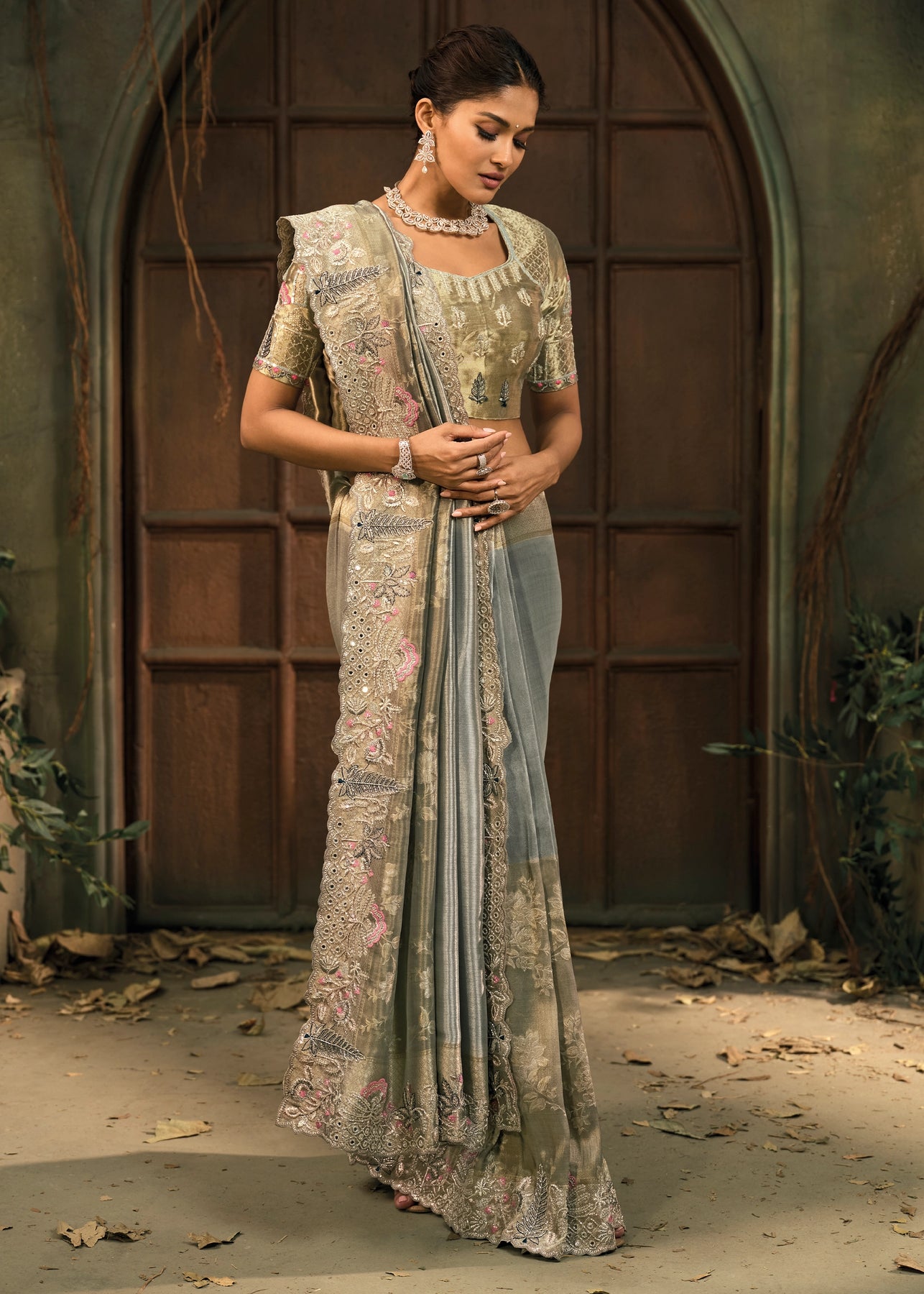 Antique Green Embroidered Designer Tissue Saree