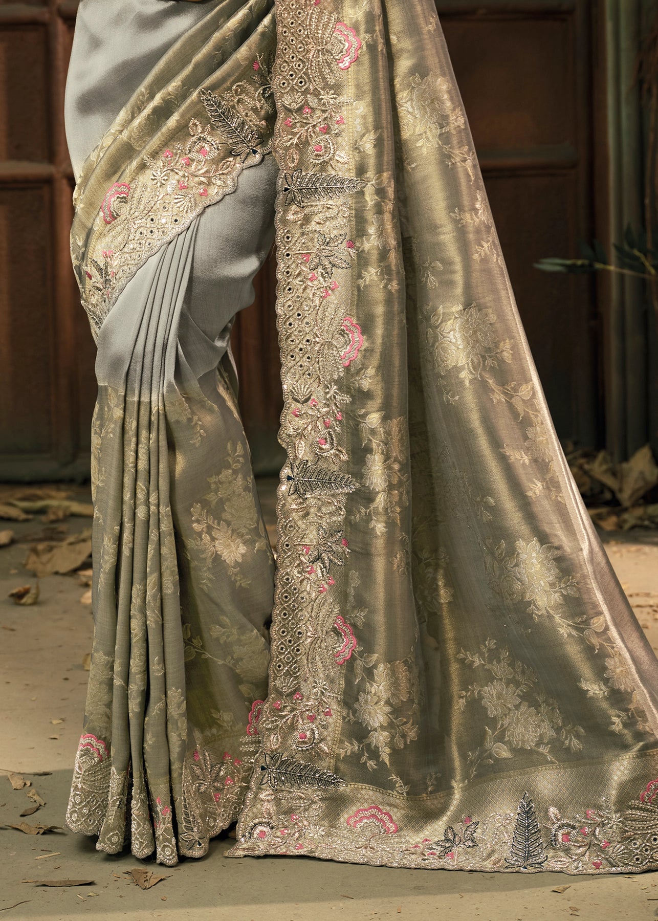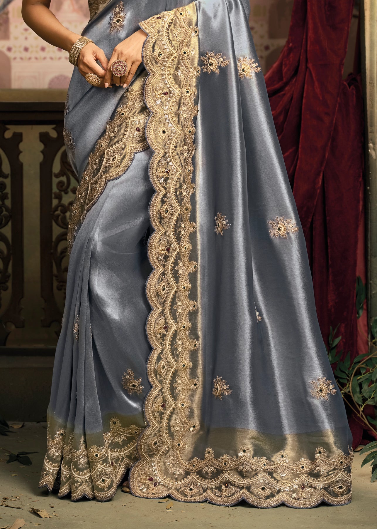 Rich Grey Designer Embroidered Silk Saree