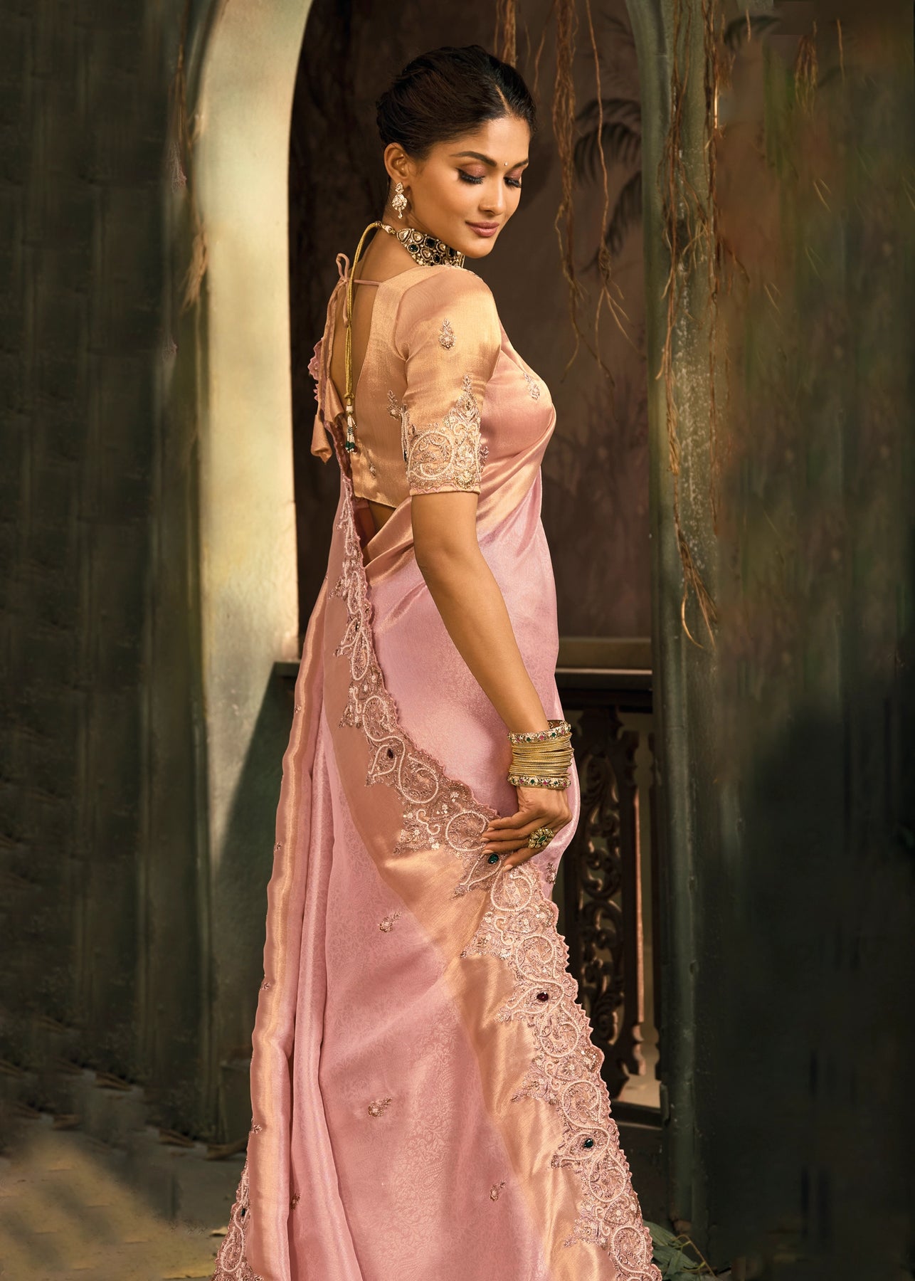 Blush Pink Embroidered Designer Tissue Saree