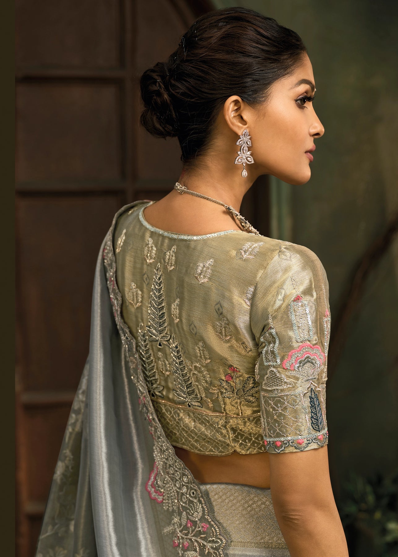 Olive Green Embroidered Designer Tissue Saree