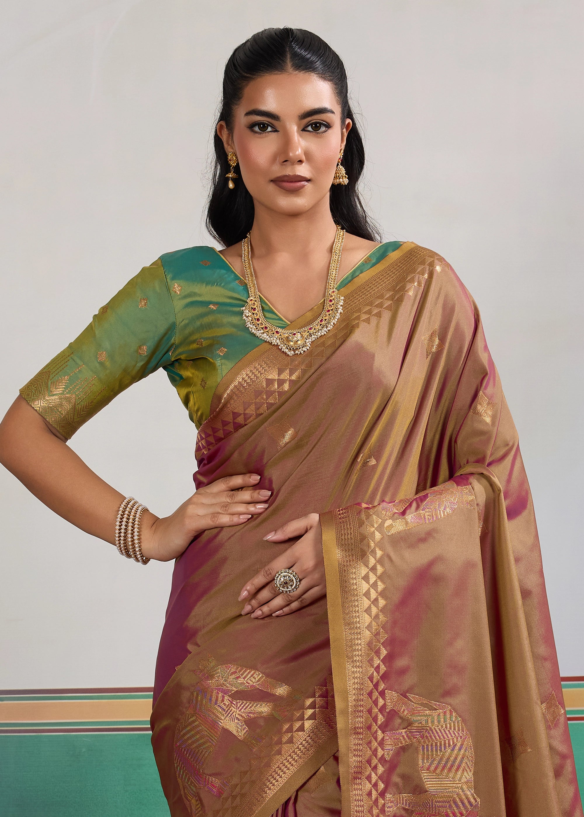 Almond Brown Woven Silk Saree With Contrast Blouse