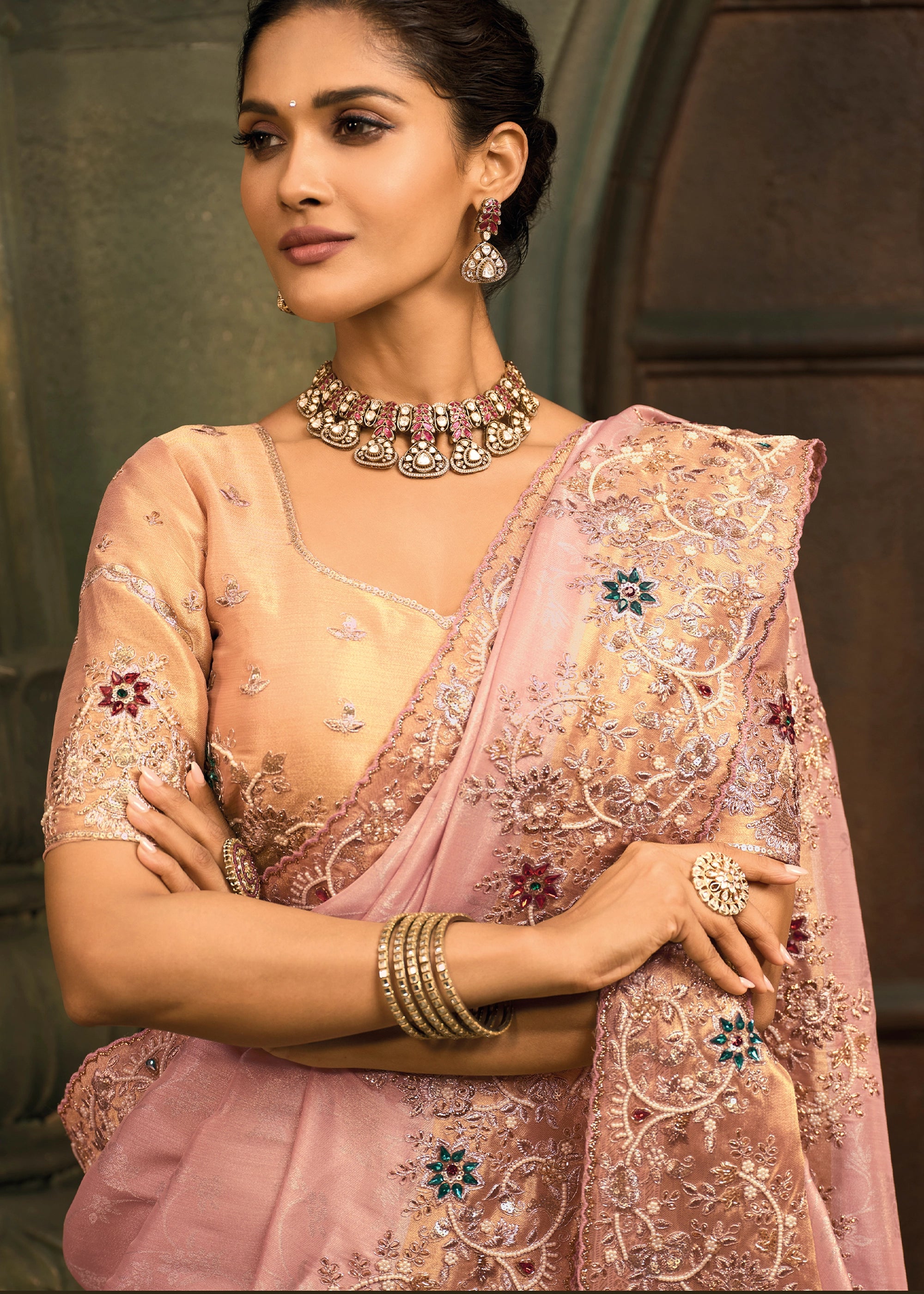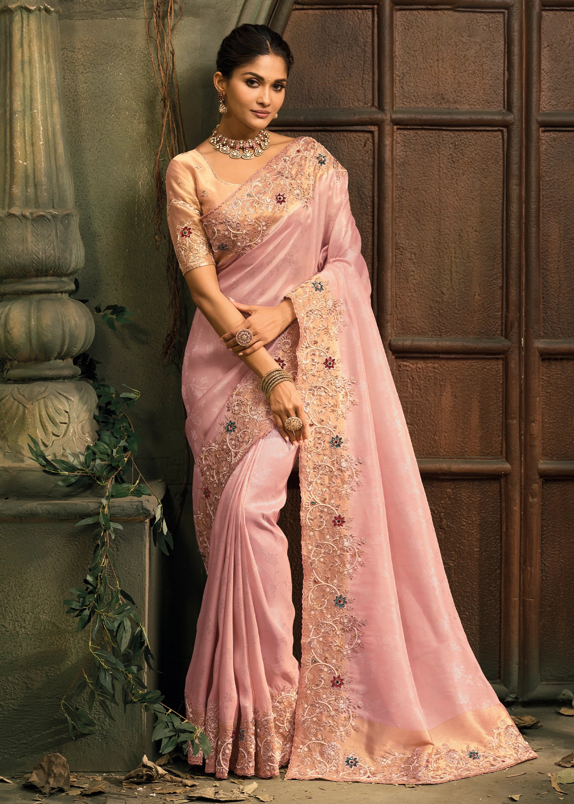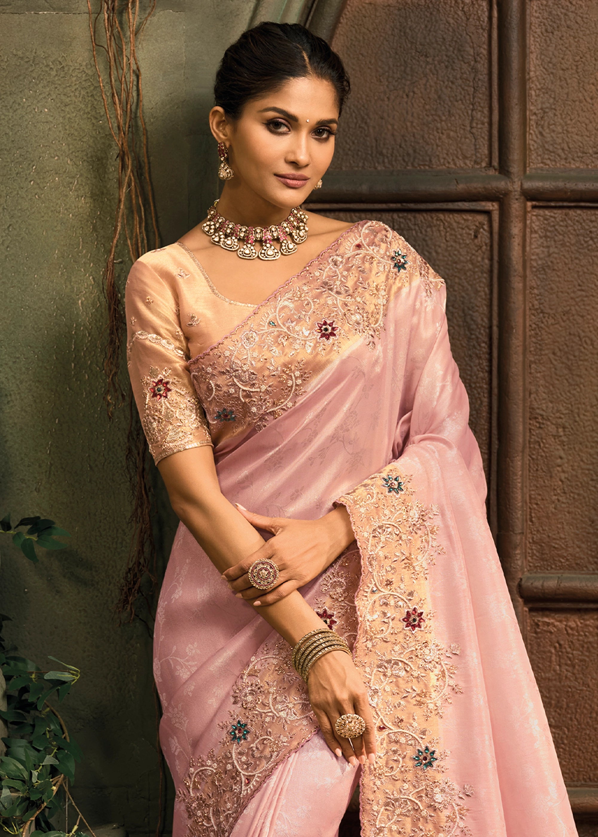 Baby Pink Designer Embroidered Silk Saree