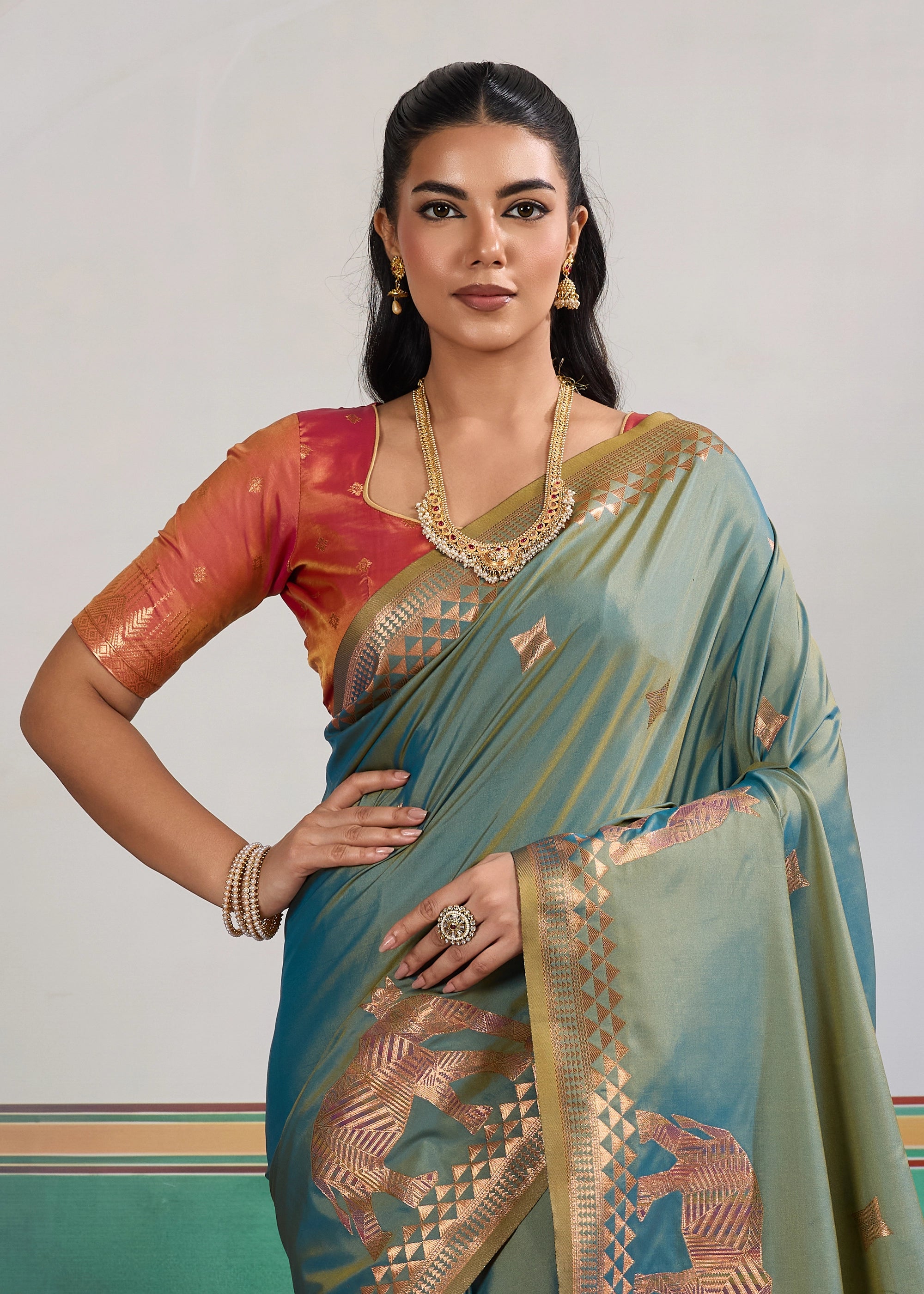 Canton Green Woven Silk Saree With Contrast Blouse