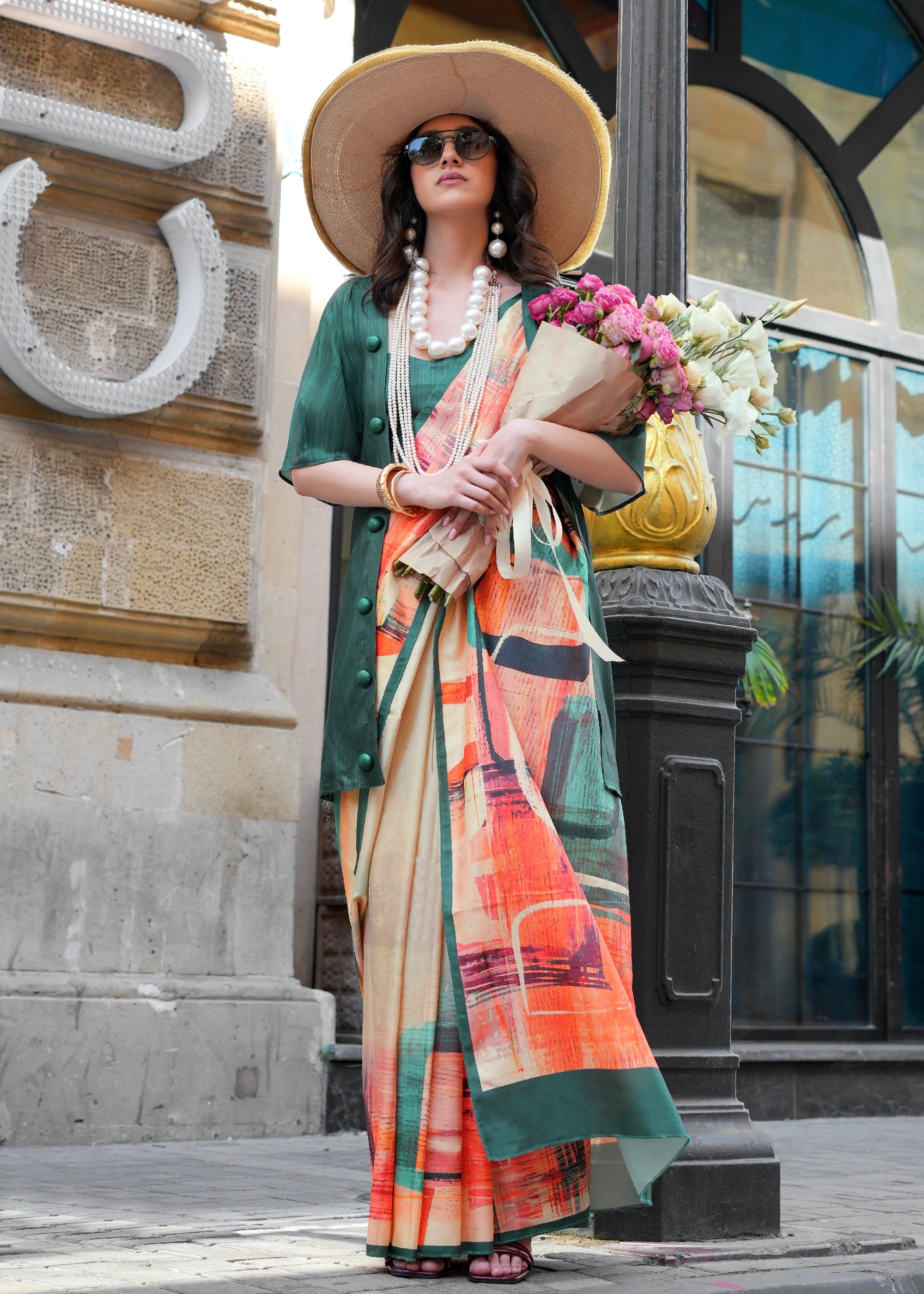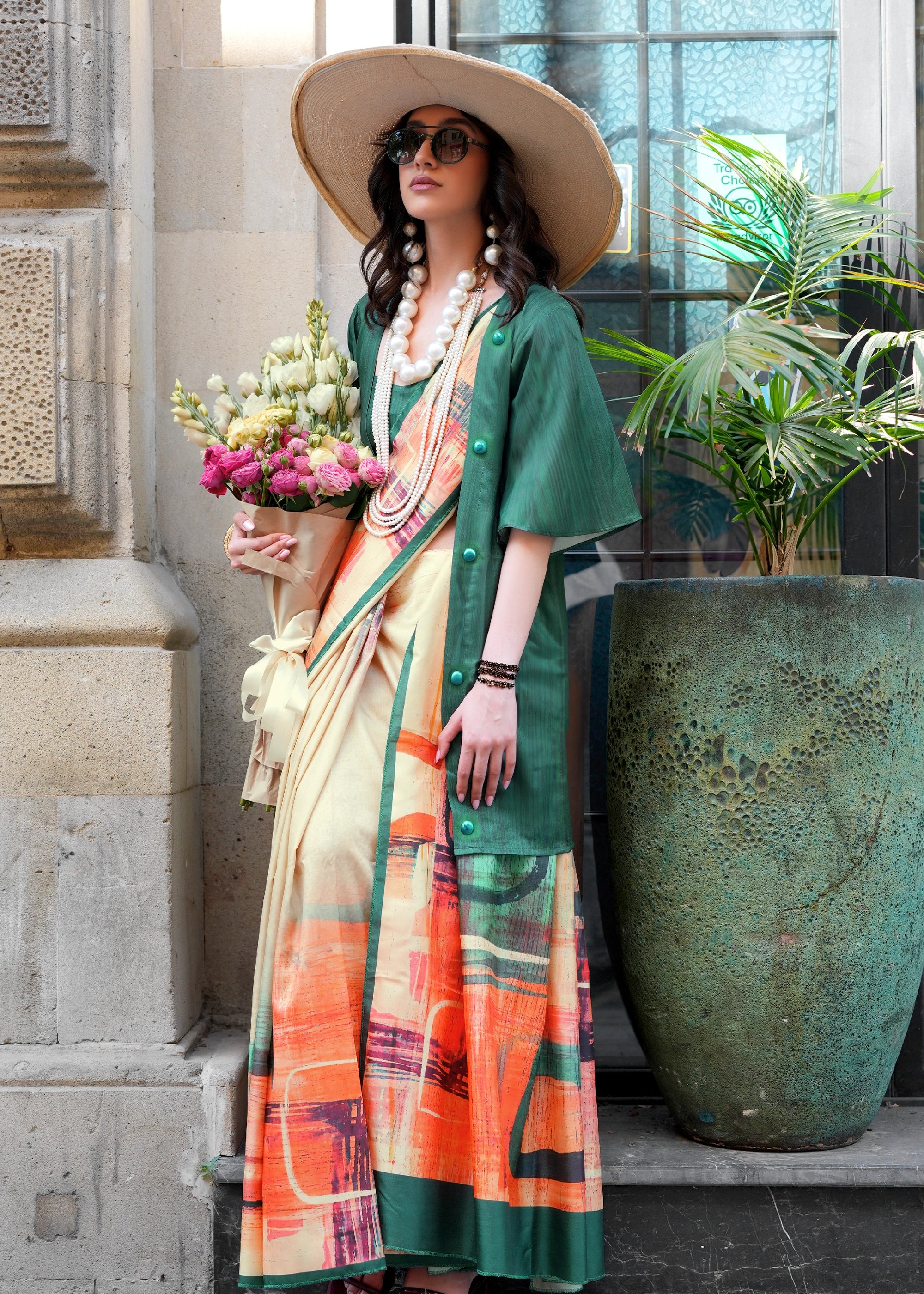 Cream Beige Digital Printed Soft Silk Saree