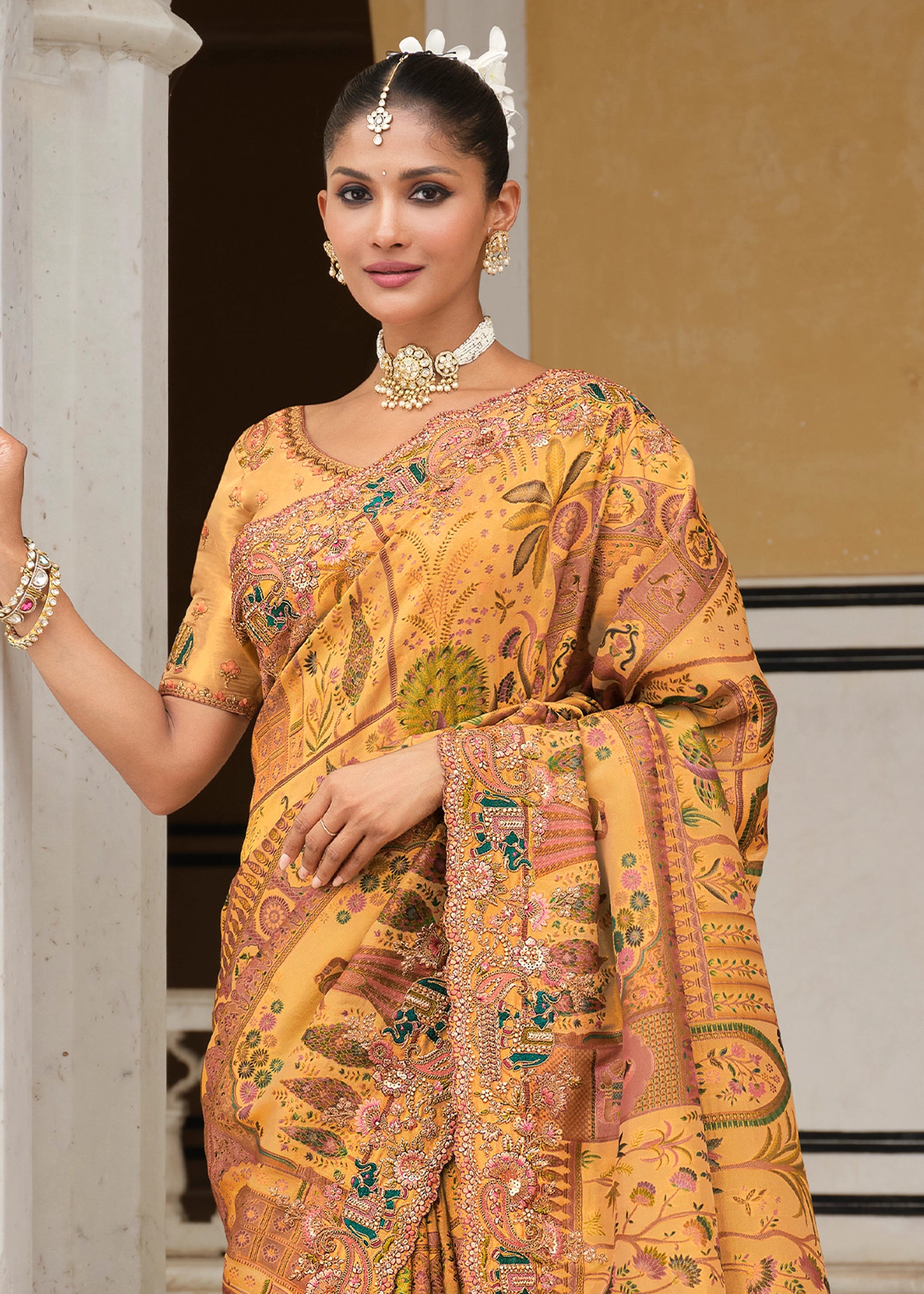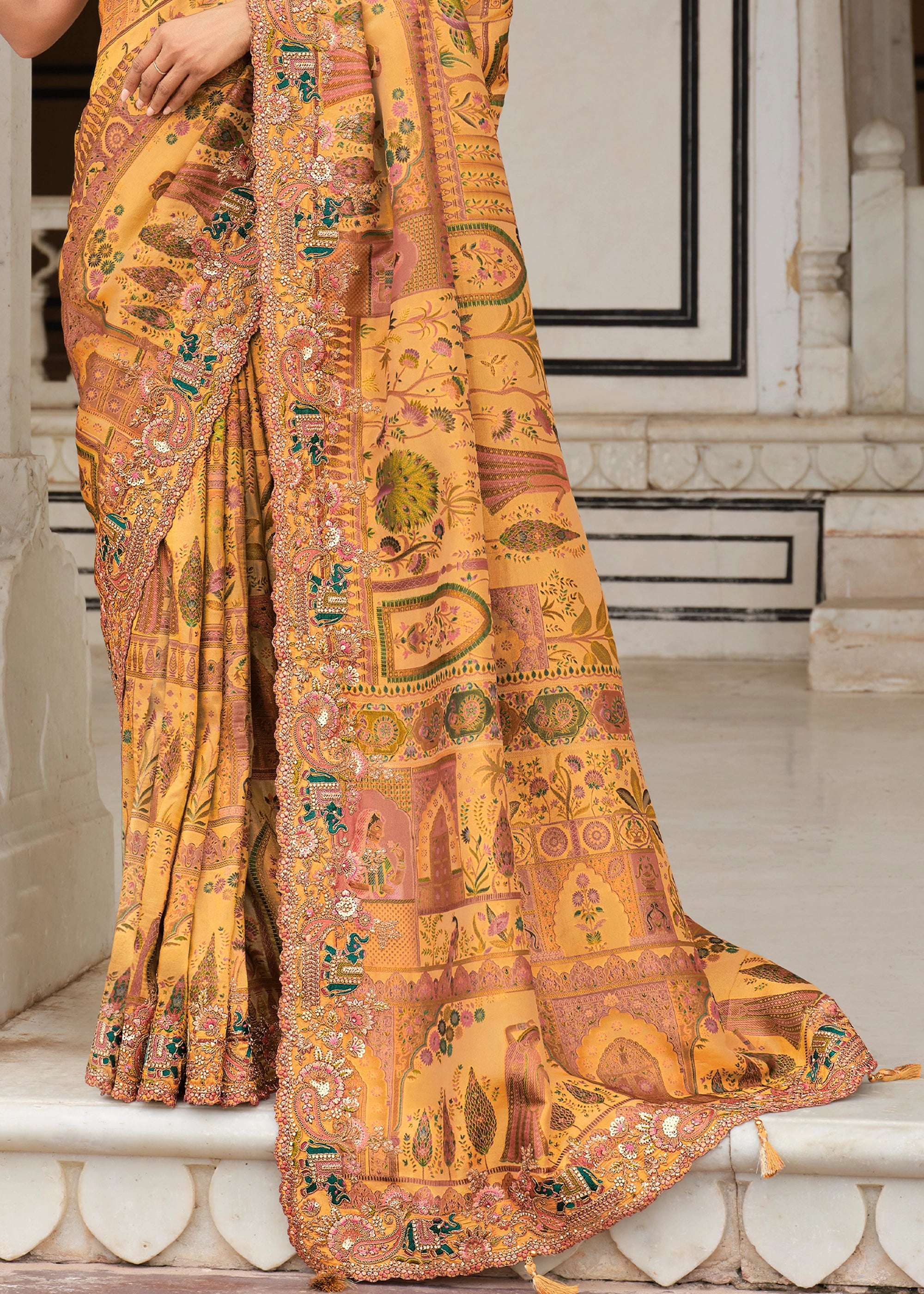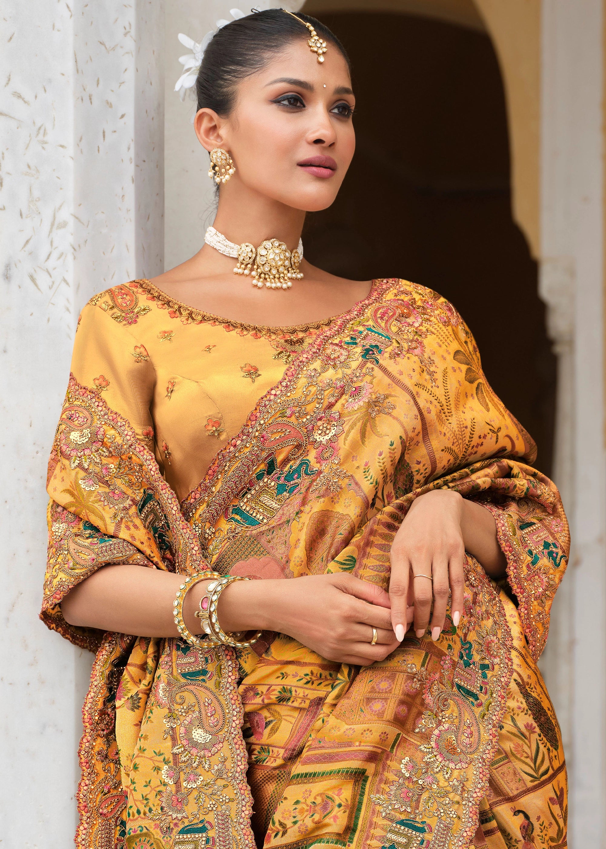 Daffodil Yellow Designer Embroidered Silk Saree