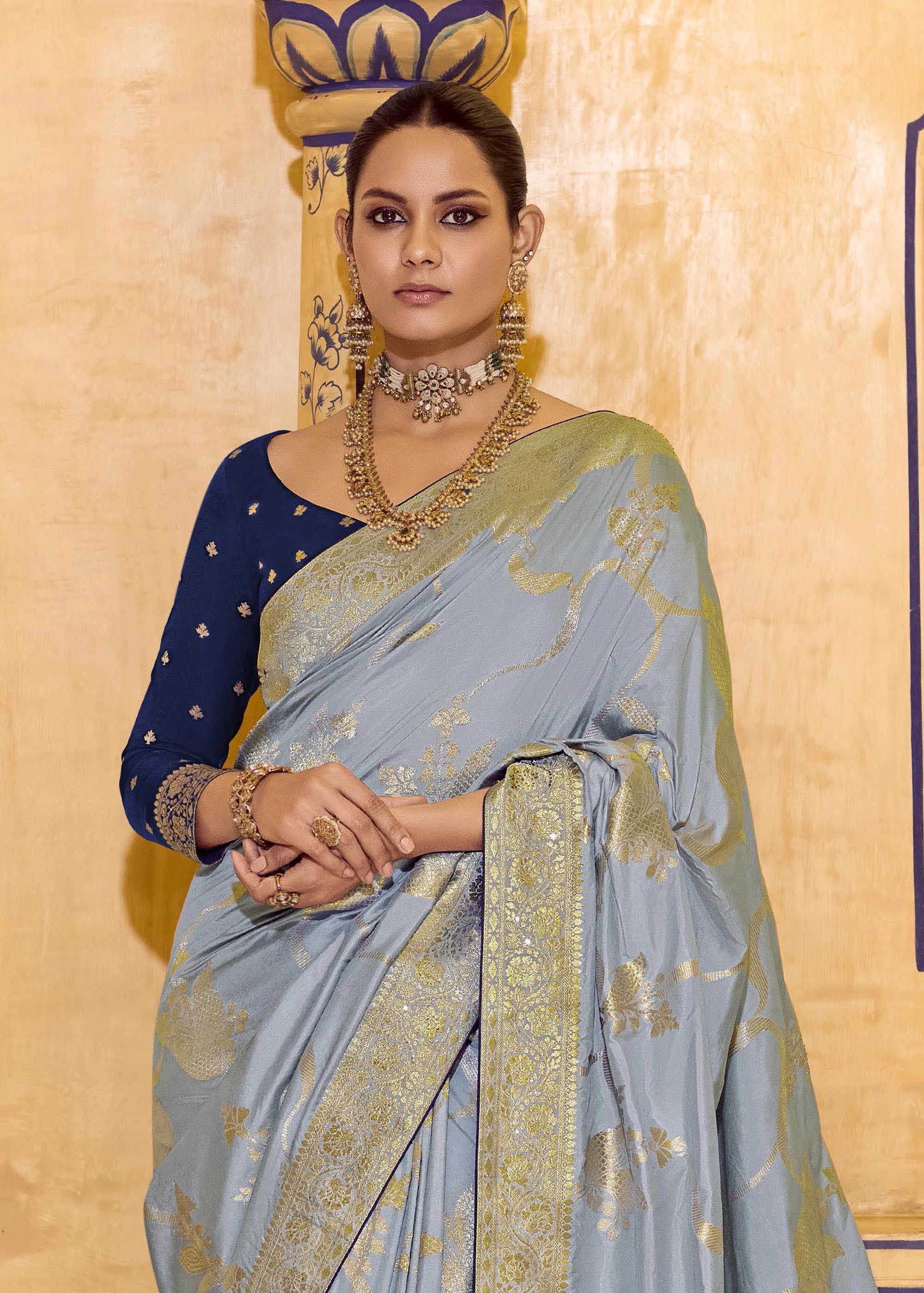 This silk saree shimmers with regal splendor. Its opulent silk threads create a rich texture and a captivating sheen.  Intricate zari work, often in gold or silver, intricately weaves traditional motifs like paisleys, florals, and geometric patterns across the fabric.