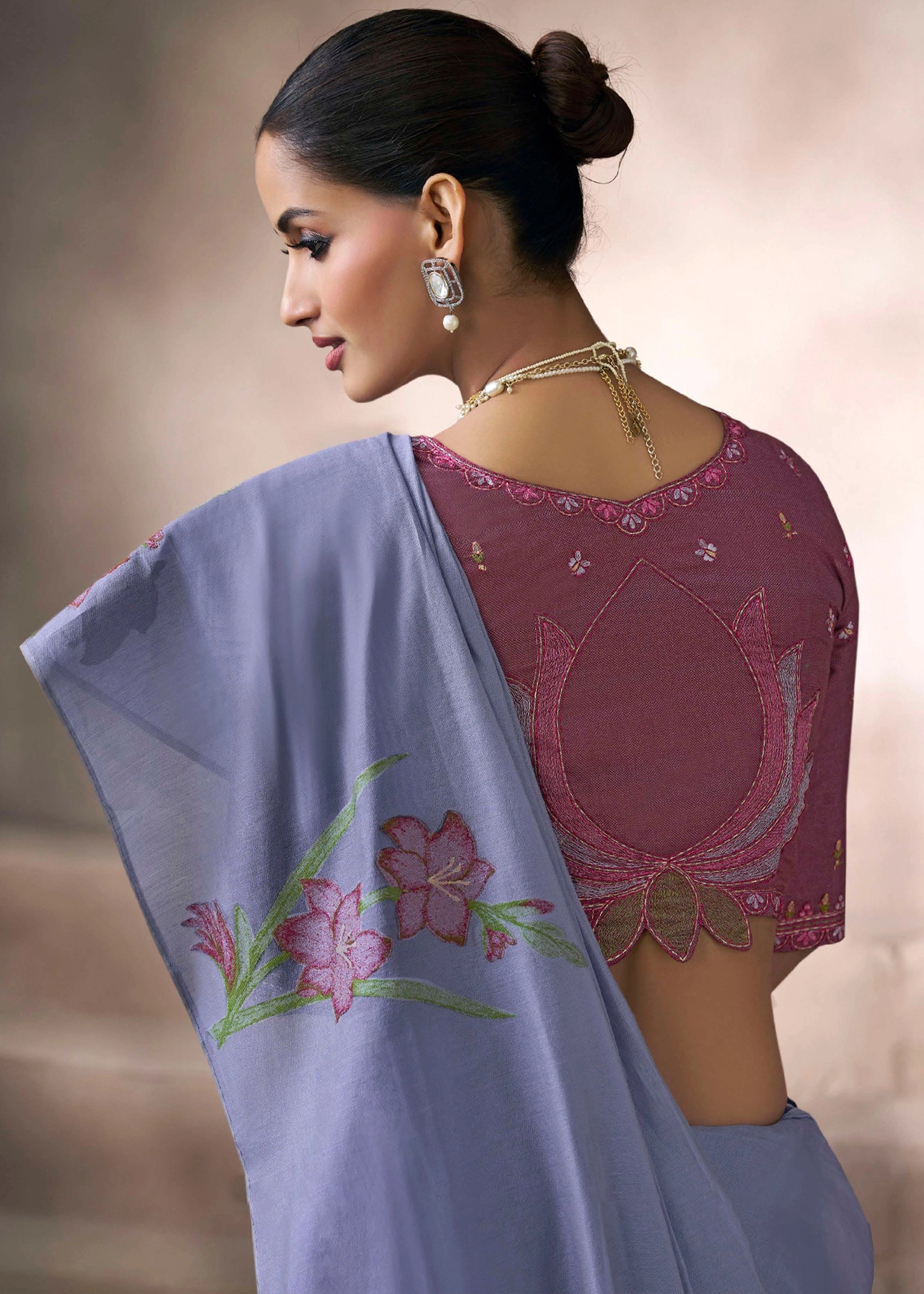 This elegant muga cotton saree features an all-over floral weaving pattern inspired by traditional Pichwai art. The soft, breathable fabric ensures comfort for any occasion, from casual wear to festive events. It comes with a contrasting blouse piece, perfect for a complete, sophisticated look.