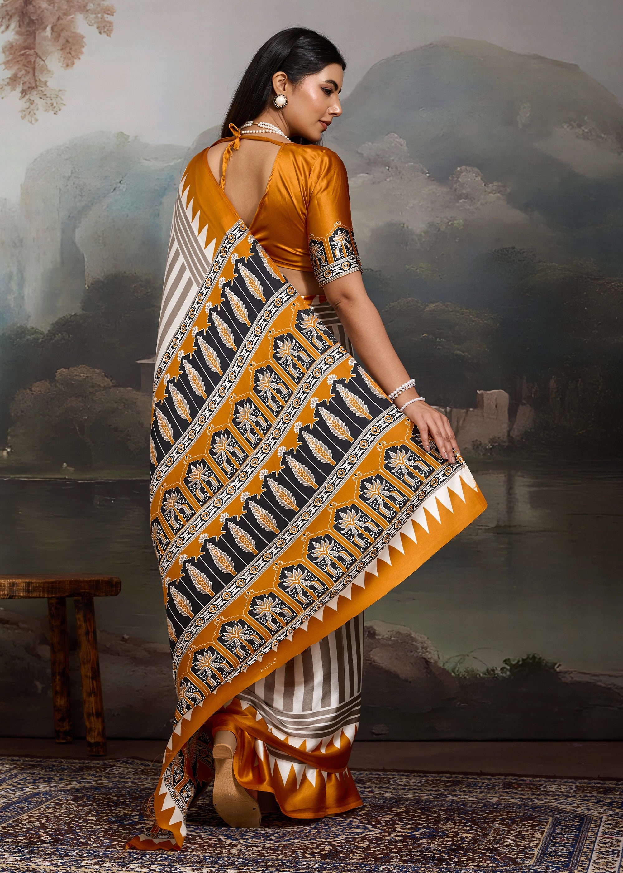 Make a lasting impression with our stunning Black Satin Silk Saree. Its sleek, opulent fabric provides a sophisticated base for the captivating Ajrakh printed pallu and blouse, infusing traditional charm into a modern design. Whether it's a festive gathering, a formal event, or a special evening out, this saree is designed to make you feel effortlessly elegant and uniquely beautiful.