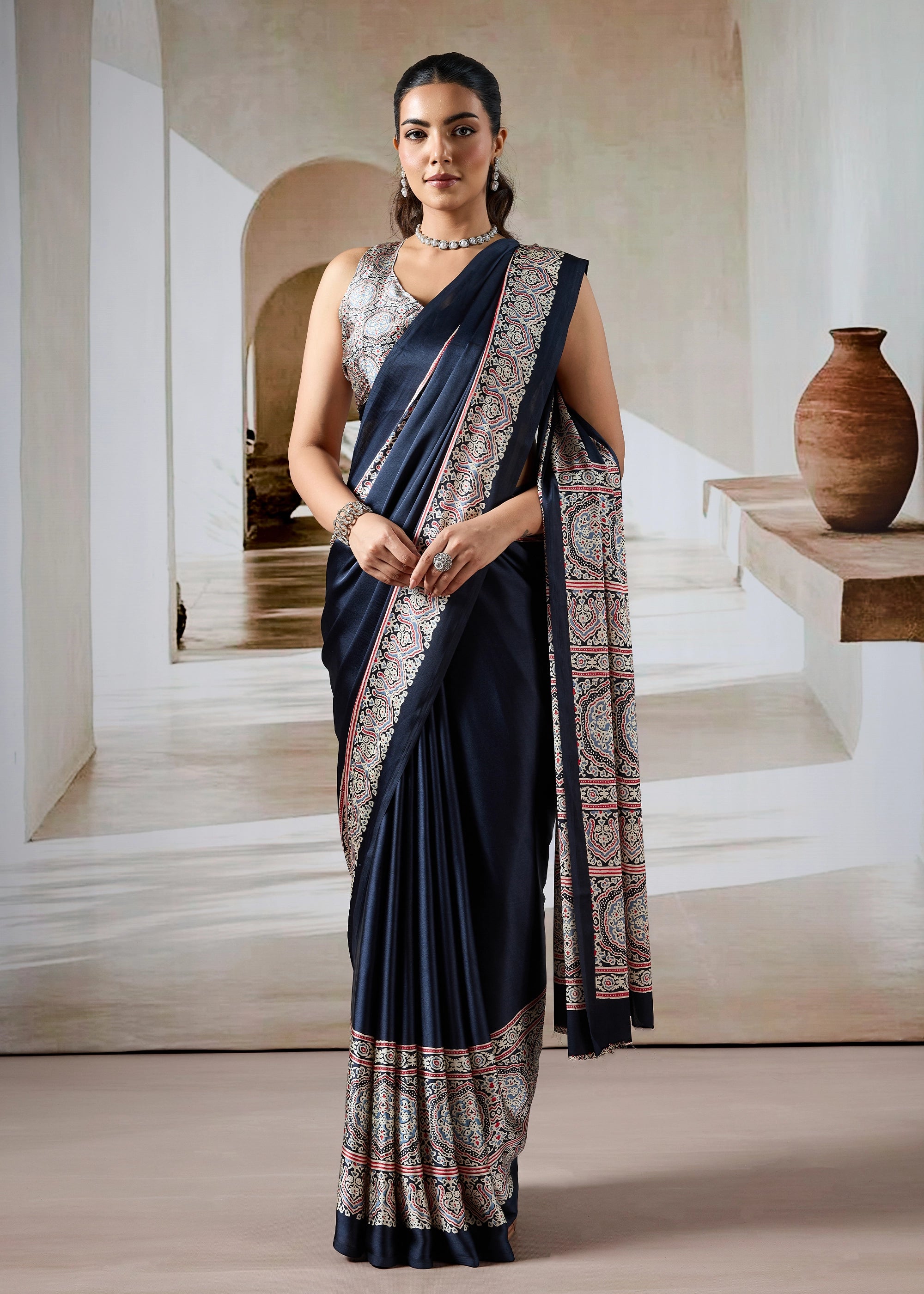 A classic new age addition to your wardrobe which will never go out of style. Presenting to you a stunning and chic printed satin crepe sarees that represents sheer elegance. These six yards of happiness is curated with supreme softness and comfort for you.