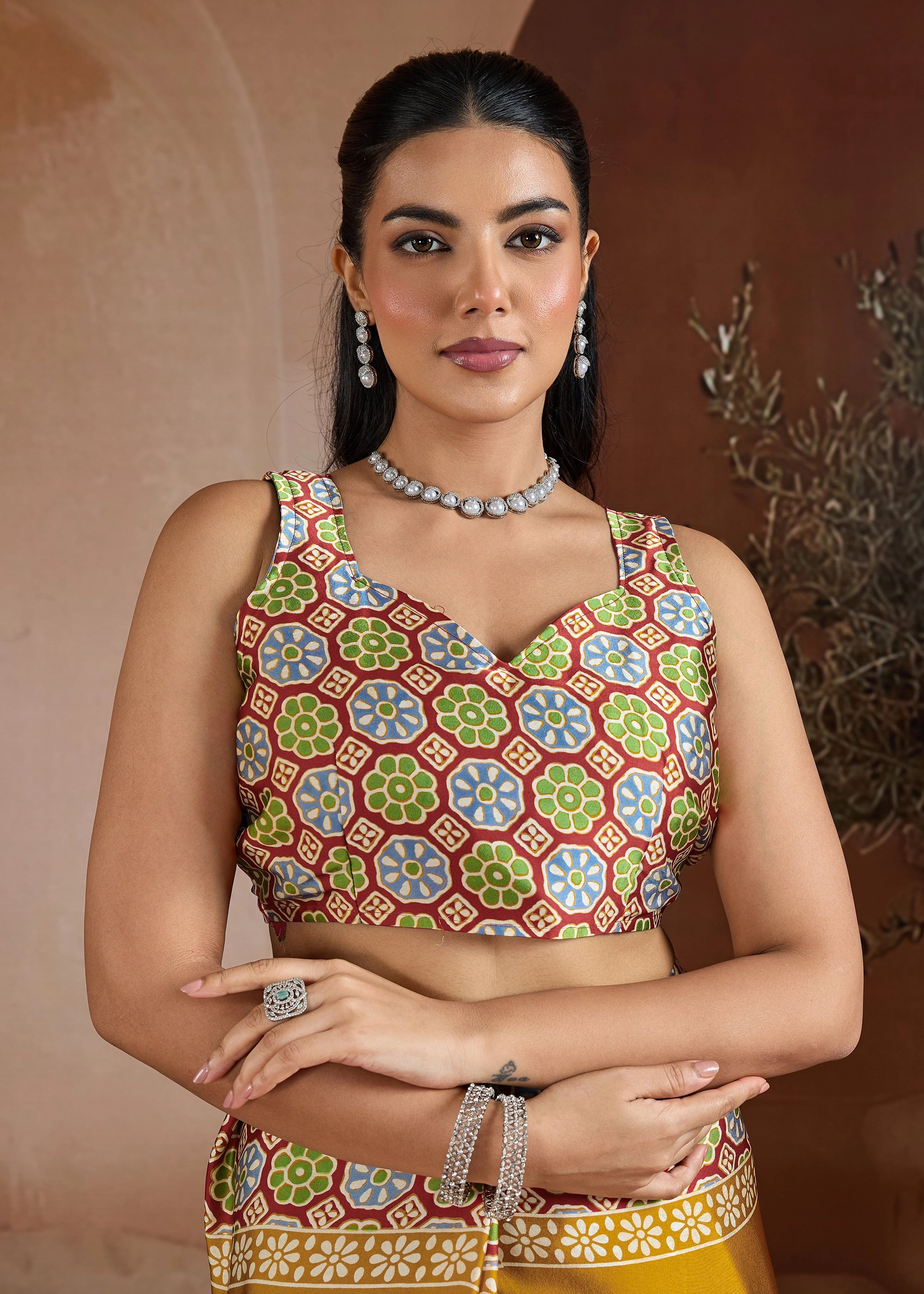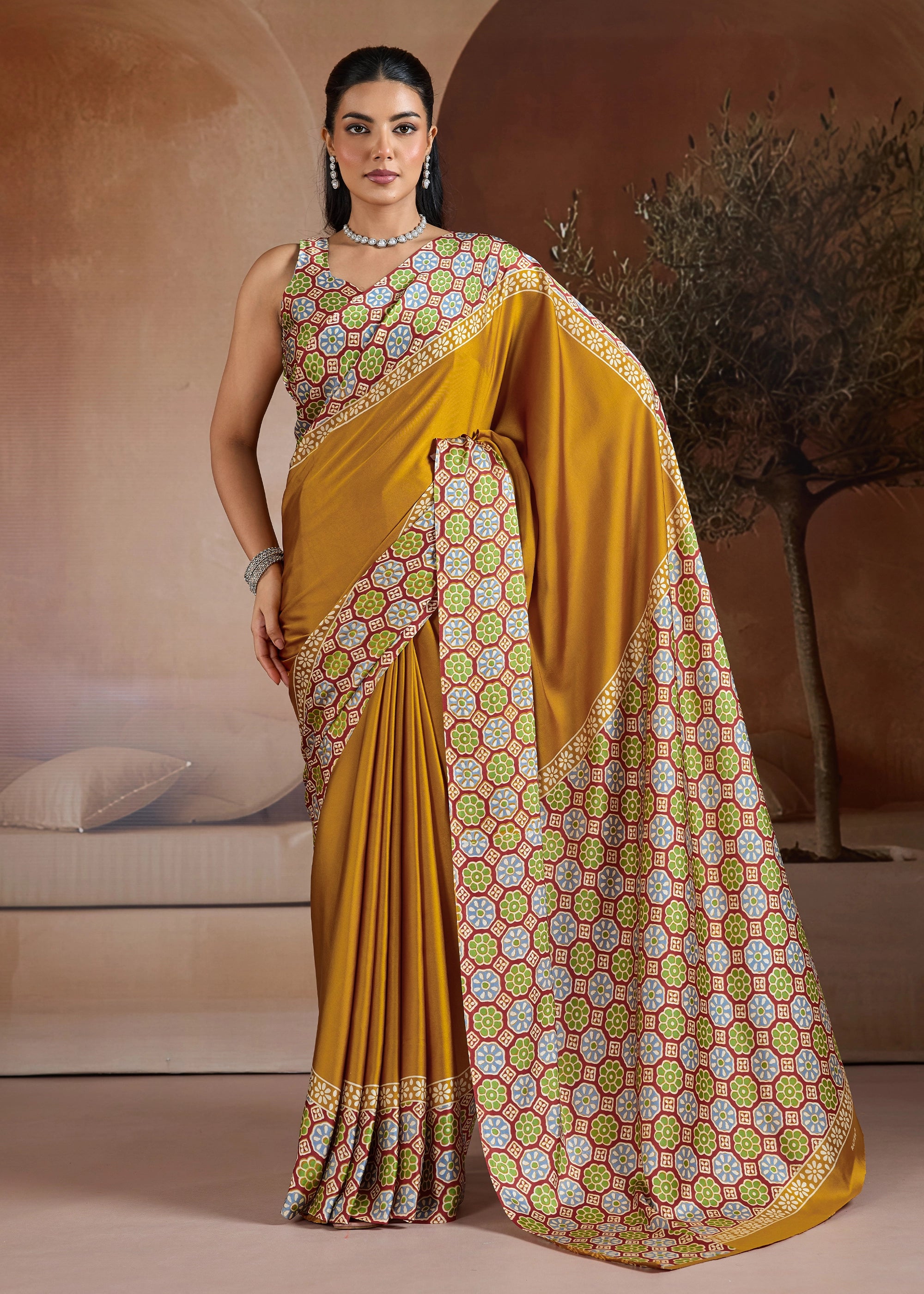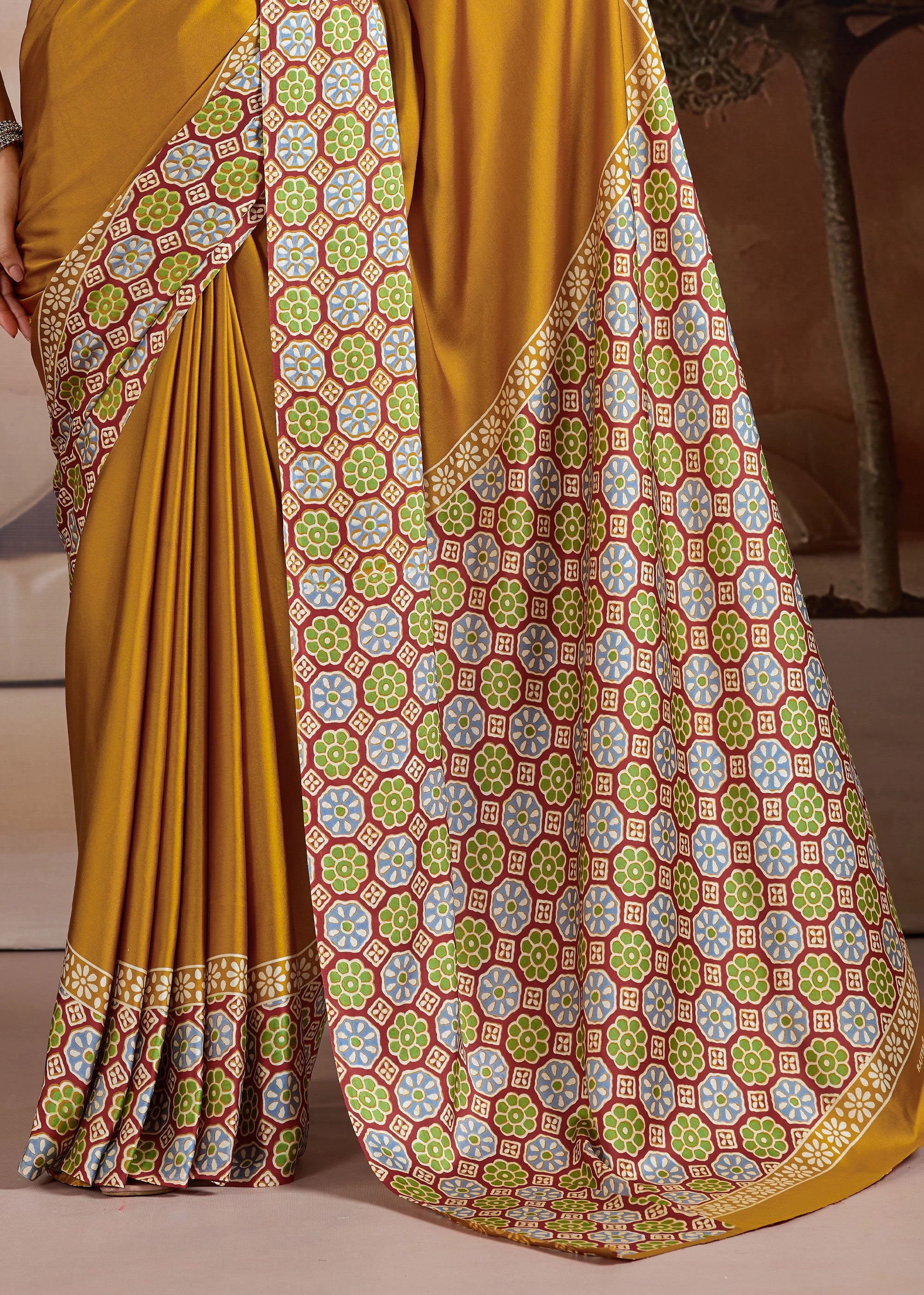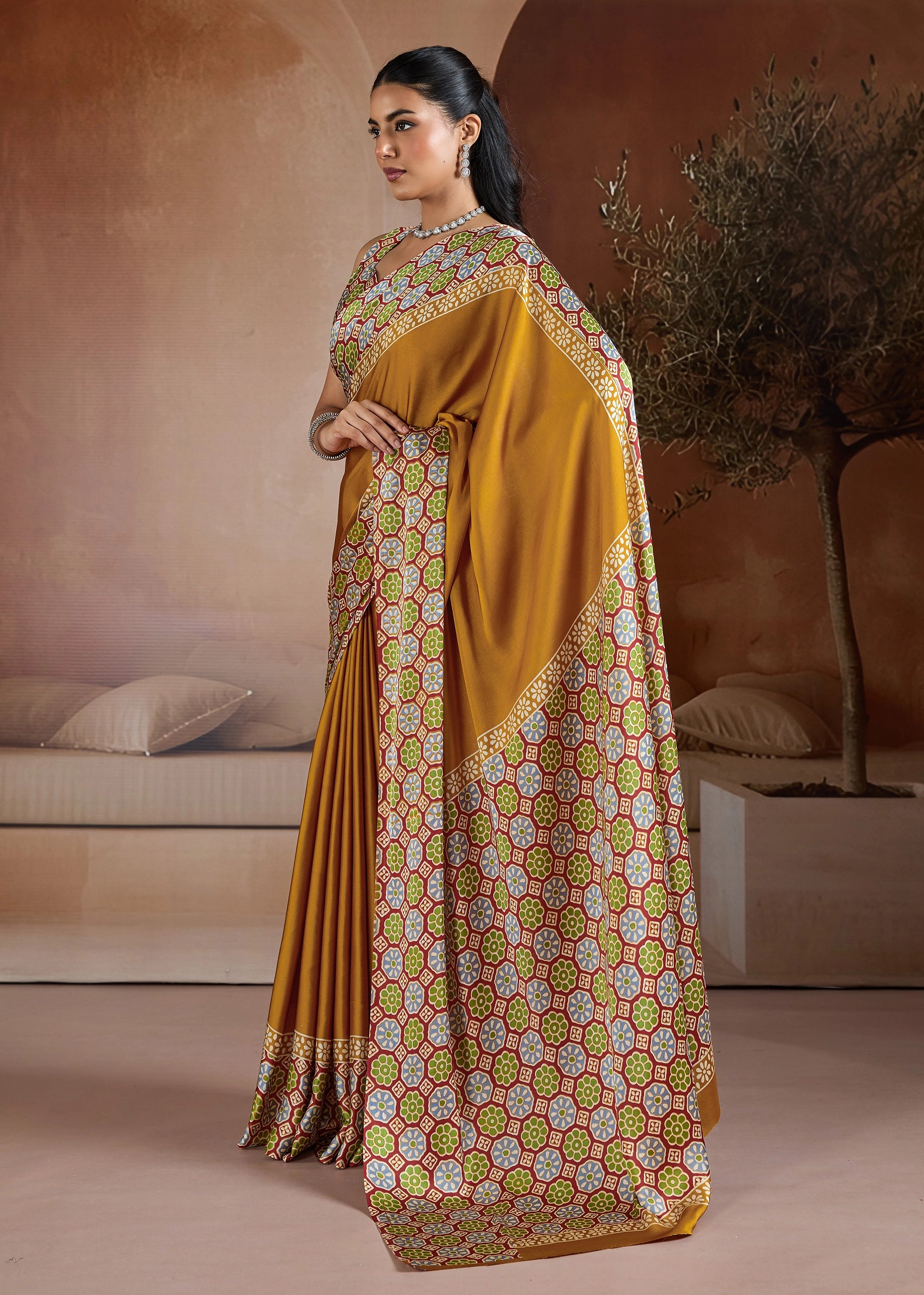 Make a lasting impression with our stunning Satin Silk Saree. Its sleek, opulent fabric provides a sophisticated base for the captivating Ajrakh printed pallu and blouse, infusing traditional charm into a modern design. Whether it's a festive gathering, a formal event, or a special evening out, this saree is designed to make you feel effortlessly elegant and uniquely beautiful.