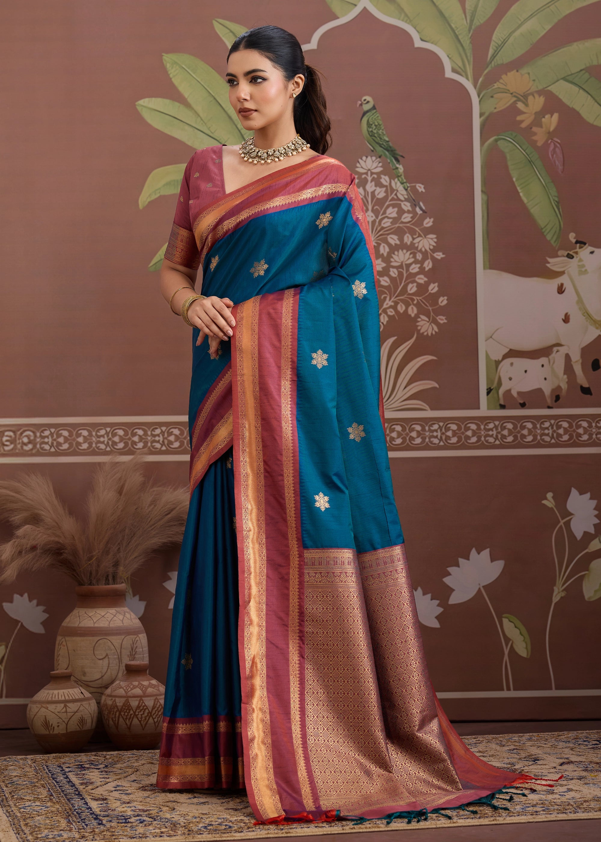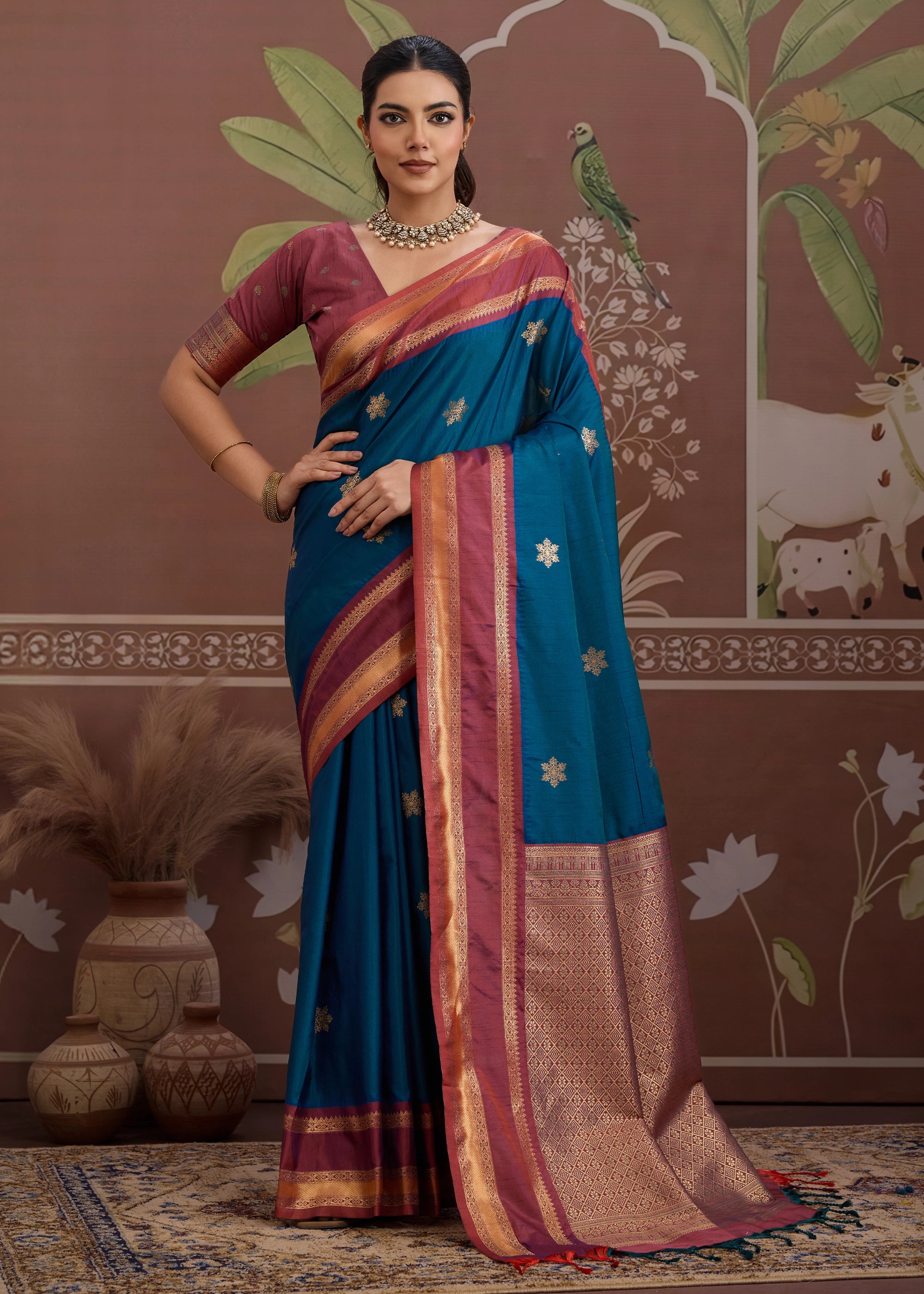 Nautical Blue Woven Banarasi Tussar Silk Saree