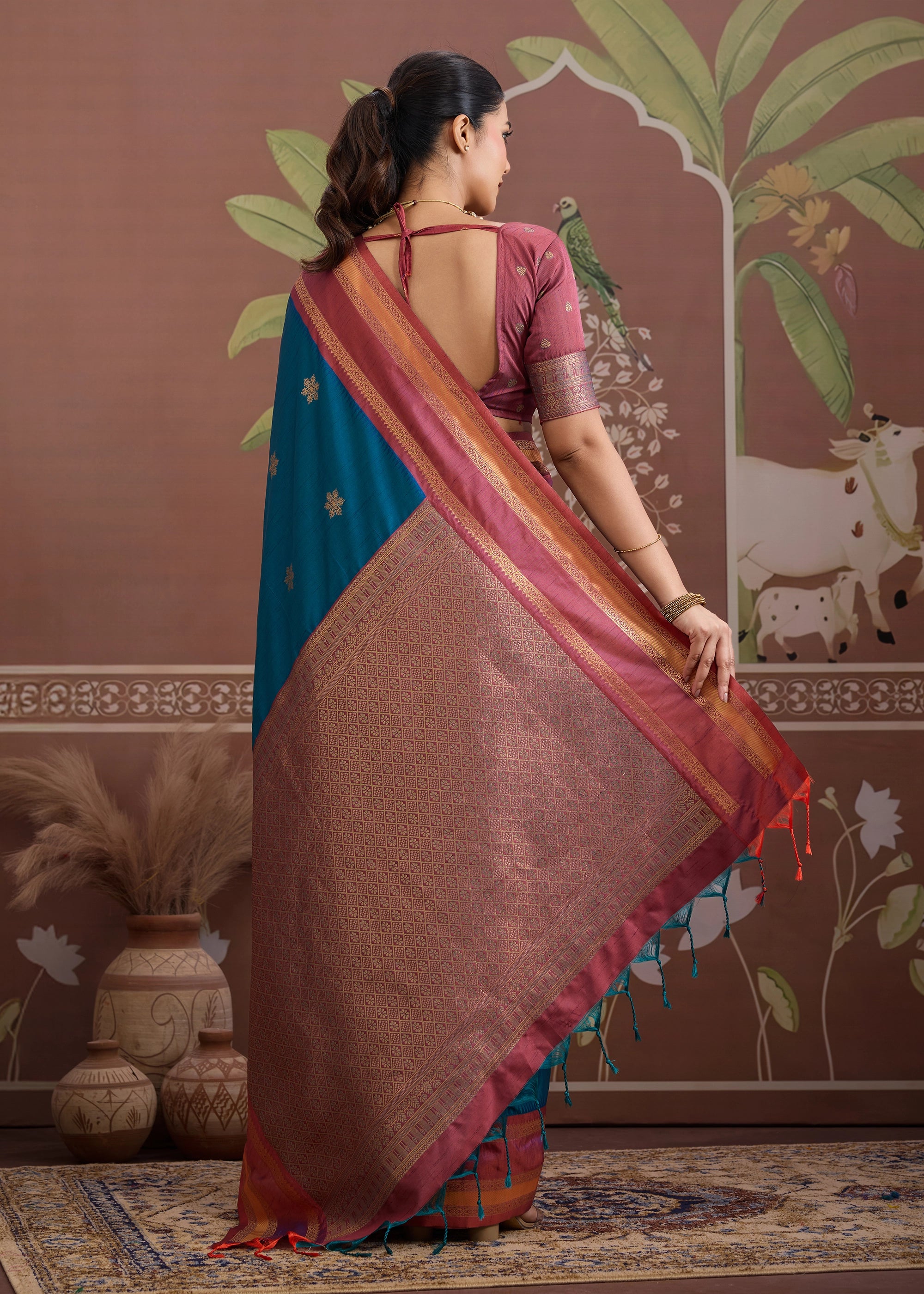 Discover the understated luxury of tradition with this exquisite Tussar Silk Saree, celebrated for its natural texture and rich golden sheen. Woven from pure tussar silk threads, this saree embodies earthy elegance and timeless craftsmanship.