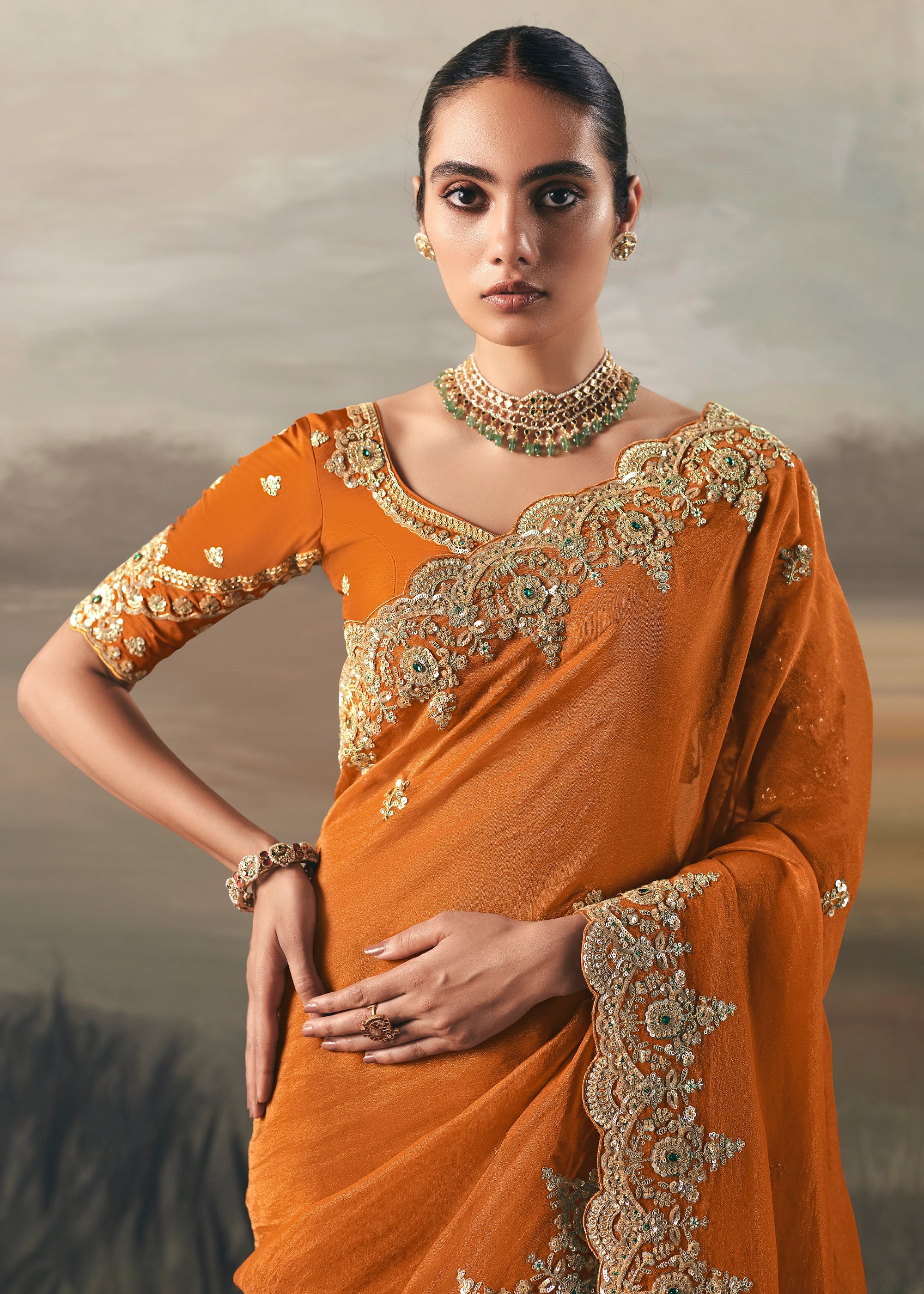 Experience unmatched opulence in this Tissue Zari Saree. Featuring detailed Resham embroidery, floral motifs, and a rich medley of pearls, sequins, Cut-Dana, and hand-finished stonework, it’s a statement of luxury.