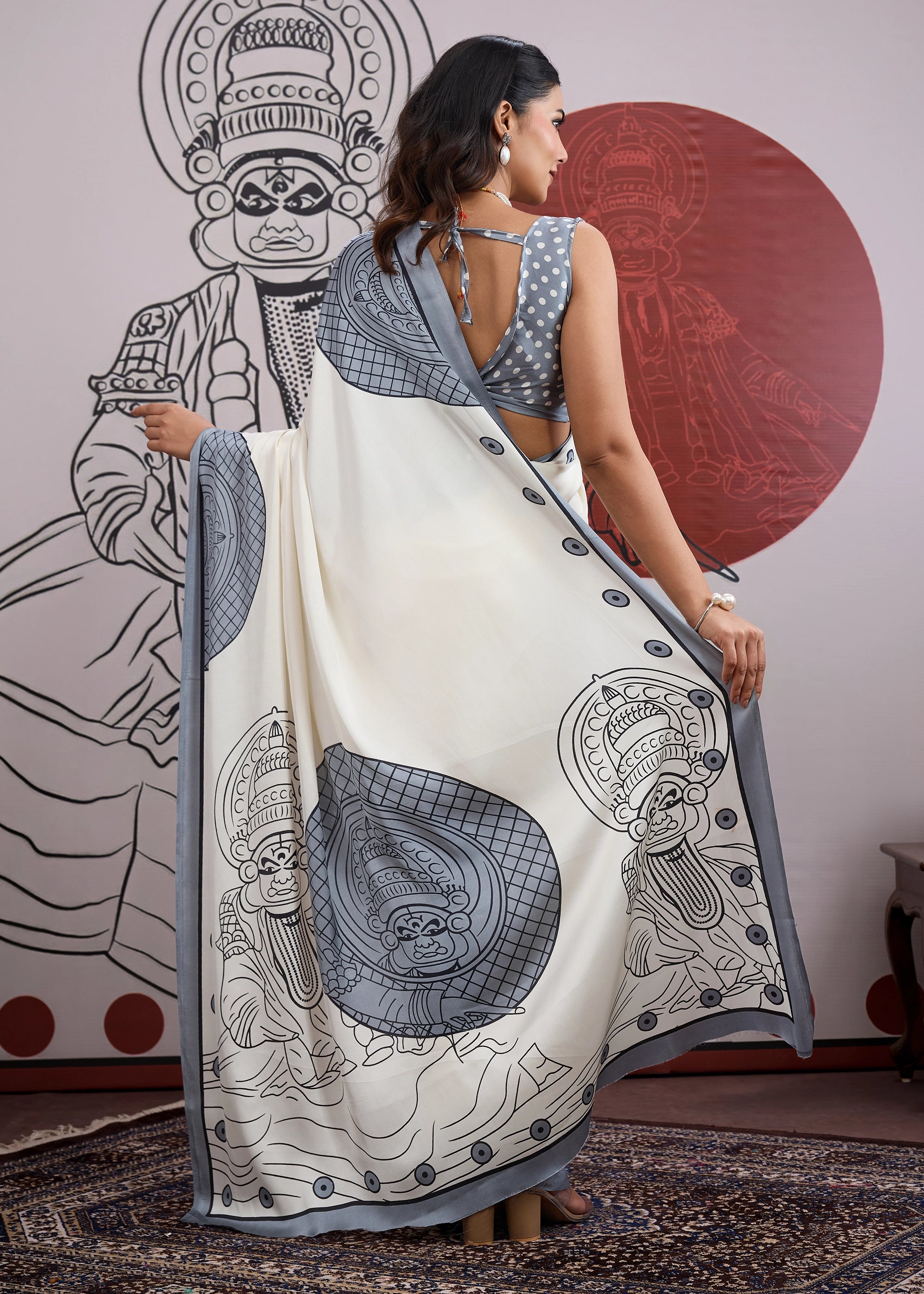 Powder Grey Printed Satin Silk Saree
