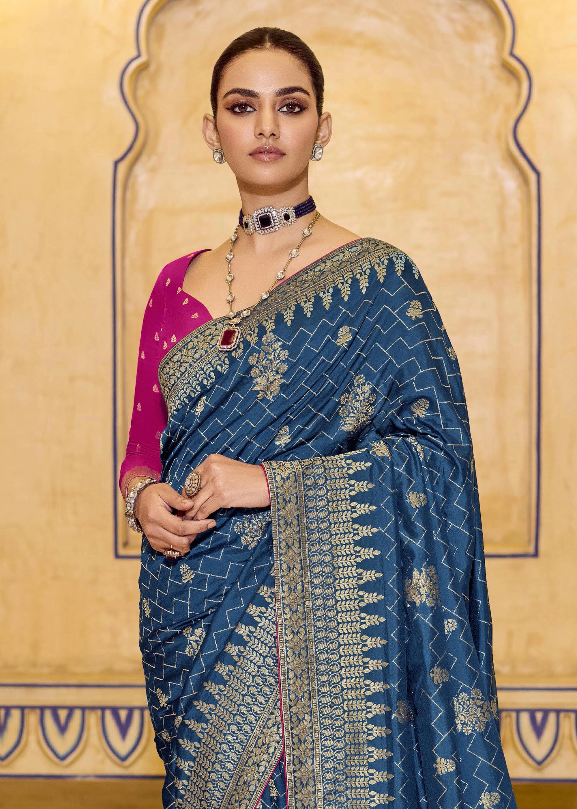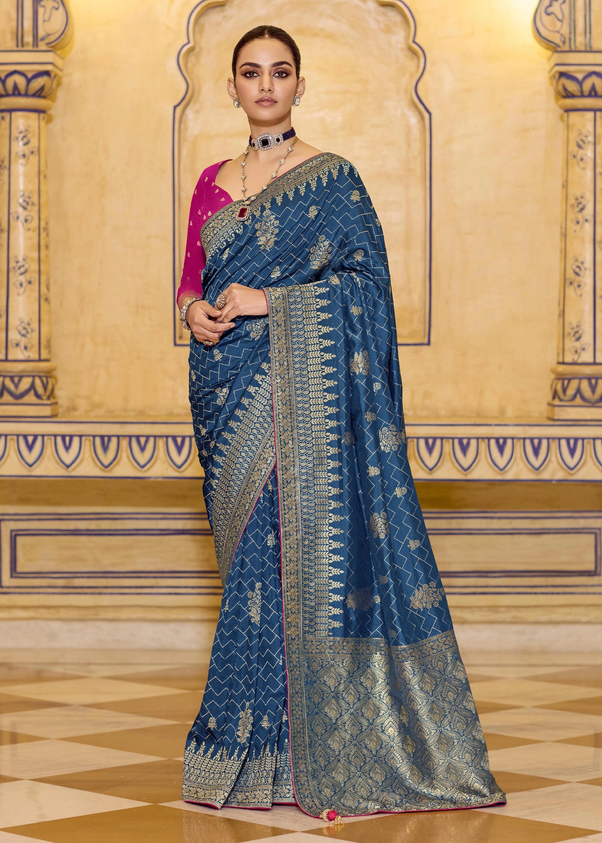 This silk saree shimmers with regal splendor. Its opulent silk threads create a rich texture and a captivating sheen.  Intricate zari work, often in gold or silver, intricately weaves traditional motifs like paisleys, florals, and geometric patterns across the fabric.