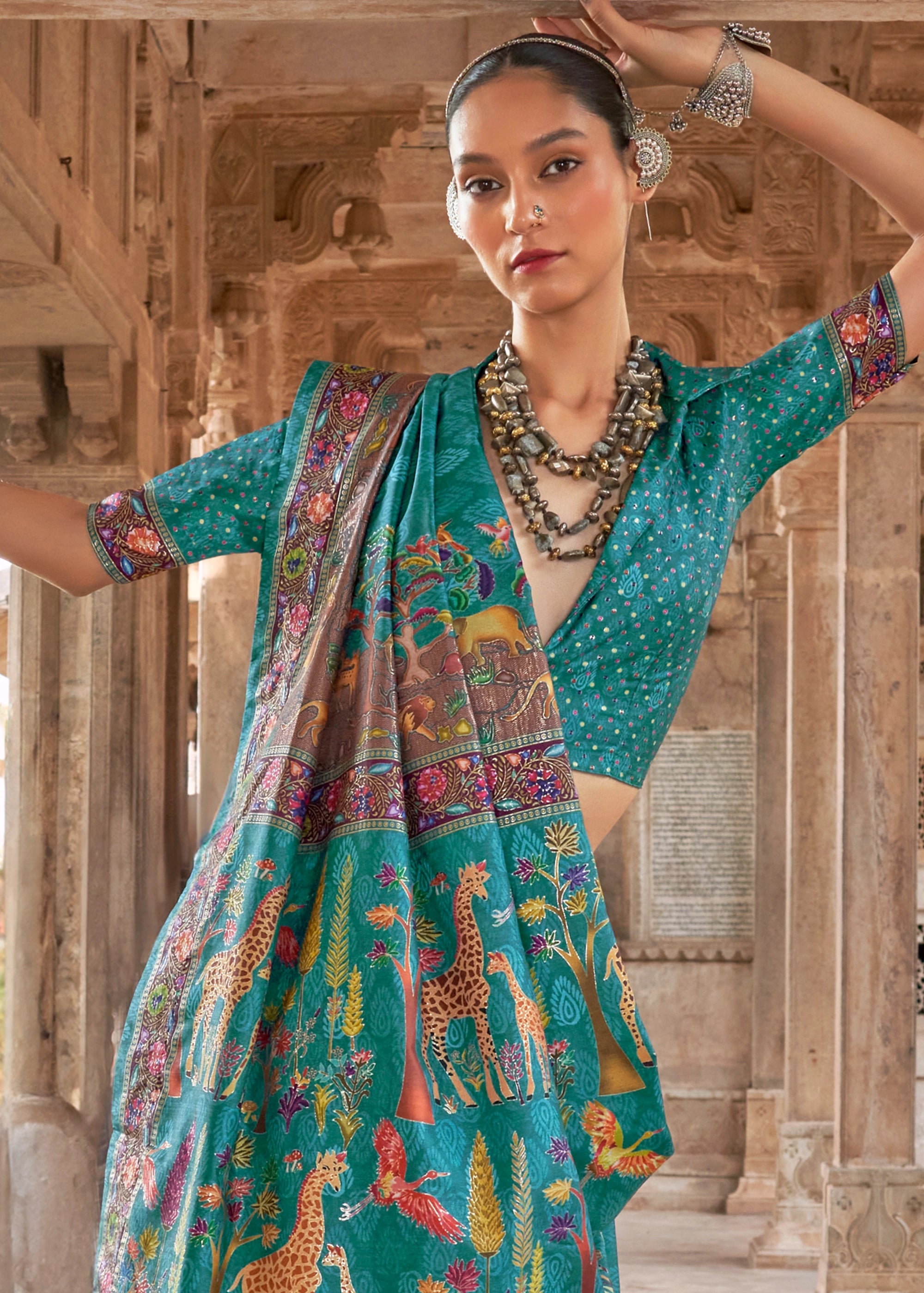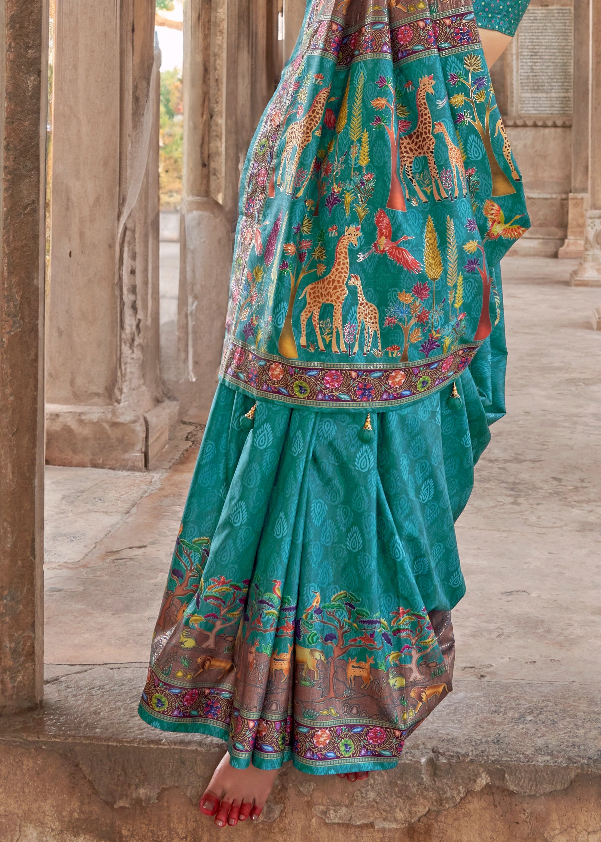 This elegant art silk saree drapes with effortless grace.Enhanced with a vibrant digital print border and dangles, it is paired with a unstitched blouse piece, making it perfect for festive gatherings and traditional occasions.