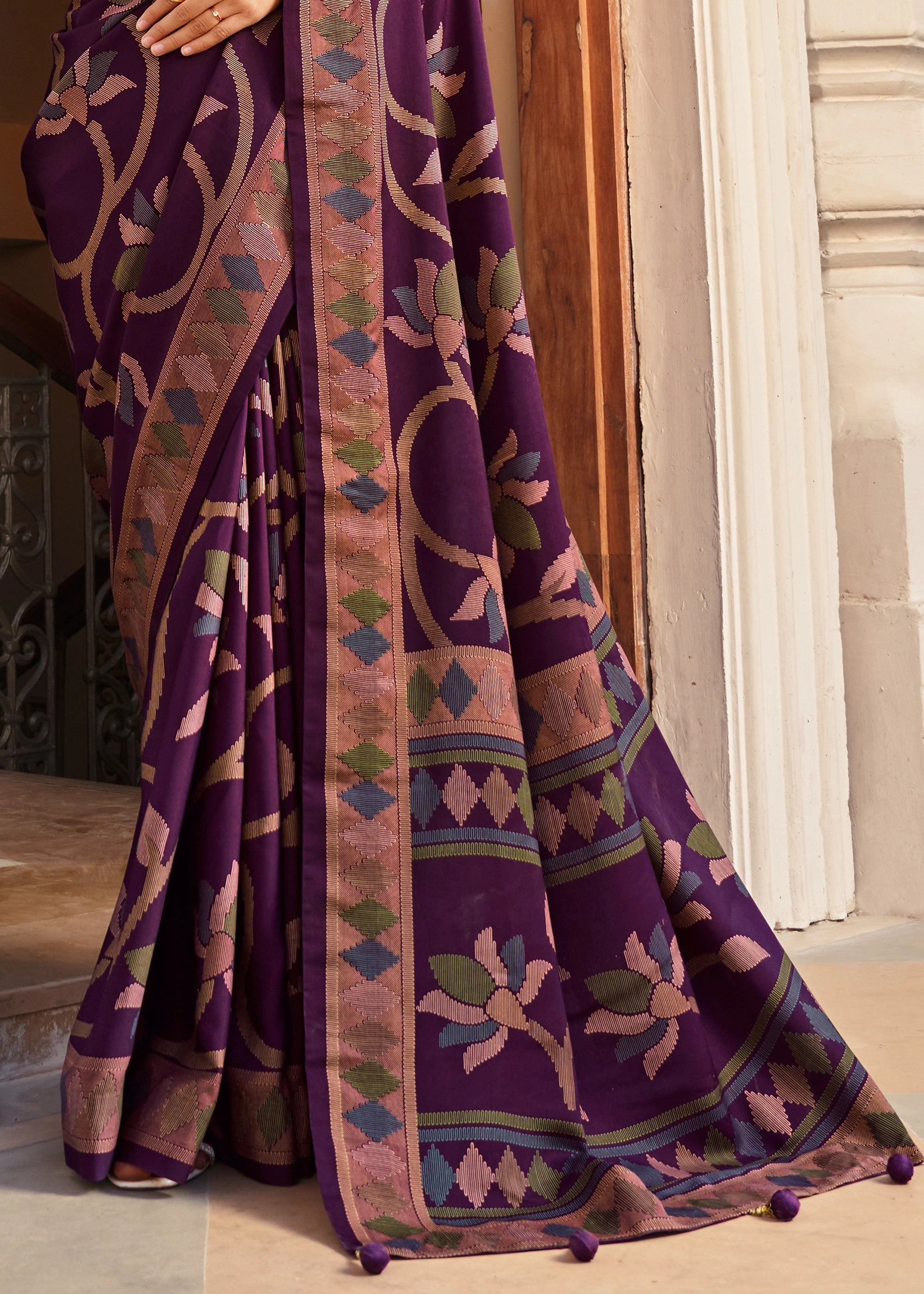 Bring an exotic flair to your attire with this beautiful soft silk handloom saree drape, exclusively designed and curated with smooth flow, and embroidered on palla! Wear it like you want and glam your pujo or anytime occasion look.