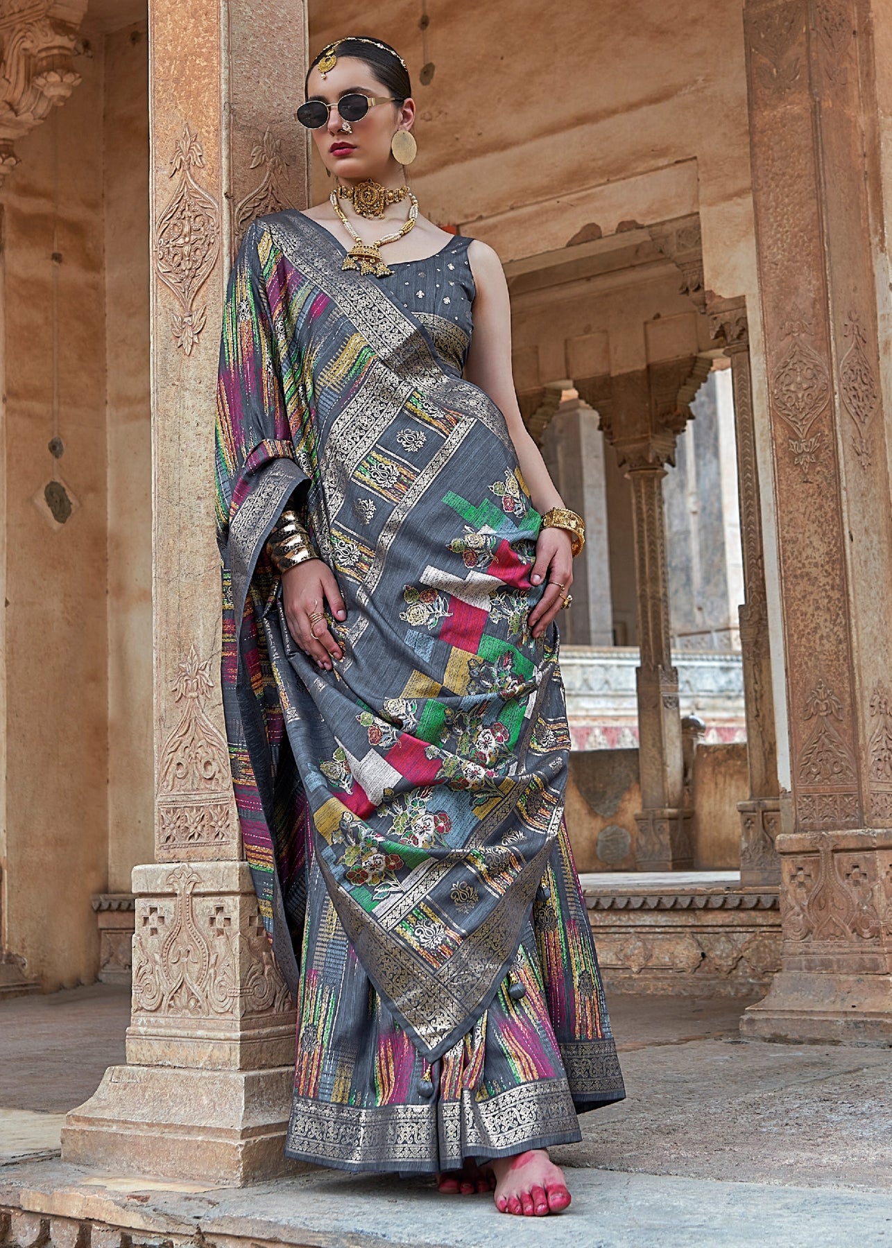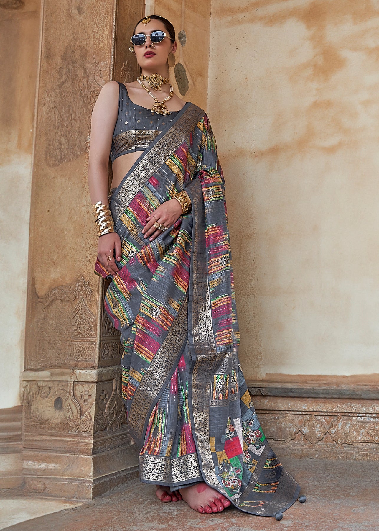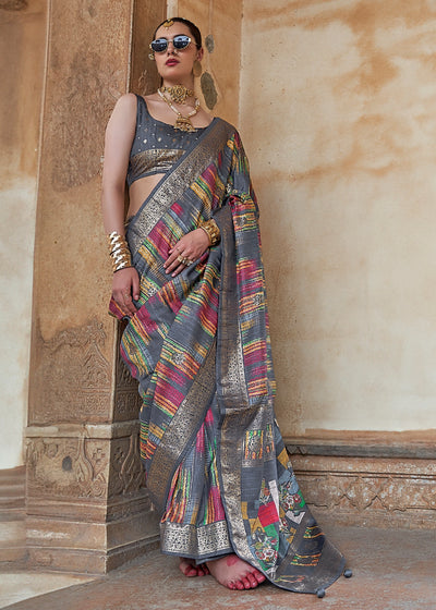 Silver Grey Digital Printed Silk Saree