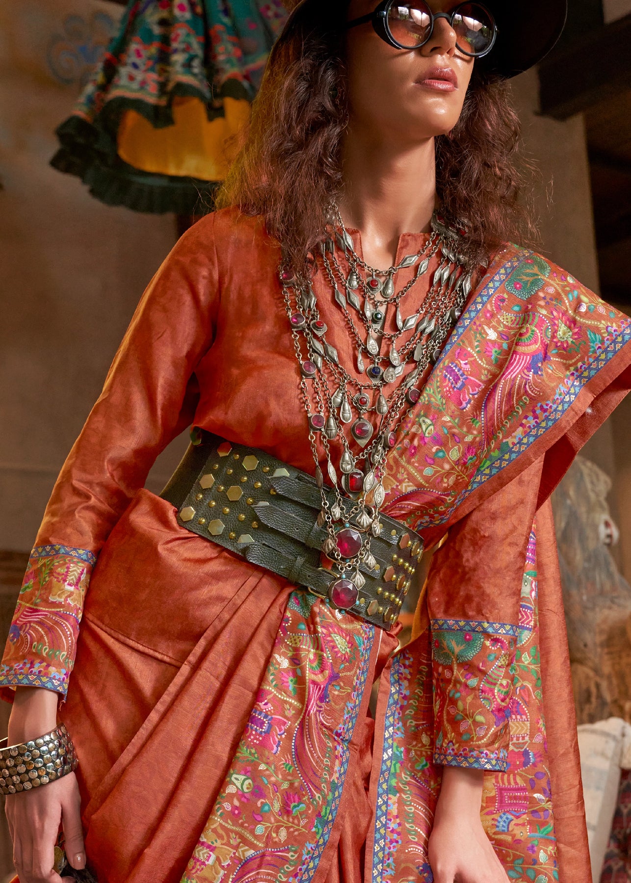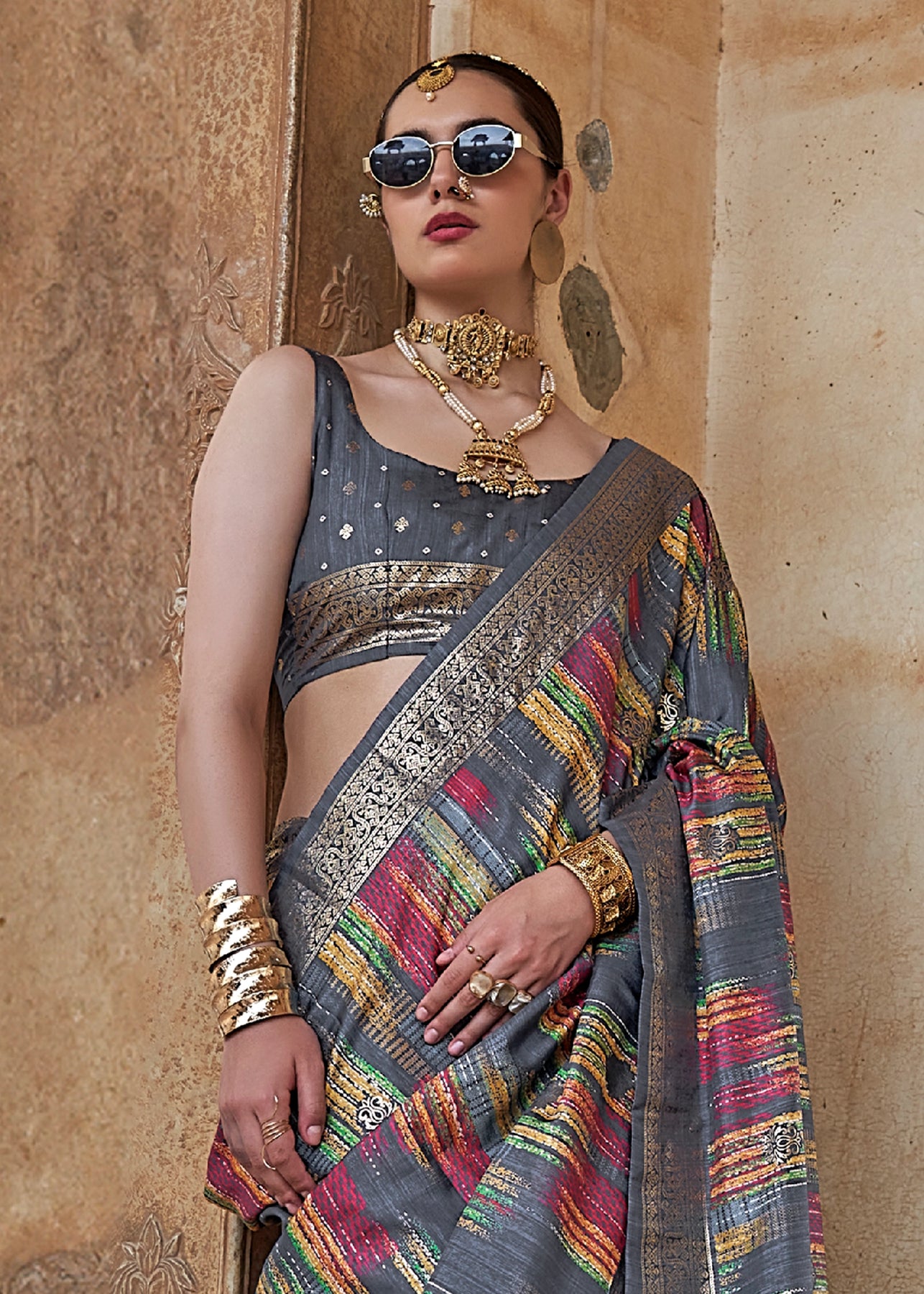 APrinted Patola Silk Sareebeautifully blends the grandeur of silk with the intricate artistry of Patola-inspired motifs. Crafted with luxurious silk fabric, it showcases vibrant geometric and ethnic patterns that echo the timeless heritage of Gujarat’s weaving tradition. The digital or screen-printed designs offer a modern twist while retaining the elegance of traditional Patola style. Lightweight, lustrous, and easy to drape, it is perfect for festive occasions, weddings, and cultural celebrations.