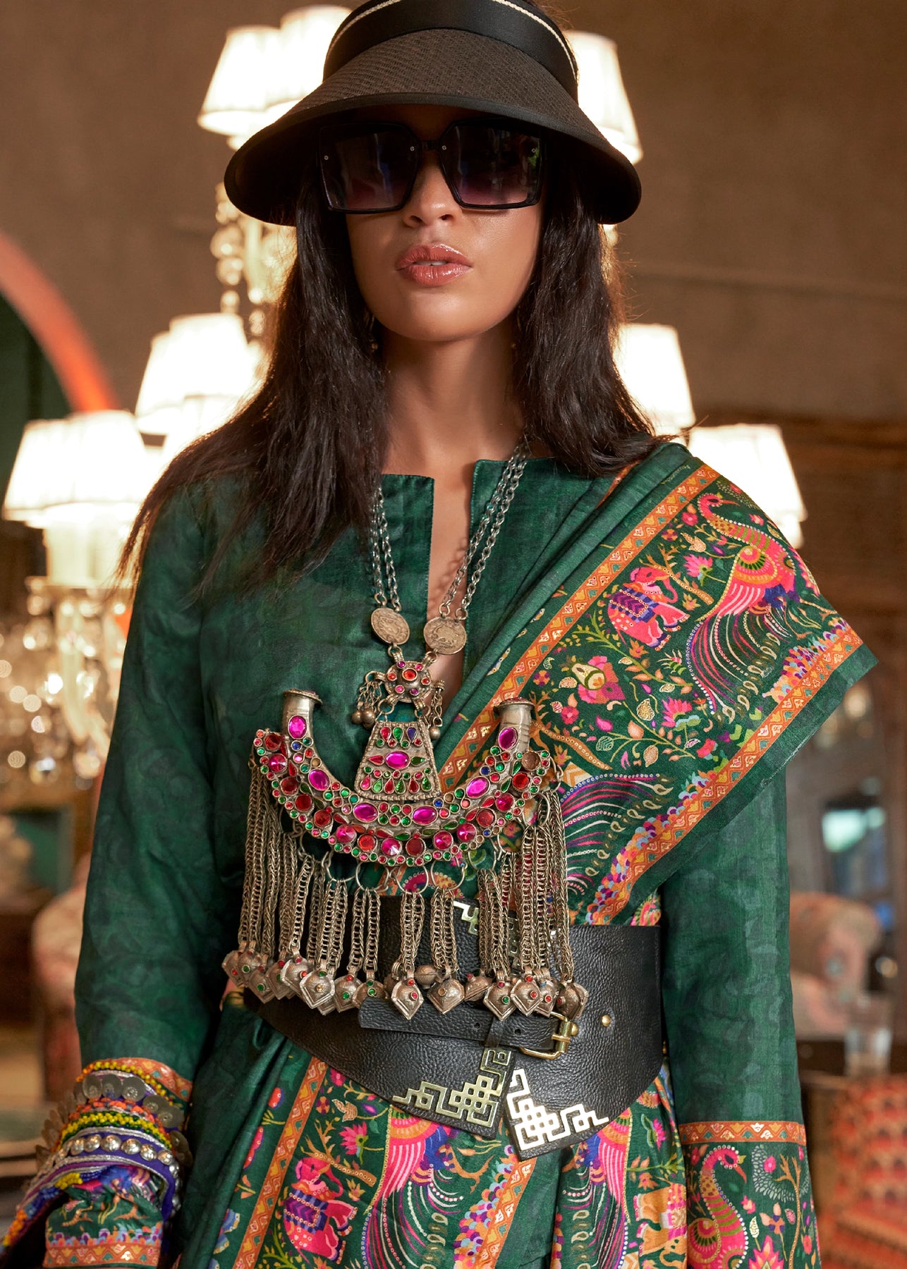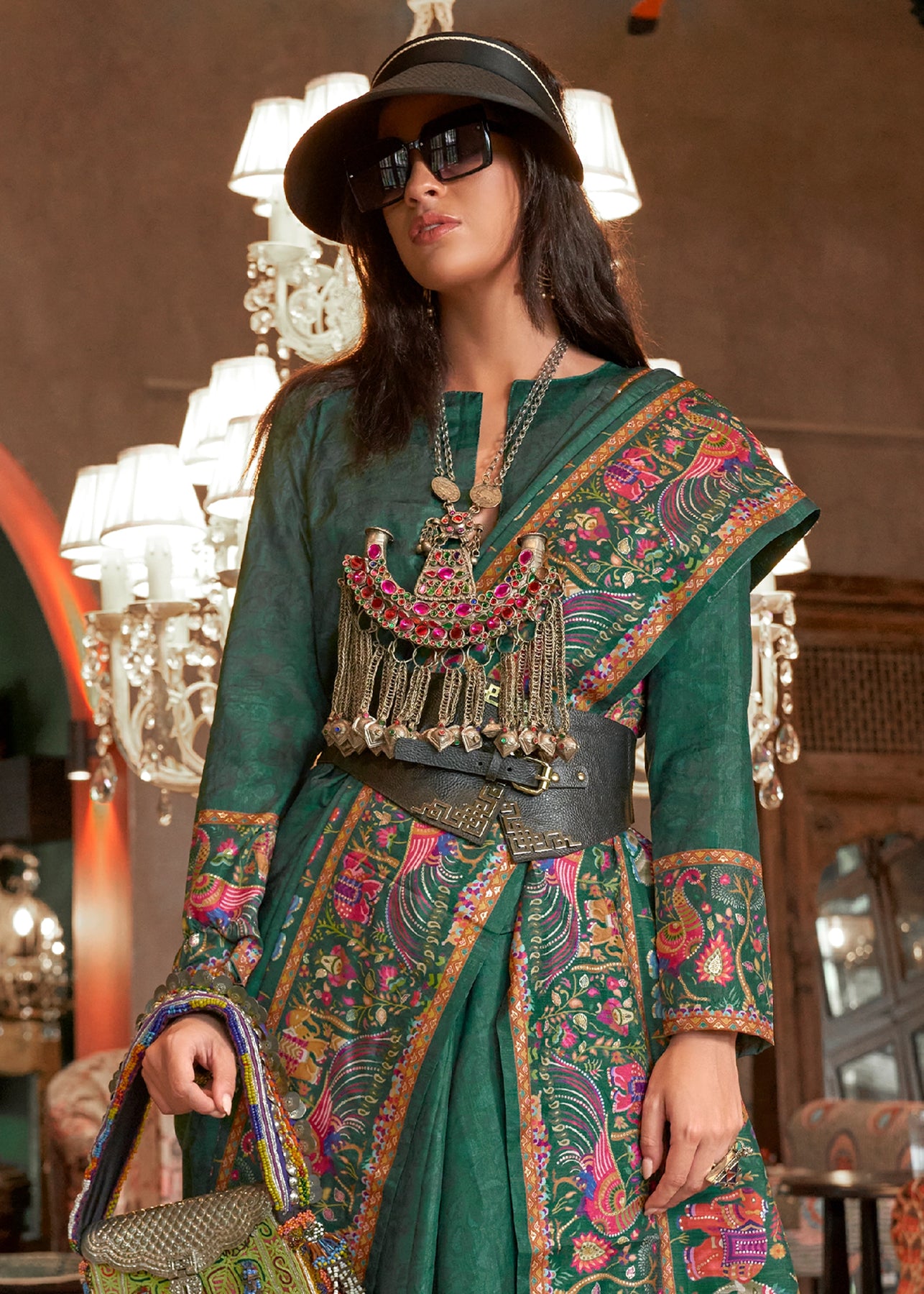 Forest Green Madhubani Printed Saree