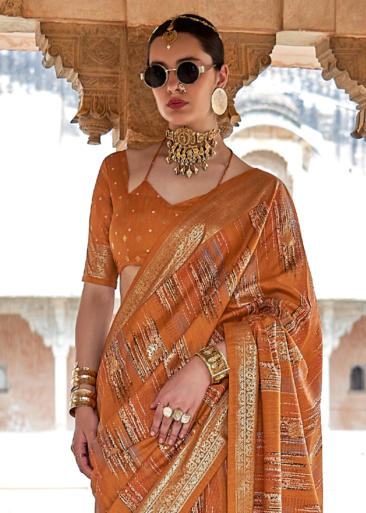 Dusky Orange Printed Georgette Silk Saree
