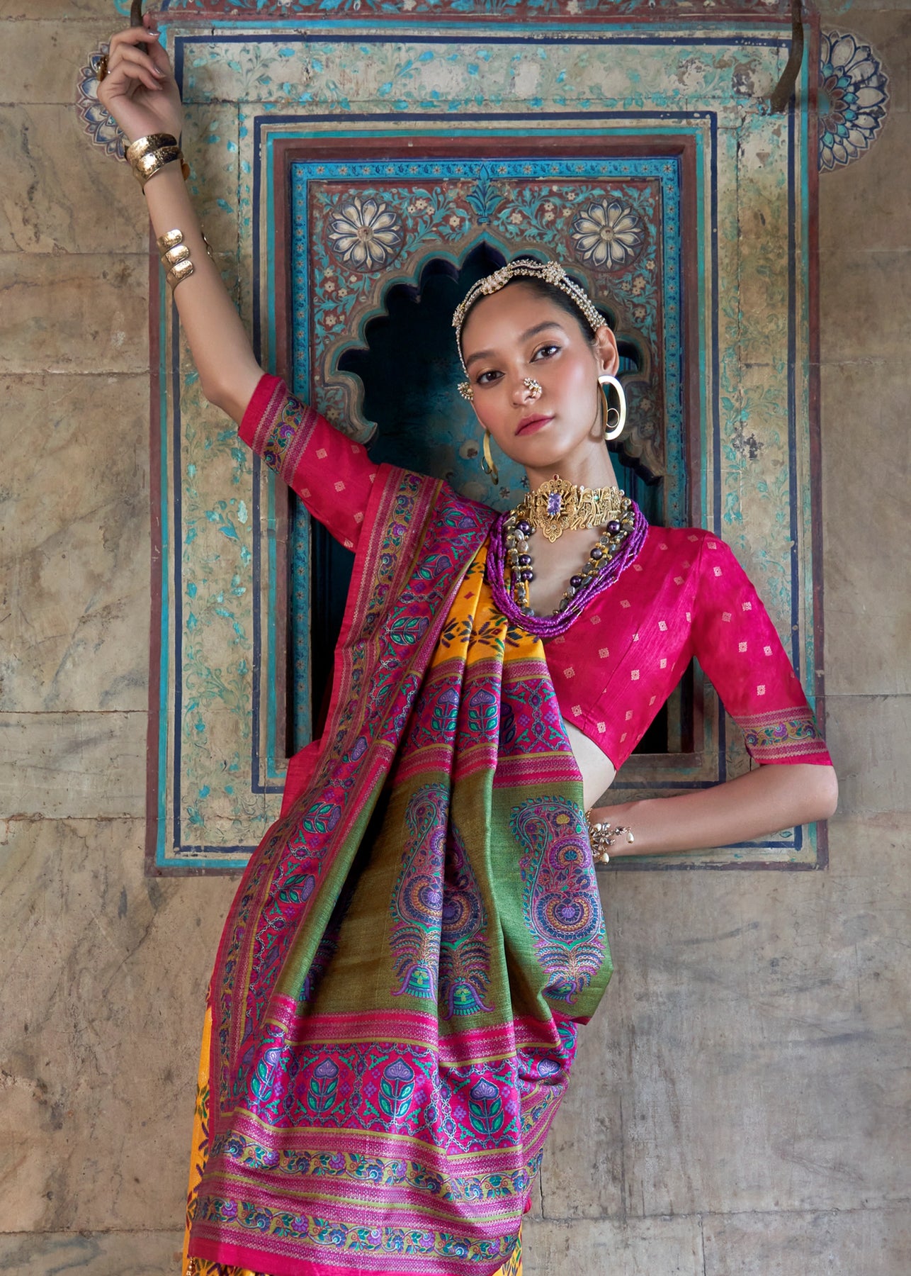 This stunning georgette saree features a vibrant mustard yellow and rani pink shade with traditional bandhej patterns.It is elegantly embellished with intricate resham, sequins, and cutdana work, perfect for weddings or festive occasions.