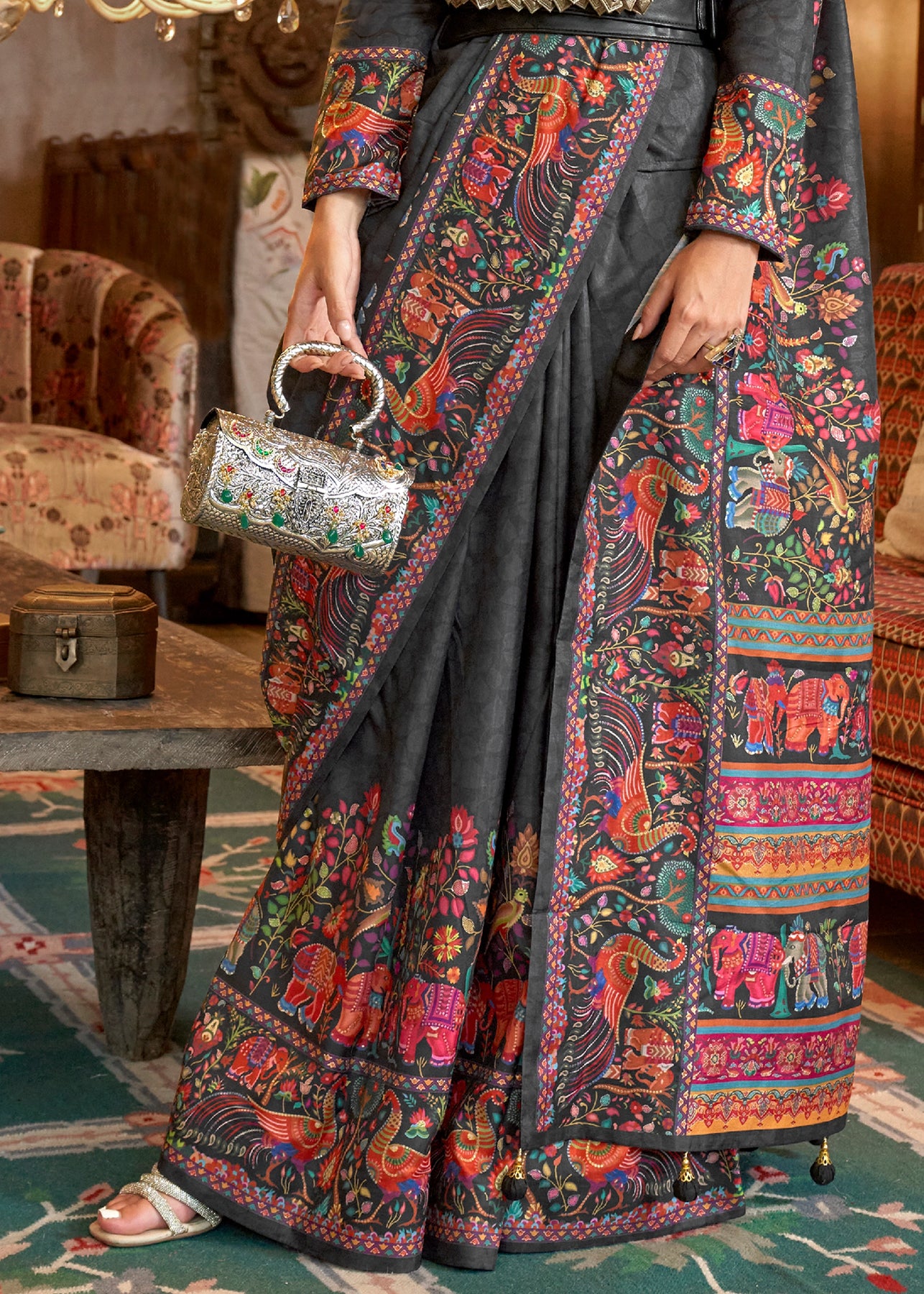 Jet Black Printed Patola Silk Saree